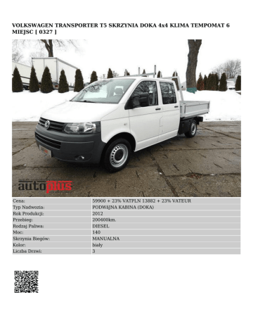 VOLKSWAGEN TRANSPORTER T5 SKRZYNIA DOKA 4x4 KLIMA TEMPOMAT 6 MIEJSC [ 0327 ] Cena: Typ Nadwozia: Rok Produkcji: Przebieg: Rodzaj Paliwa: Moc: Skrzynia Biegów: Kolor: Liczba Drzwi: 59900 + 23% VATPLN 13882 + 23% VATEUR PODWãJNA KABINA (DOKA) 2012 200400km. DIESEL 140 MANUALNA biały 3 INFORMACJE DODATKOWE ● ● ● ● bezwypadkowy sprowadzony zarejestrowany w polsce stan bardzo dobry WYPOSAŻENIE ● ● ● ● ● ● ● ● ● ● ABS centralny zamek elektryczne lusterka immobiliser klimatyzacja kontrola trakcji radio / cd tempomat wspomaganie kierownicy elektryczne szyby OPIS NUMER OFERTY- 0327 Volkswagen Transporter T5 4MOTION 4X4, skrzynia doka, 6 miejsc. Rok produkcji 2012 kolor biały. Auto bezwypadkowe w bardzo dobrym stanie technicznym. Kupione w Niemczech. Wnętrze czyste i przestronne. Auto jest sprawne w 100%. Powłoka lakiernicza w bardzo dobrym stanie. Idealna praca silnika, skrzyni biegów i zawieszenia. Auto wyposażone w silnik 2.0 TDI o mocy 140 KM. Napęd 4x4 znakomicie się sprawdza w trudnym terenie. Wyposażenie: - ABS, ASR - napęd 4x4 - poduszka powietrzna kierowcy i pasażera - klimatyzacja - tempomat - elektryczne szyby - elektrycznie sterowane i podgrzewane lusterka - wspomaganie kierownicy - regulacja kierownicy - immobiliser - radio CD - 6 miejsc - 6 biegów - hak - wymiary powierzchni ładunkowej: długość / 217 cm / szerokość / 193 cm / -Podana cena jest CENĄ NETTO!!. Wystawiamy Fakturę VAT. -MOŻLIWOŚĆ KREDYTOWANIA LUB LEASINGOWANIA, 100% WARTOŚCI AUTA, PROCEDURA UPROSZCZONA, WYMAGANE DOKUMENTY NIP, REGON, WPIS DO EWIDENCJI, DOWÓD OSOBISTY. -WIĘCEJ INFORMACJI NA STRONIE WWW.AUTO-PLUS.COM.PL -NINIEJSZE OGŁOSZENIE JEST WYŁĄCZNIE INFORMACJĄ HANDLOWĄ I NIE STANOWI OFERTY W MYŚL art. 66, § 1. KODEKSU CYWILNEGO. SPRZEDAJĄCY NIE ODPOWIADA ZA EWENTUALNE BŁĘDY LUB NIEAKTUALNOŚĆ OGŁOSZENIA.