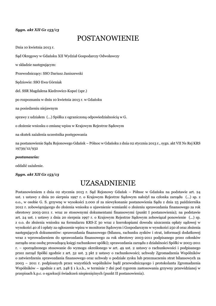 Sygn. akt XII Gz 153/13 POSTANOWIENIE Dnia 10 kwietnia 2013 r. Sąd Okręgowy w Gdańsku XII Wydział Gospodarczy Odwoławczy w składzie następującym: Przewodniczący: SSO Dariusz Janiszewski Sędziowie: SSO Ewa Górniak del. SSR Magdalena Kiedrowicz-Kopeć (spr.) po rozpoznaniu w dniu 10 kwietnia 2013 r. w Gdańsku na posiedzeniu niejawnym sprawy z udziałem (...) Spółka z ograniczoną odpowiedzialnością w G. o złożenie wniosku o zmianę wpisu w Krajowym Rejestrze Sądowym na skutek zażalenia uczestnika postępowania na postanowienie Sądu Rejonowego Gdańsk – Północ w Gdańsku z dnia 02 stycznia 2013 r., sygn. akt VII Ns Rej KRS 19739/12/932 postanawia: oddalić zażalenie. Sygn. akt XII Gz 153/13 UZASADNIENIE Postanowieniem z dnia 02 stycznia 2013 r. Sąd Rejonowy Gdańsk – Północ w Gdańsku na podstawie art. 24 ust. 1 ustawy z dnia 20 sierpnia 1997 r. o Krajowym Rejestrze Sądowym nałożył na członka zarządu (...) sp. z o.o., w osobie G. S. grzywnę w wysokości 2.000 zł za niewykonanie postanowienia Sądu z dnia 25 października 2012 r. zobowiązującego do złożenia wniosku o ujawnienie wzmianki o złożeniu sprawozdania finansowego za rok obrotowy 2003-2011 r. wraz ze stosownymi dokumentami finansowymi (punkt I postanowienia); na podstawie art. 24 ust. 1 ustawy z dnia 20 sierpnia 1997 r. o Krajowym Rejestrze Sądowym zobowiązał ponowienie (...) sp. z o.o. do złożenia wniosku na formularzu KRS-Z 30 wraz z kserokopiami dowodu uiszczenia opłaty sądowej w wysokości 40 zł i opłaty za ogłoszenie wpisu w monitorze Sądowym i Gospodarczym w wysokości 250 zł oraz złożenia następujących dokumentów: sprawozdania finansowego (bilansu, rachunku zysków i strat, informacji dodatkowej wraz z wprowadzeniem do sprawozdania finansowego za rok obrotowy 2003-2011 podpisanego przez członków zarządu oraz osobę prowadzącą księgi rachunkowe spółki); sprawozdania zarządu z działalności Spółki w 2003-2011 r. – sporządzonego stosowanie do wymogu określonego w art. 49 ust. 2 ustawy o rachunkowości i podpisanego przez zarząd Spółki zgodnie z art. 52 ust. 3 pkt 2 ustawy o rachunkowości; uchwały Zgromadzenia Wspólników o zatwierdzeniu sprawozdania finansowego oraz uchwały o podziale zysku lub przeznaczeniu strat bilansowych za 2003 – 2011 r. podpisanych przez wszystkich wspólników bądź przewodniczącego i protokolanta Zgromadzenia Wspólników – zgodnie z art. 248 § 1 k.s.h., w terminie 7 dni pod rygorem zastosowania grzywny przewidzianej w przepisach k.p.c. o egzekucji świadczeń niepieniężnych (punkt II postanowienia). W uzasadnieniu Sąd Rejonowy wskazał, że postanowieniem z dnia 25 października 2012 r. spółka została wezwana do złożenia sprawozdania finansowego za 2003 – 2011 r., doręczonym na adres ujawniony w rejestrze KRS dnia 30 października 2012 r., czego nie wykonała. W ocenie Sądu I instancji bez znaczenia pozostawała okoliczność, że spółka nie prowadzi działalności gospodarczej ponieważ zgodnie z przepisami ustawy o rachunkowości, na spółkę z ograniczoną odpowiedzialnością został nałożony obowiązek sporządzania sprawozdań finansowych niezależnie od tego, czy rozpoczęła ona prowadzenie przypisanej jej działalności gospodarczej. Zdaniem Sądu Rejonowego również okoliczność braku zatwierdzenia sprawozdania przez Walne Zgromadzenie Wspólników nie ma wpływu na powstanie i termin tego obowiązku ponieważ zarząd spółki powinien złożyć sprawozdanie finansowe, które nie zostało zatwierdzone. Podstawę prawną rozstrzygnięcia stanowił art. 24 ust. 1 ustawy z dnia 20 sierpnia 1997 r. o Krajowym Rejestrze Sądowym w zw. z art. 69 ust. 1 ustawy o rachunkowości z dnia 29 września 1994 r. i art. 39822 § 1,2,3 k.p.c. Zażalenie na powyższe rozstrzygnięcie wniósł uczestnik zaskarżając je w całości i zarzucając mu: • naruszenie prawa materialnego, poprzez błędną jego interpretacje i niewłaściwe zastosowanie, a w szczególności: • art. 24 ust. 1 ustawy z dnia 20 sierpnia 1997 r. o Krajowym Rejestrze Sądowym poprzez przyjęcie, ze prezes Zarządu G. S. był zobowiązany w terminie wyznaczonym przez Sąd do złożenia sprawozdania finansowego za lata 2003 -2011 i innych dokumentów, o których mowa w ustawie o rachunkowości; • art. 69 ust. 1 ustawy z dnia 29 września 1994 r. o rachunkowości poprzez przyjęcie, że upłynął 15 dniowy termin przewidziany tym przepisem do złożenia rocznego sprawozdania finansowego i innych dokumentów przewidzianych tym przepisem; • art. 231 § 6 k.s.h. poprzez pominięcie prawa skarżącego do rezygnacji z odbycia zwyczajnego zgromadzenia wspólników, którego przedmiotem miało być zatwierdzenie sprawozdania finansowego za rok obrotowy, w którym działalność spółki pozostawała w zawieszeniu; • naruszenie przepisów postępowania, tj. art. 24 ust. 1 ustawy z dnia 20 sierpnia 1997 r. o Krajowym Rejestrze Sądowym poprzez jego niewłaściwe zastosowanie, tj. nałożenie grzywny na prezesa zarządu spółki pomimo braku obowiązku do złożenia dokumentów, o które wzywał referendarz postanowieniem z dnia 25 października 2012 r. i zobowiązanie uczestnika do złożenia tychże dokumentów. W uzasadnieniu skarżący wskazał, że zgodnie z art. 69 ust. 1 ustawy z dnia 29 września 1994 r. o rachunkowości, 15 dniowy termin do złożenia we właściwym rejestrze sądowym rocznego sprawozdania finansowego, opinii biegłego rewidenta, jeżeli podlegało ono badaniu, odpisu uchwały lub postanowienia organu zatwierdzającego o zatwierdzeniu rocznego sprawozdania i podziale zysku lub pokryciu straty, a w przypadku jednostek, o których mowa w art. 49 ust. 1 – także sprawozdania z działalności – liczony jest od dnia zatwierdzenia sprawozdania finansowego. Uczestnik wyjaśnił, że spółka natomiast nie prowadzi działalności gospodarczej i nie sporządza sprawozdań finansowych, wobec czego nie miało miejs