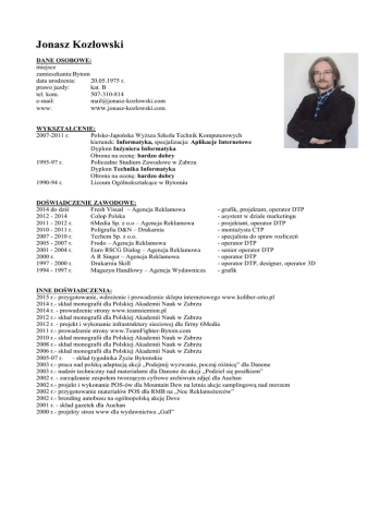 Jonasz Kozłowski DANE OSOBOWE: miejsce zamieszkania:Bytom data urodzenia: 20.05.1975 r. prawo jazdy: kat. B tel. kom. 507-310-814 e-mail: [email protected] www.jonasz-kozlowski.com www: WYKSZTAŁCENIE: 2007-2011 r. Polsko-Japońska Wyższa Szkoła Technik Komputerowych kierunek: Informatyka, specjalizacja: Aplikacje Internetowe Dyplom Inżyniera Informatyka Obrona na ocenę: bardzo dobry 1995-97 r. Policealne Studium Zawodowe w Zabrzu Dyplom Technika Informatyka Obrona na ocenę: bardzo dobry 1990-94 r. Liceum Ogólnokształcące w Bytomiu DOŚWIADCZENIE ZAWODOWE: 2014 do dziś Fresh Visual – Agencja Reklamowa 2012 - 2014 Colop Polska 2011 - 2012 r. 6Media Sp. z o.o – Agencja Reklamowa 2010 - 2011 r. Poligrafia D&N – Drukarnia 2007 - 2010 r. Techem Sp. z o.o. 2005 - 2007 r. Frodo – Agencja Reklamowa 2001 - 2004 r. Euro RSCG Dialog – Agencja Reklamowa 2000 r. A R Singer – Agencja Reklamowa 1997 - 2000 r. Drukarnia Skill 1994 - 1997 r. Magazyn Handlowy – Agencja Wydawnicza - grafik, projektant, operator DTP - asystent w dziale marketingu - projektant, operator DTP - montażysta CTP - specjalista do spraw rozliczeń - operator DTP - senior operator DTP - operator DTP - operator DTP, designer, operator 3D - grafik INNE DOŚWIADCZENIA: 2015 r.- przygotowanie, wdrożenie i prowadzenie sklepu internetowego www.koliber-orto.pl 2014 r.- skład monografii dla Polskiej Akademii Nauk w Zabrzu 2014 r. - prowadzenie strony www.teamsiemion.pl 2012 r.- skład monografii dla Polskiej Akademii Nauk w Zabrzu 2012 r. - projekt i wykonanie infrastruktury sieciowej dla firmy 6Media 2011 r.- prowadzenie strony www.TeamFighter-Bytom.com 2010 r.- skład monografii dla Polskiej Akademii Nauk w Zabrzu 2008 r.- skład monografii dla Polskiej Akademii Nauk w Zabrzu 2006 r.- skład monografii dla Polskiej Akademii Nauk w Zabrzu 2005-07 r. - skład tygodnika Życie Bytomskie 2003 r.- praca nad polską adaptacją akcji „Podejmij wyzwanie, poczuj różnicę” dla Danone 2003 r.- nadzór techniczny nad materiałami dla Danone do akcji „Podziel się posiłkiem” 2002 r. - zarządzanie zespołem tworzącym cyfrowe archiwum zdjęć dla Auchan 2002 r.- projekt i wykonanie POS-ów dla Mountain Dew na letnia akcje samplingową nad morzem 2002 r.- przygotowanie materiałów POS dla RMB na „Noc Reklamożerców” 2002 r.- brending autobusu na ogólnopolską akcję Dove 2001 r. - skład gazetek dla Auchan 2000 r.- projekty stron www dla wydawnictwa „Gall” SZKOLENIA, KURSY: 2003 r. 1999 r. 1995 r. - Perfekt o/Warszawa szkolenie: Zintegrowane środowisko programów Adobe – Adobe Design Collection CE prowadzący: Guy Gowan - Publishing Institute O/Kraków Adobe Certified Training Provider, Quark Authorized Training Center szkolenie: Adobe Photoshop, stopień zaawansowany, prowadzący: Krzysztof Mycek Adobe Certified Expert - Zakład Doskonalenia Zawodowego Kurs komputerowy: Obsługa PC oraz urządzeń peryferyjnych ZNAJOMOŚĆ JĘZYKÓW OBCYCH: w mowie Język angielski dobra Język niemiecki podstawowa w piśmie podstawowa podstawowa w czytaniu dobra podstawowa PRACA W PROGRAMACH: Programy wektorowe Adobe: Illustrator CS4 Corel: DRAW! X6 Inkscape - oraz wersje wcześniejsze - Mac, PC - oraz wersje wcześniejsze - PC Programy rastrowe Adobe: Photoshop CS4 Agfa: Fotolook 3.5 Gimp - oraz wersje wcześniejsze - Mac, PC - Mac Programy wspomagające skanowanie Heidelberg: Linocolor Elite 6.0 - Mac Programy 3D Caligari: MetaCreations: Autodesk: - oraz wersje wcześniejsze - PC, AMIGA - PC - PC trueSpace 4.3 Bryce 3D 3D Studio Programy do składania publikacji Quark: QuarkXPress 4.1 Adobe: InDesign CS4 Adobe: Pagemaker 6.5 Programy do CTP AC&C HSH Group PDF Organizer 2 PLDA Programy do WWW i prezentacji multimedialnych Scala: MM200 Microsoft: Frontpage 2000 Microsoft: PowerPoint Macromedia: Flash CS4 inne Adobe: Microsoft: ATM Deluxe 4.6 Acrobat 4.03 (Reader, Distiller) Office 2000 Znane systemy operacyjne Apple: OSX Microsoft: Windows (95, 98, XP, Vista, 7) Linux - oraz wersje wcześniejsze - Mac, PC - oraz wersje wcześniejsze - Mac, PC - Mac, PC - PC - PC, AMIGA - PC - PC - oraz wersje wcześniejsze - Mac, PC - oraz wersje wcześniejsze - Mac, PC - oraz wersje wcześniejsze - Mac, PC - PC - oraz wersje wcześniejsze - Mac - PC Programy do rozliczania C.O. i C.W. Heizteck 2 Techsup HZ-Dim PRACE NAD PROJEKTAMI M. sIN. DLA: Śląsk i okolice: Polska Akademia Nauk, Dziennik Zachodni, Trybuna Śląska – Dzień, Ambi sp. z o.o., Związek Kynologiczny w Polsce oddział w Bytomiu, II Liceum Ogólnokształcące w Bytomiu, P.P.H.U. Rococo, Nationale Nederlanden ING GROUP, Drukarnia Jotan s.c., DEXO, Fauna&Flora, Bytomskie Zakłady Urządzeń Technicznych BZUT, Magazyn Handlowy s.c., Radio Katowice, Delta Plus Polska, Dorsch Electronic Vertriebs gmbh, Kino Studyjne Światowid, Metal Market s.c., Gall s.c., Centrum Komputerowe Microman, Centralna Stacja Ratownictwa Górniczego w Bytomiu, Teatr Muzyczny w Gliwicach, Fabryka Sprzętu Ratunkowego i Lamp Górniczych FASER S.A., Endeco Ltd., Agencja Artystyczna Opus, PPUH Voigt sp. z o.o., Zespól Pałacowo-Parkowy Nad Jeziorem – Hotel Wolsztyn, Zrzeszenie Krótkofalowców Polskich, Filharmonia Częstochowska, Komenda Miejska Policji w Bytomiu, Muzeum Miejskie im. M. Chroboka w Rudzie Śląskiej, Polska: Auchan, Danone, Unilever, Peugeot, Nestlé, Bank BPH PBK, Novonordisk, Media Markt ZAINTERESOWANIA: Cyfrowe przetwarzanie obrazów, fotografia, sporty zimowe, elektronika, literatura SF. Wyrażam zgodę na przetwarzanie moich danych osobowych zawartych w ofercie pracy dla potrzeb procesu rekrutacji zgodnie z ustawą z dnia 27.08.1997r. Dz. U. z 2002 r., Nr 101, poz. 926 ze zm.