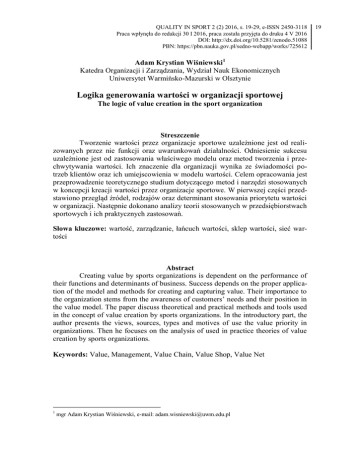 QUALITY IN SPORT 2 (2) 2016, s. 19-29, e-ISSN 2450-3118 Praca wpłynęła do redakcji 30 I 2016, praca została przyjęta do druku 4 V 2016 DOI: http://dx.doi.org/10.5281/zenodo.51088 PBN: https://pbn.nauka.gov.pl/sedno-webapp/works/725612 Adam Krystian Wiśniewski1 Katedra Organizacji i Zarządzania, Wydział Nauk Ekonomicznych Uniwersytet Warmińsko-Mazurski w Olsztynie Logika generowania wartości w organizacji sportowej The logic of value creation in the sport organization Streszczenie Tworzenie wartości przez organizacje sportowe uzależnione jest od realizowanych przez nie funkcji oraz uwarunkowań działalności. Odniesienie sukcesu uzależnione jest od zastosowania właściwego modelu oraz metod tworzenia i przechwytywania wartości. Ich znaczenie dla organizacji wynika ze świadomości potrzeb klientów oraz ich umiejscowienia w modelu wartości. Celem opracowania jest przeprowadzenie teoretycznego studium dotyczącego metod i narzędzi stosowanych w koncepcji kreacji wartości przez organizacje sportowe. W pierwszej części przedstawiono przegląd źródeł, rodzajów oraz determinant stosowania priorytetu wartości w organizacji. Następnie dokonano analizy teorii stosowanych w przedsiębiorstwach sportowych i ich praktycznych zastosowań. Słowa kluczowe: wartość, zarządzanie, łańcuch wartości, sklep wartości, sieć wartości Abstract Creating value by sports organizations is dependent on the performance of their functions and determinants of business. Success depends on the proper application of the model and methods for creating and capturing value. Their importance to the organization stems from the awareness of customers’ needs and their position in the value model. The paper discuss theoretical and practical methods and tools used in the concept of value creation by sports organizations. In the introductory part, the author presents the views, sources, types and motives of use the value priority in organizations. Then he focuses on the analysis of used in practice theories of value creation by sports organizations. Keywords: Value, Management, Value Chain, Value Shop, Value Net 1 mgr Adam Krystian Wiśniewski, e-mail: [email protected] 19 20 Adam Krystian Wiśniewski 1. Generowanie wartości Problematyka zarządzania organizacjami sportowymi współcześnie ukierunkowana jest na osiąganie sukcesu oraz osiąganie dominującej pozycji na rynku. Przez rozwój stosowanych metod i technik zarządzania nastąpił rozwój całych organizacji, rzutując na kształt ich struktur organizacyjnych, procesów i przepływu informacji. Efektem tych zmian jest przekształcanie organizacji ze stowarzyszeń w sprofesjonalizowane organizacje – spółki akcyjne. Dzięki temu kluby sportowe oraz zrzeszające je federacje podnoszą efektywność i mogą skupić swoją uwagę na oferowaniu klientom tego, za co są oni skłonni zapłacić. Aspekt monetaryzacji działań ściśle związany jest z koncepcją generowania wartości dla klienta. Nabywcy są skłonni zapłacić za coś co stanowi dla nich wartość. K. Zorde (2004) zauważył, że „wartość przedmiotu wynika z faktu, że pewna określona własność przysługuje danemu przedmiotowi. Wartość jest miarą intensywności danej własności przysługującej przedmiotowi w danym punkcie czasu”. Wartość stanowi wypadkową poniesionych przez nich kosztów i korzyści jakie w zamian otrzymają. Na aspekt ten zwrócił uwagę na przykład Ph. Kotler (2005), który wartość postrzeganą przez klienta zdefiniował jako „różnicę między przewidywaną oceną łącznych korzyści a wszystkimi kosztami związanymi z ofertą danej firmy w przeciwieństwie do oferty konkurencyjnych firm”. Na zbieżność oferty z oczekiwaniami klienta zwraca uwagę również T. Woodall (2003), który określił wartość jako „każdy popyt, osobiste postrzeganie korzyści wynikających ze związku klienta z ofertą organizacji.” M. Szymura-Tyc (2005) przedstawia trzy podstawowe przesłanki idei wartości dla klienta. Pierwsza głosi, iż wartość dla klienta jest kategorią odnoszącą się do wszystkich typów nabywców: indywidualnych oraz instytucjonalnych. Druga mówi, że uwzględnia wszystkie korzyści oraz koszty ponoszone przez klienta. Po trzecie, kategoria wartości dla klienta ukazuje zależność między użytecznością, satysfakcją z nabytego dobra oraz kosztem jego pozyskania. Cena stanowi wyznacznik skłonności do nabycia produktu lub usługi przez klienta. Poziom tej skłonności uzależniony jest od właściwości oraz parametrów wyrobu. Decyzja o nabyciu podejmowana jest na podstawie dwóch kategorii wartości (Smith 1954): 1. Użytkowej – stopnia w jakim zaspokaja daną potrzebę. 2. Wymiennej – skłonności do handlu, wymiany, zamiany jednej rzeczy na drugą. Odpowiednie wygenerowanie wartości uzależnione jest od rodzaju potrzeb jakie chce zaspokoić klient. Produkt lub usługa zaspokaja nie tylko potrzebę materialną ale także emocjonalną; związaną z indywidualnymi odczuciami nabywcy powiązanymi z danym wyrobem (Ciupiński, Wiśniewski 2015). Istnieje wiele klasyfikacji wartości dla klienta. T. Falencikowski (2013) klasyfikuje cechy charakteryzujące wartości dla klienta w czterech podstawowych kategoriach: wartości emocjonalne, techniczne, ekonomiczne i społeczno-etyczne (rys. 1.). Logika generowania wartości w organizacji sportowej Tabela 1. Cechy charakteryzujące wartości dla klienta Lp. Rodzaj wartości Cechy charakteryzujące dla klienta 1. Wartości emocjonalne Piękno, przyjemność, chęć, miłość 2. Wartości techniczne Trwałość, sprawność, przydatność, łatwość 3. Wartości ekonomiczne Atrakcyjna cena, dostępność, dogodność warunków płatności, czas dostawy 4. Wartości społeczno- Oddziaływanie na środowisko, jakość życia, etyczne odpowiedzialność przedsiębiorstwa za produkt, marketingowa manipulacja klientami. Źródło: Falencikowski T., Spójność m