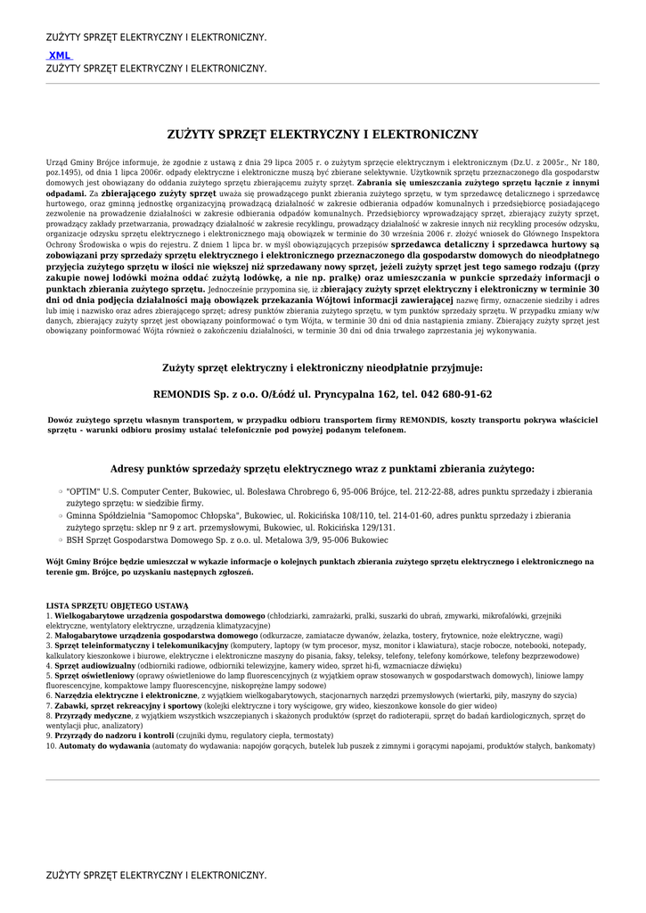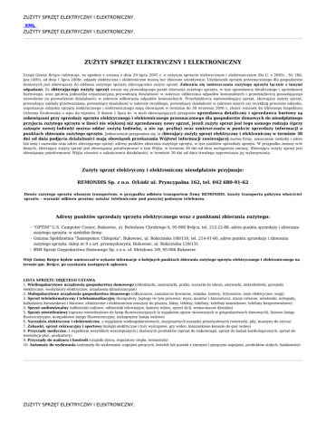 ZUŻYTY SPRZĘT ELEKTRYCZNY I ELEKTRONICZNY. XML ZUŻYTY SPRZĘT ELEKTRYCZNY I ELEKTRONICZNY. ZUŻYTY SPRZĘT ELEKTRYCZNY I ELEKTRONICZNY Urząd Gminy Brójce informuje, że zgodnie z ustawą z dnia 29 lipca 2005 r. o zużytym sprzęcie elektrycznym i elektronicznym (Dz.U. z 2005r., Nr 180, poz.1495), od dnia 1 lipca 2006r. odpady elektryczne i elektroniczne muszą być zbierane selektywnie. Użytkownik sprzętu przeznaczonego dla gospodarstw domowych jest obowiązany do oddania zużytego sprzętu zbierającemu zużyty sprzęt. Zabrania się umieszczania zużytego sprzętu łącznie z innymi odpadami. Za zbierającego zużyty sprzęt uważa się prowadzącego punkt zbierania zużytego sprzętu, w tym sprzedawcę detalicznego i sprzedawcę hurtowego, oraz gminną jednostkę organizacyjną prowadzącą działalność w zakresie odbierania odpadów komunalnych i przedsiębiorcę posiadającego zezwolenie na prowadzenie działalności w zakresie odbierania odpadów komunalnych. Przedsiębiorcy wprowadzający sprzęt, zbierający zużyty sprzęt, prowadzący zakłady przetwarzania, prowadzący działalność w zakresie recyklingu, prowadzący działalność w zakresie innych niż recykling procesów odzysku, organizacje odzysku sprzętu elektrycznego i elektronicznego mają obowiązek w terminie do 30 września 2006 r. złożyć wniosek do Głównego Inspektora Ochrony Środowiska o wpis do rejestru. Z dniem 1 lipca br. w myśl obowiązujących przepisów sprzedawca detaliczny i sprzedawca hurtowy są zobowiązani przy sprzedaży sprzętu elektrycznego i elektronicznego przeznaczonego dla gospodarstw domowych do nieodpłatnego przyjęcia zużytego sprzętu w ilości nie większej niż sprzedawany nowy sprzęt, jeżeli zużyty sprzęt jest tego samego rodzaju ((przy zakupie nowej lodówki można oddać zużytą lodówkę, a nie np. pralkę) oraz umieszczania w punkcie sprzedaży informacji o punktach zbierania zużytego sprzętu. Jednocześnie przypomina się, iż zbierający zużyty sprzęt elektryczny i elektroniczny w terminie 30 dni od dnia podjęcia działalności mają obowiązek przekazania Wójtowi informacji zawierającej nazwę firmy, oznaczenie siedziby i adres lub imię i nazwisko oraz adres zbierającego sprzęt; adresy punktów zbierania zużytego sprzętu, w tym punktów sprzedaży sprzętu. W przypadku zmiany w/w danych, zbierający zużyty sprzęt jest obowiązany poinformować o tym Wójta, w terminie 30 dni od dnia nastąpienia zmiany. Zbierający zużyty sprzęt jest obowiązany poinformować Wójta również o zakończeniu działalności, w terminie 30 dni od dnia trwałego zaprzestania jej wykonywania. Zużyty sprzęt elektryczny i elektroniczny nieodpłatnie przyjmuje: REMONDIS Sp. z o.o. O/Łódź ul. Pryncypalna 162, tel. 042 680-91-62 Dowóz zużytego sprzętu własnym transportem, w przypadku odbioru transportem firmy REMONDIS, koszty transportu pokrywa właściciel sprzętu - warunki odbioru prosimy ustalać telefonicznie pod powyżej podanym telefonem. Adresy punktów sprzedaży sprzętu elektrycznego wraz z punktami zbierania zużytego: ❍ ❍ ❍ "OPTIM" U.S. Computer Center, Bukowiec, ul. Bolesława Chrobrego 6, 95-006 Brójce, tel. 212-22-88, adres punktu sprzedaży i zbierania zużytego sprzętu: w siedzibie firmy. Gminna Spółdzielnia "Samopomoc Chłopska", Bukowiec, ul. Rokicińska 108/110, tel. 214-01-60, adres punktu sprzedaży i zbierania zużytego sprzętu: sklep nr 9 z art. przemysłowymi, Bukowiec, ul. Rokicińska 129/131. BSH Sprzęt Gospodarstwa Domowego Sp. z o.o. ul. Metalowa 3/9, 95-006 Bukowiec Wójt Gminy Brójce będzie umieszczał w wykazie informacje o kolejnych punktach zbierania zużytego sprzętu elektrycznego i elektronicznego na terenie gm. Brójce, po uzyskaniu następnych zgłoszeń. LISTA SPRZĘTU OBJĘTEGO USTAWĄ 1. Wielkogabarytowe urządzenia gospodarstwa domowego (chłodziarki, zamrażarki, pralki, suszarki do ubrań, zmywarki, mikrofalówki, grzejniki elektryczne, wentylatory elektryczne, urządzenia klimatyzacyjne) 2. Małogabarytowe urządzenia gospodarstwa domowego (odkurzacze, zamiatacze dywanów, żelazka, tostery, frytownice, noże elektryczne, wagi) 3. Sprzęt teleinformatyczny i telekomunikacyjny (komputery, laptopy (w tym procesor, mysz, monitor i klawiatura), stacje robocze, notebooki, notepady, kalkulatory kieszonkowe i biurowe, elektryczne i elektroniczne maszyny do pisania, faksy, teleksy, telefony, telefony komórkowe, telefony bezprzewodowe) 4. Sprzęt audiowizualny (odbiorniki radiowe, odbiorniki telewizyjne, kamery wideo, sprzet hi-fi, wzmacniacze dźwięku) 5. Sprzęt oświetleniowy (oprawy oświetleniowe do lamp fluorescencyjnych (z wyjątkiem opraw stosowanych w gospodarstwach domowych), liniowe lampy fluorescencyjne, kompaktowe lampy fluorescencyjne, niskoprężne lampy sodowe) 6. Narzędzia elektryczne i elektroniczne, z wyjątkiem wielkogabarytowych, stacjonarnych narzędzi przemysłowych (wiertarki, piły, maszyny do szycia) 7. Zabawki, sprzęt rekreacyjny i sportowy (kolejki elektryczne i tory wyścigowe, gry wideo, kieszonkowe konsole do gier wideo) 8. Przyrządy medyczne, z wyjątkiem wszystkich wszczepianych i skażonych produktów (sprzęt do radioterapii, sprzęt do badań kardiologicznych, sprzęt do wentylacji płuc, analizatory) 9. Przyrządy do nadzoru i kontroli (czujniki dymu, regulatory ciepła, termostaty) 10. Automaty do wydawania (automaty do wydawania: napojów gorących, butelek lub puszek z zimnymi i gorącymi napojami, produktów stałych, bankomaty) ZUŻYTY SPRZĘT ELEKTRYCZNY I ELEKTRONICZNY. ZUŻYTY SPRZĘT ELEKTRYCZNY I ELEKTRONICZNY. Załączniki: Nazwa pliku Typ pliku Rozmiar pełna lista sprzętu objętego ustawą Podmiot publikujący Urząd Gminy Brójce Wytworzył Publikujący 36.13 KB 2009-03-09 - ZUŻYTY SPRZĘT ELEKTRYCZNY I ELEKTRONICZNY.