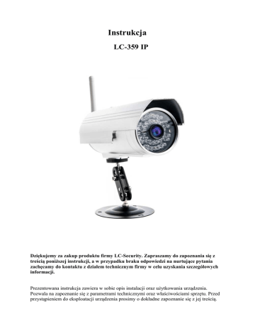 Instrukcja LC-359 IP Dziękujemy za zakup produktu firmy LC-Security. Zapraszamy do zapoznania się z treścią poniższej instrukcji, a w przypadku braku odpowiedzi na nurtujące pytania zachęcamy do kontaktu z działem technicznym firmy w celu uzyskania szczegółowych informacji. Prezentowana instrukcja zawiera w sobie opis instalacji oraz użytkowania urządzenia. Pozwala na zapoznanie się z parametrami technicznymi oraz właściwościami sprzętu. Przed przystąpieniem do eksploatacji urządzenia prosimy o dokładne zapoznanie się z jej treścią. Uwagi i ostrzeżenia UWAGA! PRODUCENT ORAZ DYSTRYBUTOR NA BIEŻĄCO PRACUJĄ NAD UDOSKONALENIEM SPRZĘTU. ZASTRZEGAMY SOBIE PRAWO DO DOKONYWANIA ZMIAN PARAMETRÓW URZĄDZEŃ ORAZ SPOSOBU OBSŁUGI URZĄDZENIA BEZ WCZEŚNIEJSZEGO POINFORMOWANIA. W WYNIKU CIĄGŁEGO ULEPSZANIA OPROGRAMOWANIA NIEKTÓRE Z FUNKCJI OPISANYCH W INSTRUKCJI MOGĄ SIĘ RÓŻNIĆ. W RAZIE PROBLEMÓW PROSIMY O KONTAKT Z DZIAŁEM TECHNICZNYM W CELU UZYSKANIA SZCZEGÓŁOWYCH INFORMACJI. ZASTRZEGAMY SOBIE PRAWO DO ZMIANY CAŁOŚCI LUB CZĘŚCI INFORMACJI ZAWARTYCH W NINIEJSZEJ INSTRUKCJI BEZ UPRZEDZENIA. UWAGA! NIE OTWIERAJ POKRYWY ZEWNĘTRZNEJ URZĄDZENIA, PONIEWAŻ NIESIE TO ZA SOBĄ RYZYKO PORAŻENIA PRĄDEM. W RAZIE BŁĘDNEGO DZIAŁANIA URZĄDZENIA ZWRÓĆ SIĘ Z PROŚBĄ DO AUTORYZOWANEGO SERWISU. PAMIĘTAJ RÓWNIEŻ O WŁAŚCIWYM UZIEMIENIU ORAZ OCHRONIE PRZECIWPRZEPIĘCIOWEJ. UWAGA! UŻYTKOWNICY SYSTEMU POWINNI DOKŁADNIE ZAPOZNAĆ SIĘ ZE WSZYSTKIMI REGULACJAMI PRAWNYMI DOTYCZĄCYMI PROWADZENIA MONITORINGU AUDIOWIZYJNEGO. PRODUCENT I DYSTRYBUTOR SPRZĘTU NIE ODPOWIADAJĄ ZA NADUŻYCIA ORAZ NARUSZENIA ZWIĄZANE Z UŻYTKOWANIEM SPRZĘTU. Urządzenie po okresie eksploatacji nie może być umieszczone razem z innymi odpadami pochodzącymi z gospodarstwa domowego. Użytkownik ma obowiązek przekazania sprzętu odpowiednim służbom zajmującym się zbiórką urządzeń elektrycznych oraz elektronicznych. Punkty prowadzące zbieranie tego typu sprzętu tworzą odpowiedni system umożliwiający oddanie tego typu urządzeń. Przyczynia się to do uniknięcia szkodliwych dla zdrowia oraz środowiska konsekwencji, które wynikają z niewłaściwego składowania i przetwarzania tego typu sprzętu oraz obecności w nim składników niebezpiecznych. WARUNKI BEZPIECZEŃSTWA 1. Urządzenia powinny być instalowane w miejscach, które zapewniają odpowiednią wentylację. Montaż urządzenia np. w zamkniętej szafce może doprowadzić do jego nieodwracalnego uszkodzenia. 2. Zabronione jest samodzielne otwieranie obudowy urządzenia, a tym bardziej umieszczanie w niej ciał obcych. 3. Podczas montażu powinny zostać wykorzystane przewody osłonięte izolacją wykonaną z tworzywa sztucznego. 4. Urządzenie powinno być transportowane oraz przechowywane w oryginalnym opakowaniu, które zapewnia jego odpowiednią ochronę przed wstrząsami. 5. Naprawy oraz testy sprzętu powinny być wykonywane przez autoryzowany personel. Producent oraz dystrybutor nie ponosi odpowiedzialności za wszelkie szkody, które wynikają z nieautoryzowanych przeróbek oraz napraw. Takie działanie skutkuje utratą gwarancji. 6. Instalacje powinny być wykonywane przez autoryzowany personel posiadający wiedzę z zakresu elektryki, elektroniki oraz informatyki, a także zgodnie z lokalnymi przepisami. 7. Konieczne jest używanie dedykowanego źródła zasilania. Nieodpowiednie zasilanie może być przyczyną nieodwracalnego uszkodzenia sprzętu, które nie jest objęte gwarancją. 8. Nie należy podejmować prób samodzielnych napraw. W przypadku wykrycia usterki konieczne jest skontaktowanie się z autoryzowanym serwisem. 9. Producent ani dystrybutor nie ponosi odpowiedzialności za szkody wynikające z nieprawidłowego użytkowania lub nieprawidłowej instalacji sprzętu. 10. Urządzenia wchodzące w skład monitoringu wizyjnego CCTV są w znacznym stopniu narażone na zgubny wpływ m.in. wyładowań atmosferycznych, które mogą doprowadzić do ich uszkodzenia. Powinny zostać zabezpieczone dodatkowymi elementami ochrony przepięciowej. 11. Firma LC-Security zapewnia profesjonalny serwis gwarancyjny i pogwarancyjny oraz profesjonalną pomoc techniczną na najwyższym poziomie. SKRÓCONE WARUNKI GWARANCJI 1. Naprawa gwarancyjna nie obejmuje czynności przewidzianych w instrukcji obsługi, do których wykonania zobowiązany jest użytkownik we własnym zakresie. 2. Gwarancja nie obejmuje obniżania się jakości produktu spowodowanego normalnym procesem zużycia i poniższych przypadków: - niewłaściwego lub niezgodnego z instrukcją użytkowania, przechowywania i konserwacji, - użytkowaniem lub pozostawieniem produktu w nieodpowiednich warunkach (nadmierna wilgotność, zbyt wysoka lub zbyt niska temperatura, nasłonecznienie, itp.), - samowolnych (dokonywanych przez użytkownika lub inne nieupoważnione osoby) napraw, przeróbek lub zmian konstrukcyjnych, - podłączaniem dodatkowego wyposażenia, innego niż zalecane przez producenta produktu, - nieprawidłowego napięcia zasilania. 3. Klient jest odpowiedzialny za dostarczenie reklamowanego towaru na swój koszt. Nie zwracamy kosztów wysyłki i pakowania. Nie odbieramy paczek za pobraniem. 4. Warunkiem wykonania naprawy jest dostarczenie produktu wraz z dowodem zakupu produktu (paragon lub kserokopia faktury). 5. Do pudełka z reklamowanym towarem należy włożyć kartkę z dokładnym opisem uszkodzenia oraz z adresem, na który odesłany ma zostać towar po reklamacji. 6. W przypadku niespełnienia któregokolwiek z warunków gwarancji towar zostanie odesłany w stanie niezmienionym na koszt kupującego. Krok 1: Instalacja sprzętu 1. Zainstaluj antenę Wi-Fi. 2. Podłącz zasilacz do kamery. 3. Podłącz kabel sieciowy do kamery i do routera / przełącznika. Krok 2: Instalacja oprogramowania Zainstaluj następujące oprogramowanie: 1. ActiveX: kliknij "setup OCX" - "Next" - "Install" - "Finish". 2. Narzędzie Wyszukaj: Otwórz CD. Narzęd