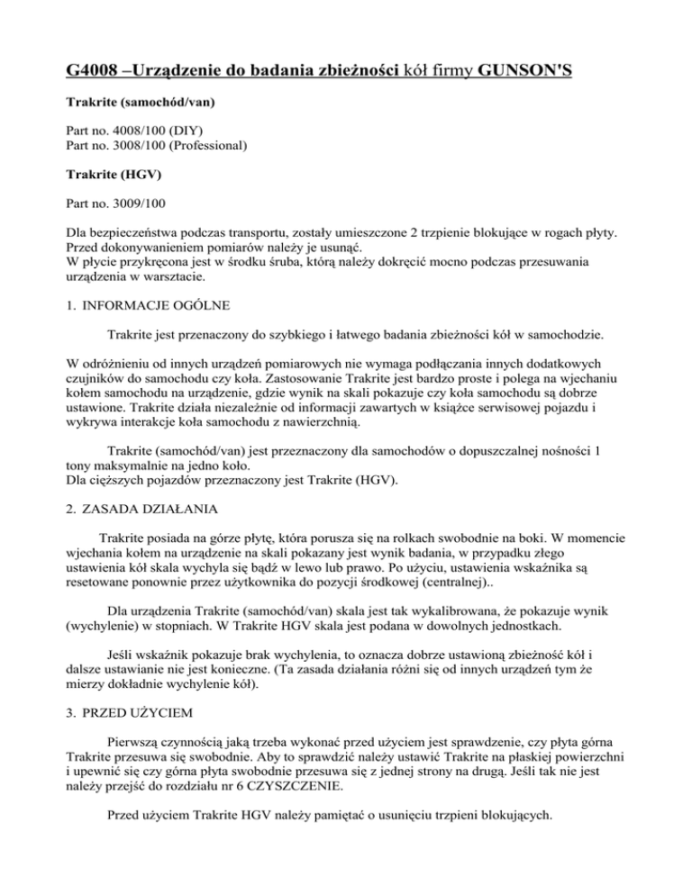 G4008 –Urządzenie do badania zbieżności kół firmy GUNSON'S Trakrite (samochód/van) Part no. 4008/100 (DIY) Part no. 3008/100 (Professional) Trakrite (HGV) Part no. 3009/100 Dla bezpieczeństwa podczas transportu, zostały umieszczone 2 trzpienie blokujące w rogach płyty. Przed dokonywanieniem pomiarów należy je usunąć. W płycie przykręcona jest w środku śruba, którą należy dokręcić mocno podczas przesuwania urządzenia w warsztacie. 1. INFORMACJE OGÓLNE Trakrite jest przenaczony do szybkiego i łatwego badania zbieżności kół w samochodzie. W odróżnieniu od innych urządzeń pomiarowych nie wymaga podłączania innych dodatkowych czujników do samochodu czy koła. Zastosowanie Trakrite jest bardzo proste i polega na wjechaniu kołem samochodu na urządzenie, gdzie wynik na skali pokazuje czy koła samochodu są dobrze ustawione. Trakrite działa niezależnie od informacji zawartych w książce serwisowej pojazdu i wykrywa interakcje koła samochodu z nawierzchnią. Trakrite (samochód/van) jest przeznaczony dla samochodów o dopuszczalnej nośności 1 tony maksymalnie na jedno koło. Dla cięższych pojazdów przeznaczony jest Trakrite (HGV). 2. ZASADA DZIAŁANIA Trakrite posiada na górze płytę, która porusza się na rolkach swobodnie na boki. W momencie wjechania kołem na urządzenie na skali pokazany jest wynik badania, w przypadku złego ustawienia kół skala wychyla się bądź w lewo lub prawo. Po użyciu, ustawienia wskaźnika są resetowane ponownie przez użytkownika do pozycji środkowej (centralnej).. Dla urządzenia Trakrite (samochód/van) skala jest tak wykalibrowana, że pokazuje wynik (wychylenie) w stopniach. W Trakrite HGV skala jest podana w dowolnych jednostkach. Jeśli wskaźnik pokazuje brak wychylenia, to oznacza dobrze ustawioną zbieżność kół i dalsze ustawianie nie jest konieczne. (Ta zasada działania różni się od innych urządzeń tym że mierzy dokładnie wychylenie kół). 3. PRZED UŻYCIEM Pierwszą czynnością jaką trzeba wykonać przed użyciem jest sprawdzenie, czy płyta górna Trakrite przesuwa się swobodnie. Aby to sprawdzić należy ustawić Trakrite na płaskiej powierzchni i upewnić się czy górna płyta swobodnie przesuwa się z jednej strony na drugą. Jeśli tak nie jest należy przejść do rozdziału nr 6 CZYSZCZENIE. Przed użyciem Trakrite HGV należy pamiętać o usunięciu trzpieni blokujących. Testy zbieżności kół należy przeprowadzać na płaskim i równym podłożu, raczej na czystym betonie lub równej powierzchni asfaltu. Nawierzchnia na której powinno się przeprowadzać pomiary powinna być pozbawiona widocznych wypukłości, pochyłości i równa na dwie długości samochodu, który ma być testowany. Samochód/van testowany powinien być obciążony ciężarem określonym przez producenta samochodu dla testów zbieżności. 4. INSTRUKCJA UŻYTKOWANIA Ustaw pojazd prosto do kierunku jazdy. Zignoruj ustawienie kierownicy, gdyż czasami może być nie ustawiona współosiowo do kół. Upewnij się, że blokada kierunku jest ustawiona na zero poprzez przejechanie samochodem do przodu i tyłu parę razy, sprawdzając przy okazji czy pojazd nie skręca w prawo lub lewo. Łagodnie pokołysz samochodem w górę i w dół, aby ułożyć zawieszenie. Puść kierownicę swobodnie i ostrożnie powoli podjedź 2, 3 metry do przodu, tak aby ewentualny luz w układzie sterowniczym bądź zawieszenia został wyłapany. Zatrzymaj pojazd używając lekko hamulców. Nie pozwól cofnąć się pojazdowi, gdyż to może zmienić ustawienie kół poprzez luzy i zmiany w połączeniach układu sterowania. Umieść Trakrite z przodu na podłożu tuż przed przednimi kołami pojazdu. Nie ma znaczenia przed którym kołem. Jakolwiek jest istotne, aby Trakrite był umieszczony dokładnie przed kołem. Kierunek jazdy jest pokazany na górnej płycie Trakrite, w zależności czy wewnętrzna lub zewnętrzna część koła jest poddawana testom. Umieść Trakrite 0,5 metra z przodu przed kołem w taki sposób, aby po wjechaniu pojazdu na urządzenie koło minęło środek górnej płyty. Trakrite może być ustawiony „na oko” , ale tak aby był równoległy do ruchu pojazdu. Aby sobie ułatwić pracę można umieścić prostą linię wzdłuż przednich kół, ale przy pomiarze należy ją usunąć. Ustaw wskaźnik na zero. Powoli wjedź samochodem na Trakrite bez dotykania ani hamulców ani kierownicy. Wjedź powoli, ale pewnie. Jedź tak długo, aż koło całkowicie zakryje Trakrite i się zatrzymaj. Zanotuj wynik ze wskaźnika pod płytą górną. Powtórz test z drugim kołem, aby potwierdzić rezultat, pamiętając o wyzerowaniu wskaźnika uprzednio. Zgodny odczyt na czerwonym polu dokładnie wskazuje na złe ustawienie zbieżności. 5. DALSZE INFORMACJE 1. Podłoże powinno być płaskie, wyrównane i w miarę gładkie. Pojazd powinien poruszać się do przodu przez parę metrów, aż do najechania na Trakrite, tak aby ewentualne luzy i zmiany w połączeniach układu sterowania zostały wyłapane. Pojazd powinien wjechać na urządzenie powoli, ale pewnie, nie powinien być wepchnięty ani wtoczony na luzie. Przeprowadzone testy wskazują na to, że pojazd nie musi wjechać dokładnie na urządzenie, margines błędu wynosi do 5 %. 2. Użycie maty balansowej, podkładana pod przeciwległe koła przy testach, preferowana przez niektórych użytkowników. Taka mata jest częścią zestawu Trakrite (samochód/van) i dostępna jako opcja w zestawie DIY (Part no 3008/17). 3. Jeśli wskazówka zgodnie wychodzi na „czerwone” pole oznacza to że regulacji wymagają drążki kierownicze. To odnosi się do wszystkich pojazdów bez względu na rodzaj opon założonych, czy zmian dokonanych w zawieszeniu. Aby osiągnąć wynik na zero nieraz potrzebne są dalsze regulacje . 4. Jeśli odczyt z jednego przedniego koła różni się od odczytu z drugiego, przyczyną może być: Testy zostały przeprowadzone n