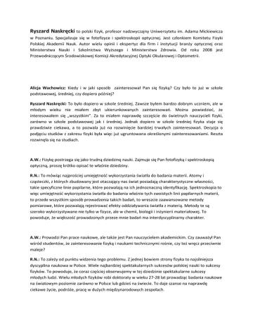 Ryszard Naskręcki to polski fizyk, profesor nadzwyczajny Uniwersytetu im. Adama Mickiewicza w Poznaniu. Specjalizuje się w fotofizyce i spektroskopii optycznej. Jest członkiem Komitetu Fizyki Polskiej Akademii Nauk. Autor wielu opinii i ekspertyz dla firm i instytucji branży optycznej oraz Ministerstwa Nauki i Szkolnictwa Wyższego i Ministerstwa Zdrowia. Od roku 2008 jest Przewodniczącym Środowiskowej Komisji Akredytacyjnej Optyki Okularowej i Optometrii. Alicja Wachowicz: Kiedy i w jaki sposób zainteresował Pan się fizyką? Czy było to już w szkole podstawowej, średniej, czy dopiero później? Ryszard Naskręcki: To było dopiero w szkole średniej. Zawsze byłem bardzo dobrym uczniem, ale w młodym wieku nie miałem zbyt ukierunkowanych zainteresowao. Można powiedzied, że interesowałem się „wszystkim”. Za to miałem naprawdę szczęście do świetnych nauczycieli fizyki, zarówno w szkole podstawowej jak i średniej. Jednak dopiero w szkole średniej fizyka staje się prawdziwie ciekawa, a to pozwala już na rozwinięcie bardziej trwałych zainteresowao. Decyzja o podjęciu studiów z zakresu fizyki była więc już ugruntowana określonymi zainteresowaniami. Reszta rozwinęła się na studiach. A.W.: Fizykę postrzega się jako trudną dziedzinę nauki. Zajmuje się Pan fotofizyką i spektroskopią optyczną, proszę krótko opisad te właśnie dziedziny. R.N.: To mówiąc najprościej umiejętnośd wykorzystania światła do badania materii. Atomy i cząsteczki, z których zbudowany jest otaczający nas świat posiadają charakterystyczne własności, takie specyficzne linie papilarne, które pozwalają na ich jednoznaczną identyfikację. Spektroskopia to więc umiejętnośd wykorzystania światła do badania właśnie tych swoistych linii papilarnych materii, to przede wszystkim sposób prowadzenia takich badao, to wreszcie zaawansowane metody pomiarowe, które pozwalają rejestrowad efekty oddziaływania światła z materią. Metody te są szeroko wykorzystywane nie tylko w fizyce, ale w chemii, biologii i inżynierii materiałowej. To powoduje, że większośd prowadzonych przeze mnie badao ma interdyscyplinarny charakter. A.W.: Prowadzi Pan prace naukowe, ale także jest Pan nauczycielem akademickim. Czy zauważył Pan wśród studentów, że zainteresowanie fizyką i naukami technicznymi rośnie, czy też wręcz przeciwnie maleje? R.N.: To zależy od punktu widzenia tego problemu. Z jednej bowiem strony fizyka to najsilniejsza dyscyplina naukowa w Polsce. Wiele najbardziej spektakularnych sukcesów polskiej nauki to sukcesy fizyków. To powoduje, że coraz częściej obserwujemy w tej dziedzinie spektakularne sukcesy młodych ludzi. Wielu młodych fizyków robi doktoraty w wieku 27-28 lat prowadząc badania naukowe na światowym poziomie zarówno w Polsce lub gdzieś na świecie. To daje szanse na naprawdę ciekawe życie, podróże, pracę w dużych międzynarodowych zespołach. Z drugiej zaś strony fizyka traktowana jest jako trudny i mało ciekawy przedmiot szkolny, związany przede wszystkim z rozwiązywaniem nikomu niepotrzebnych zadao. To oczywiście zniechęca młodych ludzi do fizyki jako potencjalnego obszaru własnych zainteresowao, czy wręcz pasji. Młody człowiek wybiera często swoją drogę życiową kierując się bardzo przypadkowymi kryteriami, postrzegając obszar nauki lub dziedzinę gospodarki poprzez nazwy przedmiotów szkolnych. A później, w dorosłym życiu szybko przychodzą rozczarowania. Ja nie spotkałem jeszcze młodego, bardzo dobrego fizyka, który by powiedział, że jest rozczarowany. Ale w tej dziedzinie trzeba byd naprawdę bardzo dobrym. A.W.: W nawiązaniu do pytania wcześniejszego proszę wyrazid swoją opinie: czy można coś zmienid w nauczaniu młodzieży tak, aby zachęcid ją w większym stopniu do wyboru kierunków: fizyka, chemia, matematyka? R.N.: Na to pytanie nie ma łatwej odpowiedzi. Polska potrzebuje fizyków, chemików i matematyków, aby zmienid obraz naszej gospodarki – z odtwórczej na bardziej innowacyjny. Tego nie da się zadekretowad. Trzeba pewnej masy krytycznej młodych, dobrze wykształconych specjalistów, którzy potrafią skutecznie zaadoptowad odkrycia naukowe dla potrzeb nowoczesnej gospodarki. Aby zachęcad młodych ludzi do studiowania tych kierunków potrzeba nieustannie pokazywad dobre przykłady młodych ludzi, absolwentów tych kierunków studiów, którym się w życiu zawodowym powiodło, którzy się w pełni realizują. A tacy już są. Młody człowiek idzie na studia po to, aby później w życiu dorosłym mied ciekawą pracę, która pozwoli mu zarobid na dobre życie. Tym czasem my nieustanie pokazujemy fizykę jako trudny przedmiot szkolny, którego młodzi ludzie nie chcą studiowad. Fizyka to nie jest tylko przedmiot szkolny – to przede wszystkim potężna dyscyplina naukowa, bez rozwoju której świat przestanie się rozwijad. A.W.: Jakie odkrycie fizyczne uważa Pan za najważniejsze w historii ludzkości? R.N.: To pytanie jest bardzo trudne. Nauka to bowiem nieustanne poszukiwanie prawdziwego obrazu świata, to pewna ciągłośd, to wreszcie fundament naszego postępu. Wszystko co najlepsze w życiu człowieka zawdzięczamy przede wszystkim postępowi nauki. Trudno sobie dzisiaj wyobrazid, że wracamy do jaskio i żyjemy tak jak nasi przodkowie tysiące lat temu. I chociaż wydaje nam się, że nauka wspiera także złe strony naszego życia, to należy jednak pamiętad, że to złe ideologie, czy źli ludzie wywołują wojny wykorzystując do tych celów odkrycia naukowe. Nauka i odkrycia naukowe nie są złe w samej istocie. To wyłącznie człowiek decyduje jak chce wykorzystad to wszystko. Ale wracając do pytania – na pewno odkrycie Kopernika miało fundamentalne znacznie na nasz pogląd na świat. Warto też wymienid powstanie mechaniki kwantowej, która pozwoliła zrozumied własności materii w skali atomowej. No i nie można zapomnied o teorii względn