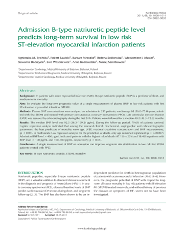 Kardiologia Polska 2011; 69, 10: 1008–1014 ISSN 0022–9032 Original article Admission B−type natriuretic peptide level predicts long−term survival in low risk ST−elevation myocardial infarction patients Agnieszka M. Tycińska1, Robert Sawicki1, Barbara Mroczko2, Bożena Sobkowicz1, Włodzimierz J. Musiał1, Sławomir Dobrzycki3, Ewa Waszkiewicz1, Anna Kozieradzka1, Maciej Szmitkowski2 1Department of Cardiology, Medical University of Bialystok, Bialystok, Poland 2Department of Biochemical Diagnostics, Medical University of Bialystok, Bialystok, Poland 3Department of Invasive Cardiology, Medical University of Bialystok, Bialystok, Poland Abstract Background: In patients with acute myocardial infarction (AMI), B-type natriuretic peptide (BNP) is a predictor of short- and medium-term mortality. Aim: To evaluate the long-term prognostic value of a single measurement of plasma BNP in low risk patients with first ST-elevation myocardial infarction (STEMI). Methods: Plasma BNP concentrations were analysed on admission in 211 patients, median age 68 (56.0–75.0) years, admitted with first STEMI and treated with primary percutaneous coronary intervention (PPCI). Left ventricular ejection fraction (LVEF) was assessed by echocardiography during the first 24 h. Patients were followed for a median 48.2 (42.3–72.6) months. Results: The median BNP level was 92.5 (36.3–199.2) pg/mL. During the follow-up period, 79.6% of patients survived. Logistic regression analysis indicated that among the assessed clinical, biochemical, angiographic and echocardiographic parameters, the best predictors of mortality were age, LVEF, maximal creatinine concentration and BNP measurements, (p < 0.05). In multivariate Cox regression analysis for the prediction of death, only age remained significant (p = 0.00007). Admission BNP level > 400 pg/mL indicated patients with the highest risk of death (47.1% vs 22% and 18.4% in patients with BNP level < 100 pg/mL and 100–400 pg/mL, respectively; p < 0.05). Conclusions: A single measurement of BNP on admission can improve long-term risk stratification in low risk first STEMI patients treated with PPCI. Key words: B-type natriuretic peptide, STEMI, mortality Kardiol Pol 2011; 69, 10: 1008–1014 INTRODUCTION Natriuretic peptides, especially B-type natriuretic peptide (BNP), are a valuable addition to standard clinical assessment in the diagnosis and prognosis of heart failure (HF) [1]. In acute coronary syndromes (ACS), elevated baseline levels of BNP predict cardiovascular (CV) events during short- and long-term follow-up [2, 3]. The BNP has also been shown to be an in- dependent predictor for death in heterogenous populations of patients with acute myocardial infarction (AMI) [4–6]. However, the prognostic potential of BNP with respect to long-term all-cause mortality in low risk patients with ST-elevation MI (STEMI) treated invasively, and without history of previous CV diseases or symptoms of HF, seems not to have been investigated. Address for correspondence: Agnieszka Małgorzata Tycińska, MD, PhD, Department of Cardiology, Medical University of Bialystok, ul. Skłodowskiej-Curie 24a, 15–276 Białystok, Poland, tel: +48 85 746 86 56, fax: +48 85 746 86 04, e-mail: [email protected] Received: 22.02.2011 Accepted: 18.05.2011 Copyright © Polskie Towarzystwo Kardiologiczne www.kardiologiapolska.pl 1009 BNP and survival in STEMI patients Therefore, the aim of this study was to assess the incremental prognostic value of BNP in a selected group of first STEMI patients treated invasively with primary percutaneous coronary intervention (PPCI). METHODS Patient population and follow-up The study patients were selected out of 530 first STEMI patients. The detailed characteristics of the population studied have been described elsewhere [7]. Briefly, 211 patients (median age 68 years; 25th–75th percentile: 56.0–75.0; 70.3% men), with symptoms of first STEMI treated with PPCI were included in the study. Exclusion criteria were: history of previous MI, severe valvular disease, cardiomyopathy, any form of congenital cardiac disease or symptoms of chronic HF. The characteristics of the whole study patients are shown in Table 1. The diagnosis of STEMI was made on the basis of recent European Society of Cardiology (ESC) recommendations [8]. On admission, the following clinical parameters were assessed: heart rate, systolic and diastolic blood pressures, and Killip classification. For each patient, a time interval from chest pain onset to admission was recorded, and the Thrombolysis in Myocardial Infarction (TIMI) Risk Score for STEMI [9] was calculated. Moreover, the following parameters (mostly related to the infarct size) were assessed: localisation of MI, the type of the infarct-related artery (IRA), and the maximal activity of serum creatine kinase myocardial isoenzyme (CK-MB). Maximal concentrations of serum creatinine and C-reactive protein (CRP), as strong predictors of mortality in MI [10, 11], were also measured. Within the first 24 h, each of the patients underwent standard trans- Table 1. Characteristics of the whole study patients Age [years]* Death HR [bpm]* 68.0 (56.0–75.0) 43 (20.4%) 75.0 (68.0–90.0) SBP [mm Hg]* 140.0 (120.0–160.0) DBP [mm Hg]* 90.0 (80.0–100.0) Killip class* 1 (1–2) TIMI Risk Score for STEMI* 3 (2–5) Time from chest pain onset to admission [h]* 4 (2–6) BNP [pg/mL]* 92.5 (36.3–199.2) Maximal CK-MB [IU/L]* 181.5 (87.0–291.7) Maximal creatinine [mg/dL]* thoracic echocardiography (TTE) with the assessment of left ventricular ejection fraction (LVEF). Blood samples for BNP assessment were obtained on admission. According to the current guidelines, for the diagnosis of HF symptoms according to BNP concentrations, we divided the whole study group into three subgroups — group 1: < 100 pg/mL, group 2: 100–400 pg/mL and group 3: > 400 pg/mL [12]. Details of PPCI as well as pharmacotherapy during hospitalisation have been desc