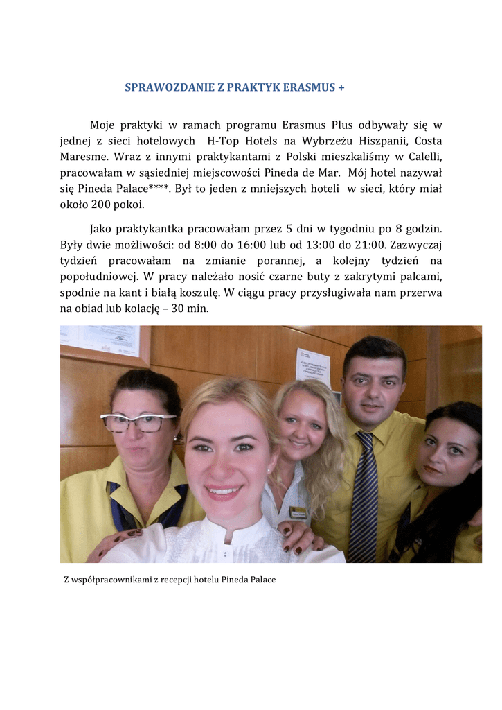 SPRAWOZDANIEZPRAKTYKERASMUS+ Moje praktyki w ramach programu Erasmus Plus odbywały się w jednej z sieci hotelowych H-Top Hotels na Wybrzeżu Hiszpanii, Costa Maresme. Wraz z innymi praktykantami z Polski mieszkaliśmy w Calelli, pracowałamwsąsiedniejmiejscowościPinedadeMar.Mójhotelnazywał się Pineda Palace****. Był to jeden z mniejszych hoteli w sieci, który miał około200pokoi. Jako praktykantka pracowałam przez 5 dni w tygodniu po 8 godzin. Byłydwiemożliwości:od8:00do16:00lubod13:00do21:00.Zazwyczaj tydzień pracowałam na zmianie porannej, a kolejny tydzień na popołudniowej. W pracy należało nosić czarne buty z zakrytymi palcami, spodnienakantibiałąkoszulę.Wciągupracyprzysługiwałanamprzerwa naobiadlubkolację–30min. ZwspółpracownikamizrecepcjihoteluPinedaPalace Przezpierwsze2tygodniemoiprzełożenipokazywalimijakwygląda praca w recepcji. Uczyli skanowania paszportów gości, obsługi programu komputerowego oraz dorabiania kluczy, które były wydawane w postaci karty magnetycznej. Z biegiem czasu czułam się coraz pewniej i coraz więcej obowiązków mi powierzano - skanowanie bonów rezerwacji, kopiowaniedokumentów,drukowaniekartrezerwacjiczymeldowanielub wymeldowywaniegości. Praca w hotelu nauczyła mnie działania pod presją czasu, komunikowania się ze współpracownikami, podejmowania szybkich decyzji i elastyczności. Będąc na wakacyjnych praktykach w Hiszpanii dowiedziałam się wiele o kulturze i tradycjach regionu Katalonii oraz nawiązałam kilka międzynarodowych przyjaźni z zarówno miejscowymi, jakiosobami,któretakżeprzyjechałynapraktyki. JoannaWalisiak,studentkafilologiihiszpańskiej RazemzinnymipraktykantamizPolski.