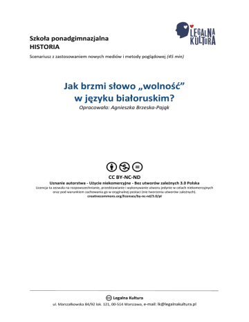 Szkoła ponadgimnazjalna HISTORIA Scenariusz z zastosowaniem nowych mediów i metody poglądowej (45 min) Jak brzmi słowo „wolność” w języku białoruskim? Opracowała: Agnieszka Brzeska-Pająk CC BY-NC-ND Uznanie autorstwa - Użycie niekomercyjne - Bez utworów zależnych 3.0 Polska Licencja ta zezwala na rozpowszechnianie, przedstawianie i wykonywanie utworu jedynie w celach niekomercyjnych oraz pod warunkiem zachowania go w oryginalnej postaci (nie tworzenia utworów zależnych). creativecommons.org/licenses/by-nc-nd/3.0/pl ul. Marszałkowska 84/92 lok. 121, 00-514 Warszawa, e-mail: [email protected] Propozycja lekcji podsumowującej dział „Prawa człowieka”. Treści poznane w czasie zajęć można połączyć z ukazaniem walki o prawa człowieka, rozgrywającej się u wschodniego sąsiada Polski - Białorusi. Lekcję warto przeprowadzić w okresie poprzedzającym 25 marca, gdyż tego dnia na Białorusi obchodzi się zakazane przez władze święto Dnia Niepodległości. Od 2006 roku w Polsce w tygodniu poprzedzającym Święto organizowany jest koncert „Solidarni z Białorusią”. Cele lekcji: Uczeń: - utrwala wiadomości o prawach człowieka, międzynarodowym systemie ochrony praw człowieka; - utrwala wiadomości z zakresu polityki wschodniej w ramach polskiej polityki zagranicznej; - interpretuje przypadki naruszania praw i wolności w wybranym państwie z punktu widzenia międzynarodowych standardów praw człowieka; - opisuje i ocenia działania wybranych organizacji pozarządowych zajmujących się ochroną praw człowieka; - za pomocą nowych mediów włącza się do akcji podejmowanych w obronie praw i wolności człowieka; - doskonali umiejętność czytania i słuchania ze zrozumieniem; - ćwiczy umiejętność wyszukiwania informacji w środkach masowego przekazu, w tym w Internecie oraz ich selekcjonowania; - nabywa umiejętności potrzebnych do życia w społeczeństwie informacyjnym; - doskonali umiejętność pracy w zespole. Metody: - praca z multimedialnymi tekstami kultury; - projekcja filmu i praca z kartą pracy; - dyskusja; - miniwykład; - praca metodą projektu. Środki dydaktyczne: - materiały do ćwiczenia dydaktycznego - karta pracy; - dostęp do Internetu; - rzutnik multimedialny/ tablica interaktywna. Przygotowanie do lekcji: W ramach przygotowania do lekcji uczniowie zobowiązani są do obejrzenia filmu Lekcja białoruskiego w reżyserii Mirosława Dembińskiego. Film można obejrzeć na stronie: http://wolnabialorus.pl/archiwum.php?nr=1992. ul. Marszałkowska 84/92 lok. 121, 00-514 Warszawa, e-mail: [email protected] W trakcie oglądania filmu uczniowie pracują z kartą pracy (Załącznik nr 1). Przebieg lekcji: • FAZA WSTĘPNA Nauczyciel rozpoczyna zajęcia pytając uczniów, jakie emocje towarzyszyły im w trakcie oglądania filmu. Nauczyciel zapisuje wyrażone emocje na tablicy. Następnie, pyta: co uczniowie wiedzą o Białorusi w wymiarze politycznym, ekonomicznym, kulturowym? Uczniowie mogą wykorzystać wiedzę z filmu, ale również posiłkować się wiedzą ogólną. Nauczyciel, w trakcie zbierania informacji od uczniów, prezentuje stronę Stowarzyszenia Inicjatywa Wolna Białoruś oraz zakładkę „O Białorusi”, która przedstawia podstawowe informacje o kraju i ówczesnej władzy: http://wolnabialorus.pl/o-bialorusi/abc-bia %C5%82orusi/ Nauczyciel dopowiada informacje na temat historii i kultury białoruskiej. W trakcie przygotowania do zajęć można skorzystać z materiałów zamieszczonych na stronie www.bialorus.pl, www.bialorus.pl/historia. • FAZA REALIZACYJNA Nauczyciel dzieli uczniów na grupy. Uczniowie w grupach porównują wypełnione karty pracy, opracowują jeden wspólny materiał. Nauczyciel przydziela po kilka praw z karty pracy poszczególnym grupom. Grupy prezentują przygotowany materiał. Pozostałe osoby śledzą odpowiedzi i w miarę potrzeb dopowiadają wybrane sceny, spostrzeżenia. Nauczyciel prosi o odpowiedzi na dodatkowe pytania: 1. Dlaczego szkoły z językiem białoruskim są zamykane? 2. Jakie znaczenie ma białoruska szkoła dla uczniów? 3. Jakie inicjatywy podejmuje młodzież na rzecz Białorusi i z jakimi trudnościami, karami się spotyka? 4. W jaki sposób młodzież angażuje się w wybory? 5. Dlaczego jest opozycja przeciw A. Łukaszence? 6. Co się dzieje na demonstracjach, jak zachowuje się władza wobec manifestujących? 7. Jak brzmi słowo „wolność” w języku białoruskim? 8. Które sceny z filmu pokazują jak Białorusini rozumieją słowo „wolność”? Nauczyciel, jako podsumowanie tej części zajęć, przywołuje kilka wybranych scen z filmu, które są odpowiedzą na ostatnie pytanie: Wybrane sceny z podaniem czasu: 00:45; 01.01 – 3.18; 04:50 - 6.15; 15.45 – 16.23; 20.03 – 21.00; 30.30 – 31.00; 33:30 – 34.00. • FAZA PODSUMOWUJĄCA Nauczyciel podkreśla aktualność tematu walki o prawa człowieka. W formie podsumowana działu „Prawa człowieka” przywołuje podstawowe wiadomości o prawach, wolnościach, jakie przysługują ludziom, dokumentach, które gwarantują przestrzeganie praw człowieka. W trakcie powtórzenia posiłkuje się prezentacją multimedialną dostępną na stronie Edukacja Obywatelska: www.wos.szczecin.pl zakładka: Strony WOS – Charakterystyka praw człowieka, Dokumenty międzynarodowe. Podkreśla, że Białoruś – wschodni sąsiad Polski, to kraj niedemokratyczny, jedyny kraj w Europie, który stosuje karę śmierci, wykluczony z Rady Europy. ul. Marszałkowska 84/92 lok. 121, 00-514 Warszawa, e-mail: [email protected] Nauczyciel przywołuje nazwy organizacji działających w ramach międzynarodowego systemu ochrony praw człowieka. Obok organizacji takich jak: ONZ, Unia Europejska, Rada Europy, podkreśla działalność Organizacji Bezpieczeństwa i Współpracy w Europie, w ramach której działa Biuro Instytucji Demokratycznych i Praw Człowieka z siedzibą w Warszawie. Białoruś znajduje się w obszarze zainteresowa