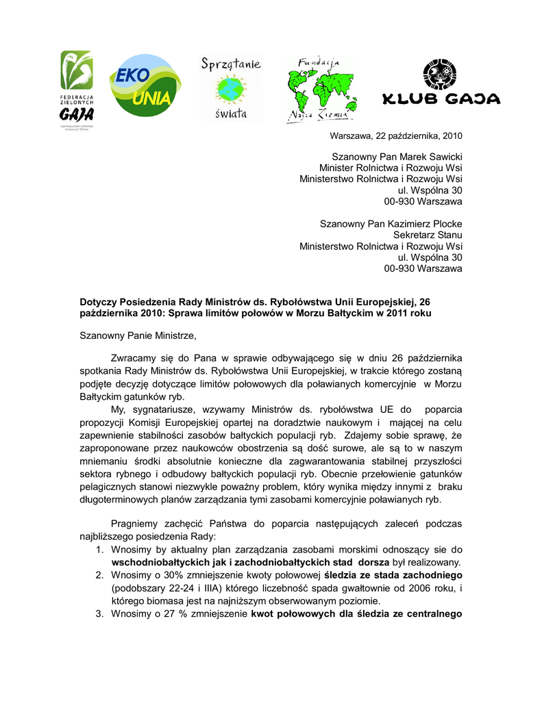 Warszawa, 22 października, 2010 Szanowny Pan Marek Sawicki Minister Rolnictwa i Rozwoju Wsi Ministerstwo Rolnictwa i Rozwoju Wsi ul. Wspólna 30 00-930 Warszawa Szanowny Pan Kazimierz Plocke Sekretarz Stanu Ministerstwo Rolnictwa i Rozwoju Wsi ul. Wspólna 30 00-930 Warszawa Dotyczy Posiedzenia Rady Ministrów ds. Rybołówstwa Unii Europejskiej, 26 października 2010: Sprawa limitów połowów w Morzu Bałtyckim w 2011 roku Szanowny Panie Ministrze, Zwracamy się do Pana w sprawie odbywającego się w dniu 26 października spotkania Rady Ministrów ds. Rybołówstwa Unii Europejskiej, w trakcie którego zostaną podjęte decyzję dotyczące limitów połowowych dla poławianych komercyjnie w Morzu Bałtyckim gatunków ryb. My, sygnatariusze, wzywamy Ministrów ds. rybołówstwa UE do poparcia propozycji Komisji Europejskiej opartej na doradztwie naukowym i mającej na celu zapewnienie stabilności zasobów bałtyckich populacji ryb. Zdajemy sobie sprawę, że zaproponowane przez naukowców obostrzenia są dość surowe, ale są to w naszym mniemaniu środki absolutnie konieczne dla zagwarantowania stabilnej przyszłości sektora rybnego i odbudowy bałtyckich populacji ryb. Obecnie przełowienie gatunków pelagicznych stanowi niezwykle poważny problem, który wynika między innymi z braku długoterminowych planów zarządzania tymi zasobami komercyjnie poławianych ryb. Pragniemy zachęcić Państwa do poparcia następujących zaleceń podczas najbliższego posiedzenia Rady: 1. Wnosimy by aktualny plan zarządzania zasobami morskimi odnoszący sie do wschodniobałtyckich jak i zachodniobałtyckich stad dorsza był realizowany. 2. Wnosimy o 30% zmniejszenie kwoty połowowej śledzia ze stada zachodniego (podobszary 22-24 i IIIA) którego liczebność spada gwałtownie od 2006 roku, i którego biomasa jest na najniższym obserwowanym poziomie. 3. Wnosimy o 27 % zmniejszenie kwot połowowych dla śledzia ze centralnego stada w centralnym Bałtyku (podobszary 25-27, 28.2, 29, 32), oraz o ustalenie limitu połowowego dla stada śledzia z Zatoki Ryskiej (podobszar 28.1) na poziomie 32,660 ton w 2011 roku. 4. Dla stada śledzia z Zatoki Botnickiej (podobszary 30 – 31) popieramy propozycję Komisji Europejskiej by ustanowić limit połowu na poziomie 91,000 ton, ze względu na fakt, że obszar ten zasiedlają dwie różne populacje śledzia a status zasobów śledzia w Zatoce Botnickiej jest niepewny. 5. Biorąc pod uwagę oddziaływania pomiędzy populacją szprota i dorsza, oraz spadek liczebności populacji szprota o 25 % porównując lata 2005/2009, wnosimy o obniżenie kwoty połowowej szprota o 36%. Propozycja zmniejszenia kwot połowowych dla szprota o 30% przedstawiona przez Komisję Europejską powinna być w tym wypadku absolutnym minimum. 6. Wnioskujemy o ograniczenia połowów dzikiego łososia, a także o deklarację, że wysiłki dążące do minimalizacji skali nielegalnych połowów będą podejmowane na poziomie krajowym. Biorąc pod uwagę fakt, że wiele populacji łososia bałtyckiego w Morzu Bałtyckim jest w złym stanie, powszechne są połowy mieszanych populacji, a wskaźnik przeżywalności osobników powracających na tarło do rzek jest niski i dodatkowo, widzimy brak obowiązującego długoterminowego planu zarządzania morskimi zasobami łososia, zalecamy 68% redukcję limitów połowu do 120,000 sztuk w głównym basenie Bałtyku i w Zatoce Botnickiej. Takie obostrzenia są zalecane także przez ICES (International Council for the Exploration of the Sea) i STECF (Scientific, Technical and Economic Committee for Fisheries). Na koniec chcielibyśmy podkreślić, że zgadzamy się ze stanowiskiem Komisji i Komisarz Damanaki w sprawie limitów połowowych na rok 2011. Wierzymy, że nadchodzące posiedzenie Rady Ministrów ds. Rybołówstwa UE będzie potwierdzeniem zaangażowania Państw Członkowskich Unii Europejskiej w działania na rzecz zapewnienia odbudowy i zachowania stabilności zasobów morskich, w okresie bezpośrednio poprzedzającym ostateczne decyzję dotyczące reformy Wspólnej Polityki Rybołówstwa Unii Europejskiej. Zwracamy się z prośbą o poparcie naszych postulatów i rekomendacji na nadchodzącym posiedzeniu Rady Ministrów ds. Rybołówstwa Unii Europejskiej, i mamy nadzieję na dalszą owocną współpracę zapewniającą efektywny wkład Polski w zrównoważoną gospodarkę zasobami Morza Bałtyckiego. Z poważaniem, Mira Stanisławska- Meysztowicz Fundacja Nasza Ziemia Anita Lasocka Fundacja Sprzątanie Świata - Polska Radosław Gawlik Stowarzyszenie Ekologiczne Eko-Unia Jakub Szumin Federacja Zielonych Gaja Jacek Bożek Klub Gaja Do wiadomości: Roman Wenerski Dyrektor Wydziału- Departament Rybołówstwa, Ministerstwo Rolnictwa i Rozwoju Wsi, ul. Wspólna 30, 00 – 930 Warszawa Roman Pitera Zastępca Dyrektora- Departament Rybołówstwa, Ministerstwo Rolnictwa i Rozwoju Wsi, ul. Wspólna 30, 00 – 930 Warszawa Janusz Wrona Zastępca Dyrektora- Departament Rybołówstwa, Ministerstwo Rolnictwa i Rozwoju Wsi, ul. Wspólna 30, 00 – 930 Warszawa Rita Kameduła-Tomaszewska Zastępca Dyrektora- Departament Rybołówstwa, Ministerstwo Rolnictwa i Rozwoju Wsi, ul. Wspólna 30, 00 – 930 Warszawa Marta Kaniewska Królak Naczelnik Wydziału Zarządzania Zasobami- Departament Rybołówstwa, Ministerstwo Rolnictwa i Rozwoju Wsi, ul. Wspólna 30, 00 – 930 Warszawa