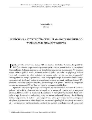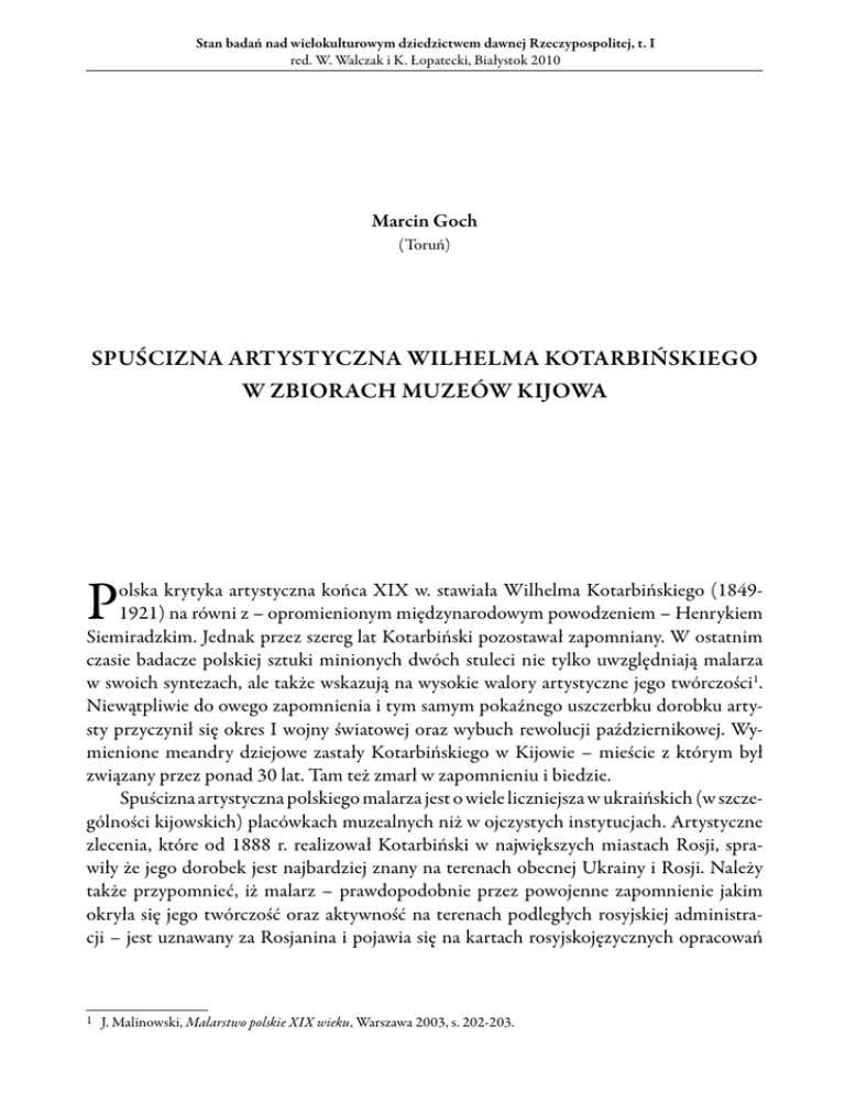 Stan badań nad wielokulturowym dziedzictwem dawnej Rzeczypospolitej, t. I red. W. Walczak i K. Łopatecki, Białystok 2010 Marcin Goch (Toruń) Spuścizna artystyczna Wilhelma Kotarbińskiego w zbiorach muzeów Kijowa P olska krytyka artystyczna końca XIX w. stawiała Wilhelma Kotarbińskiego (18491921) na równi z – opromienionym międzynarodowym powodzeniem – Henrykiem Siemiradzkim. Jednak przez szereg lat Kotarbiński pozostawał zapomniany. W ostatnim czasie badacze polskiej sztuki minionych dwóch stuleci nie tylko uwzględniają malarza w swoich syntezach, ale także wskazują na wysokie walory artystyczne jego twórczości1. Niewątpliwie do owego zapomnienia i tym samym pokaźnego uszczerbku dorobku artysty przyczynił się okres I wojny światowej oraz wybuch rewolucji październikowej. Wymienione meandry dziejowe zastały Kotarbińskiego w Kijowie – mieście z którym był związany przez ponad 30 lat. Tam też zmarł w zapomnieniu i biedzie. Spuścizna artystyczna polskiego malarza jest o wiele liczniejsza w ukraińskich (w szczególności kijowskich) placówkach muzealnych niż w ojczystych instytucjach. Artystyczne zlecenia, które od 1888 r. realizował Kotarbiński w największych miastach Rosji, sprawiły że jego dorobek jest najbardziej znany na terenach obecnej Ukrainy i Rosji. Należy także przypomnieć, iż malarz – prawdopodobnie przez powojenne zapomnienie jakim okryła się jego twórczość oraz aktywność na terenach podległych rosyjskiej administracji – jest uznawany za Rosjanina i pojawia się na kartach rosyjskojęzycznych opracowań 1 J. Malinowski, Malarstwo polskie XIX wieku, Warszawa 2003, s. 202-203. 142 Marcin Goch jako Wilhelm Aleksandrowicz Kotarbinskij2. W związku z powyższym nieodzowna stała się kwerenda w Kijowie na rzecz odtworzenia dorobku artysty, która była możliwa dzięki Departamentowi Dziedzictwa Kulturowego Ministerstwa Kultury i Dziedzictwa Narodowego, zajmującego się m.in. dokumentowaniem poloników oraz promowaniem badań naukowych dotyczących polskiego dziedzictwa kulturowego za granicą. Wilhelm Kotarbiński, wywodzący się z artystyczno-naukowej rodziny, kształcił się w warszawskiej Klasie Rysunkowej pod kierunkiem Rafała Hadziewicza3. W 1872 r. wyjechał do Rzymu, gdzie kontynuował edukację w Akademii Św. Łukasza. Wyjazd był możliwy dzięki stypendium Towarzystwa Zachęty Sztuk Pięknych w Warszawie4. Nad Tybrem przebywał do 1888 r. – w tym czasie zaprzyjaźnił się z H. Siemiradzkim, a w swojej twórczości nawiązywał do historii świata antycznego. Pod koniec pobytu w Rzymie zdobył całkiem sporą popularność. Z Italii zdecydował się wyruszyć do Kijowa, gdzie z grupą polskich i rosyjskich artystów miał udekorować sobór św. Włodzimierza. Malarz osiedlił się w zakupionym przez siebie majątku Kalsk (dawny powiat słucki, ob. Białoruś). Jednak szczególnie upodobał sobie Kijów, gdzie w czasie pobytów korzystał z apartamentu i pracowni w hotelu Praga. Utrzymywał bliskie stosunki z kijowskim środowiskiem artystycznym. Efektem dobrej współpracy było założenie około 1893 r. Towarzystwa Malarzy Kijowskich, wspólnie z Janem Stanisławskim, Janem Ursyn-Zamarajewem i Eugeniuszem Wrzeszczem5. Przełom XIX i XX w., to okres dużej popularności i licznych podróży Kotarbińskiego, determinujących realizację wielu zamówień: (…) robi częste wycieczki do Kijowa, Moskwy i Petersburga, gdzie talent jego sympatycznie przez ogół odczuty – daje mu możność zbywać swe dzieła do zbiorów publicznych i prywatnych6. Wspomniany już wybuch konfliktu światowego oraz doświadczenia rewolucji bolszewickiej, to czas wegetacji popularnego jeszcze niedawno malarza. Ponoć po zakończeniu działań wojennych, jak pisze Olgierd Budrewicz, Kotarbiński chciał wrócić na stałe z rosyjskiego Kijowa do Warszawy. Spakował nawet większość swych płócien i wysłał je do ojczyzny odzyskującej niepodległość. Prace nie dotarły pod wskazany adres, zaś samemu artyście nie udało się powrócić do kraju przodków7. Zmarł w Kijowie 4, września 1921 r. 2 Slovnik hudožnikiv Ukraini, red. M. P. Bažan, Kiiv 1973, s. 115. Warto podkreślić, że w leksykonach i słownikach wydawanych na przestrzeni ostatnich dwudziestu lat W. Kotarbiński pojawia się już jako malarz polski i ukraiński. Por. Mistectvo Ukrainy, red. A. V. Kudric’kij, Kiiv 1997, s. 326. 3 J. Wiercińska, A. Melbechowska-Luty, Wilhelm Kotarbiński, [w:] Słownik artystów polskich i obcych w Polsce działających. Malarze, rzeźbiarze, graficy, red. J. Maurin-Białostocka i J. Derwojed, t. IV, Wrocław-Warszawa-Kraków-GdańskŁódź 1986, s. 177. 4 J. Wiercińska, Katalog prac wystawionych w Towarzystwie Zachęty Sztuk Pięknych w Warszawie w latach 1860-1914, Wrocław-Warszawa-Kraków 1967, s. 167. 5 A. Król, Wilhelm Kotarbiński [w:] Kolory tożsamości. Sztuka polska z amerykańskiej kolekcji Toma Podla, Katalog wystawy, red. A. Król, A. Tanikowski, Kraków 2001, s. 48. 6 Katalog zbiorów Towarzystwa Zachęty Sztuk Pięknych w Warszawie, Warszawa 1925, s. 52. 7 O. Budrewicz, Sagi warszawskie, czyli sensacyjne i powszednie, romantyczne i prozaiczne dzieje dziesięciu wielkich rodów warszawskich, Warszawa 1967, s. 134. Spuścizna artystyczna Wilhelma Kotarbińskiego w zbiorach muzeów Kijowa 143 W najogólniejszych biogramach Wilhelma Kotarbińskiego natrafiamy na podobną charakterystykę – malarz akademicki, specjalizujący się w sztuce religijnej8. Powyższe stwierdzenie nie oddaje w pełni wszystkich aspektów dorobku artysty, gdyż obok obrazów o motywach zapożyczonych z Pisma Świętego, Kotarbiński tworzył także prace nawiązujące do uniwersalnej tematyki antycznej. Malarz lubował się w odtwarzaniu scen z życia starożytnego Wschodu, Egiptu, Grecji i Rzymu. W nielicznie zachowanej spuściźnie artystycznej pojawiają się sporadycznie pejzaże9. Należy podkreślić, że inspiracje Ko
