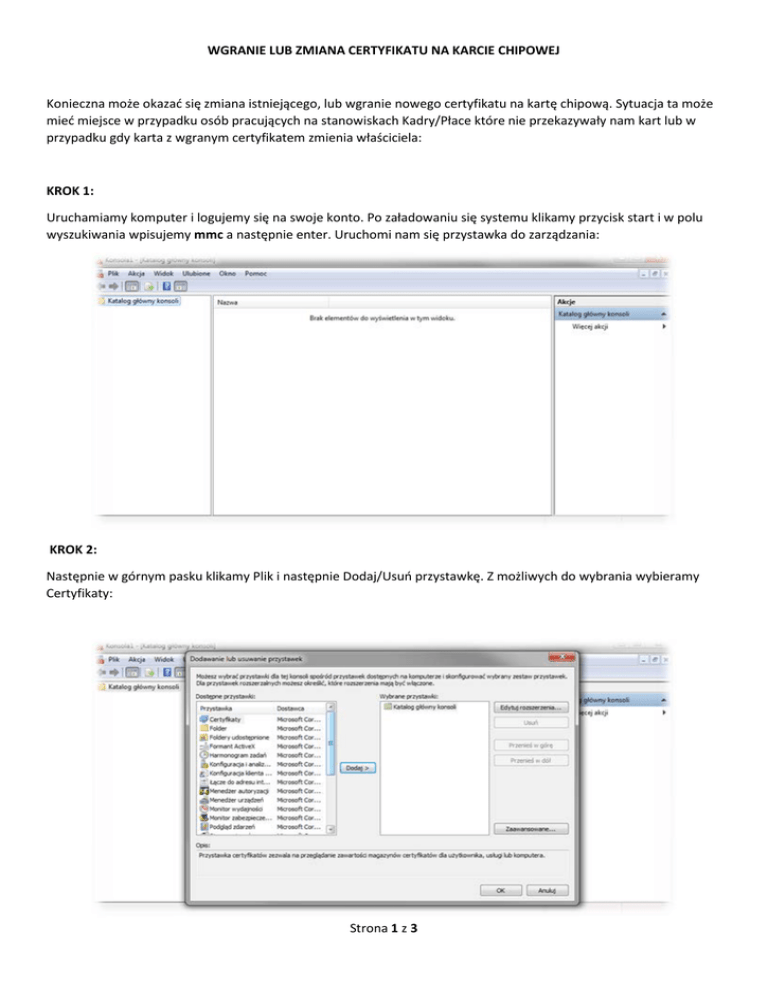 WGRANIE LUB ZMIANA CERTYFIKATU NA KARCIE CHIPOWEJ Konieczna może okazać się zmiana istniejącego, lub wgranie nowego certyfikatu na kartę chipową. Sytuacja ta może mieć miejsce w przypadku osób pracujących na stanowiskach Kadry/Płace które nie przekazywały nam kart lub w przypadku gdy karta z wgranym certyfikatem zmienia właściciela: KROK 1: Uruchamiamy komputer i logujemy się na swoje konto. Po załadowaniu się systemu klikamy przycisk start i w polu wyszukiwania wpisujemy mmc a następnie enter. Uruchomi nam się przystawka do zarządzania: KROK 2: Następnie w górnym pasku klikamy Plik i następnie Dodaj/Usuń przystawkę. Z możliwych do wybrania wybieramy Certyfikaty: Strona 1 z 3 Klikamy Dodaj a następnie potwierdzamy wybór dla „Mojego konta użytkownika”. Po ostatecznym zaakceptowaniu otrzymujemy poniższe okno: KROK 3: Wkładamy swoją kartę chipową do czytnika. Po rozwinięciu gałęzi z certyfikatami klikamy prawym przyciskiem myszy w Osobisty, następnie Wszystkie zadania i Żądaj nowego certyfikatu: Strona 2 z 3 KROK 4: Z możliwych opcji zaznaczamy „eSzkola – logowanie za pomocą karty dla użytkownika”: Klikamy Zarejestruj a następnie wpisujemy nowy PIN: Po zakończeniu całej procedury karta jest gotowa do użytku. Należy pamiętać, iż kartę można zaprogramować tylko będąc zalogowanym na swoim koncie! Strona 3 z 3