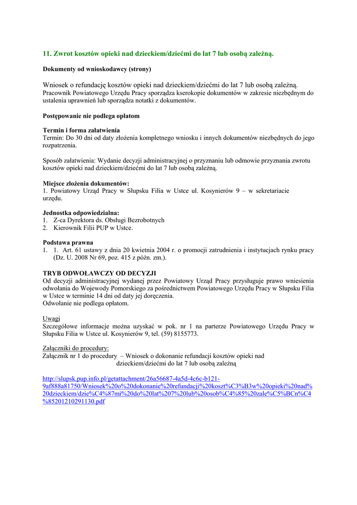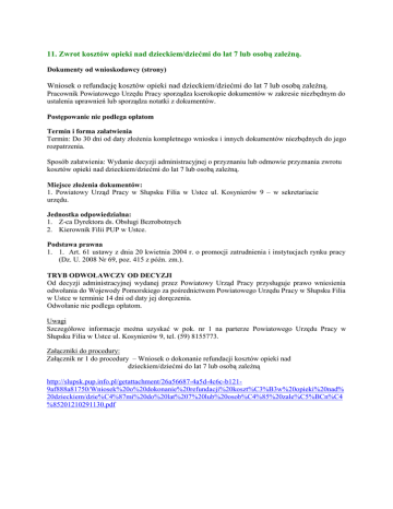 11. Zwrot kosztów opieki nad dzieckiem/dziećmi do lat 7 lub osobą zależną. Dokumenty od wnioskodawcy (strony) Wniosek o refundację kosztów opieki nad dzieckiem/dziećmi do lat 7 lub osobą zależną. Pracownik Powiatowego Urzędu Pracy sporządza kserokopie dokumentów w zakresie niezbędnym do ustalenia uprawnień lub sporządza notatki z dokumentów. Postępowanie nie podlega opłatom Termin i forma załatwienia Termin: Do 30 dni od daty złożenia kompletnego wniosku i innych dokumentów niezbędnych do jego rozpatrzenia. Sposób załatwienia: Wydanie decyzji administracyjnej o przyznaniu lub odmowie przyznania zwrotu kosztów opieki nad dzieckiem/dziećmi do lat 7 lub osobą zależną. Miejsce złożenia dokumentów: 1. Powiatowy Urząd Pracy w Słupsku Filia w Ustce ul. Kosynierów 9 – w sekretariacie urzędu. Jednostka odpowiedzialna: 1. Z-ca Dyrektora ds. Obsługi Bezrobotnych 2. Kierownik Filii PUP w Ustce. Podstawa prawna 1. 1. Art. 61 ustawy z dnia 20 kwietnia 2004 r. o promocji zatrudnienia i instytucjach rynku pracy (Dz. U. 2008 Nr 69, poz. 415 z późn. zm.). TRYB ODWOŁAWCZY OD DECYZJI Od decyzji administracyjnej wydanej przez Powiatowy Urząd Pracy przysługuje prawo wniesienia odwołania do Wojewody Pomorskiego za pośrednictwem Powiatowego Urzędu Pracy w Słupsku Filia w Ustce w terminie 14 dni od daty jej doręczenia. Odwołanie nie podlega opłatom. Uwagi Szczegółowe informacje można uzyskać w pok. nr 1 na parterze Powiatowego Urzędu Pracy w Słupsku Filia w Ustce ul. Kosynierów 9, tel. (59) 8155773. Załączniki do procedury: Załącznik nr 1 do procedury – Wniosek o dokonanie refundacji kosztów opieki nad dzieckiem/dziećmi do lat 7 lub osobą zależną http://slupsk.pup.info.pl/getattachment/26a56687-4a5d-4c6c-b1219af888a81750/Wniosek%20o%20dokonanie%20refundacji%20koszt%C3%B3w%20opieki%20nad% 20dzieckiem/dzie%C4%87mi%20do%20lat%207%20lub%20osob%C4%85%20zale%C5%BCn%C4 %85201210291130.pdf