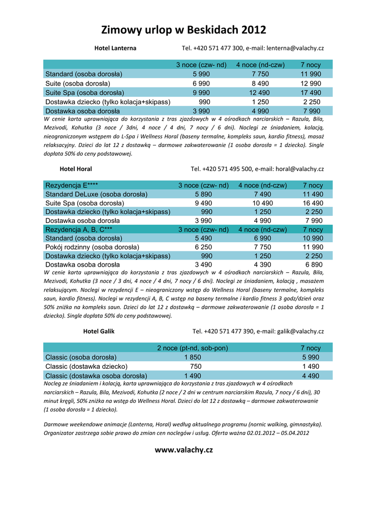 Zimowy urlop w Beskidach 2012 Hotel Lanterna Tel. +420 571 477 300, e-mail: [email protected] Standard (osoba dorosła) Suite (osoba dorosła) Suite Spa (osoba dorosła) Dostawka dziecko (tylko kolacja+skipass) Dostawka osoba dorosła 3 noce (czw- nd) 5 990 6 990 9 990 990 3 990 4 noce (nd-czw) 7 750 8 490 12 490 1 250 4 990 7 nocy 11 990 12 990 17 490 2 250 7 990 W cenie karta uprawniająca do korzystania z tras zjazdowych w 4 ośrodkach narciarskich – Razula, Bila, Mezivodi, Kohutka (3 noce / 3dni, 4 noce / 4 dni, 7 nocy / 6 dni). Noclegi ze śniadaniem, kolacją, nieograniczonym wstępem do L-Spa i Wellness Horal (baseny termalne, kompleks saun, kardio fitness), masaż relaksacyjny. Dzieci do lat 12 z dostawką – darmowe zakwaterowanie (1 osoba dorosła = 1 dziecko). Single dopłata 50% do ceny podstawowej. Hotel Horal Tel. +420 571 495 500, e-mail: [email protected] Rezydencja E**** Standard DeLuxe (osoba dorosła) Suite Spa (osoba dorosła) Dostawka dziecko (tylko kolacja+skipass) Dostawka osoba dorosła Rezydencja A, B, C*** Standard (osoba dorosła) Pokój rodzinny (osoba dorosła) Dostawka dziecko (tylko kolacja+skipass) Dostawka osoba dorosła 3 noce (czw- nd) 5 890 9 490 990 3 990 3 noce (czw- nd) 5 490 6 250 990 3 490 4 noce (nd-czw) 7 490 10 490 1 250 4 990 4 noce (nd-czw) 6 990 7 750 1 250 4 390 7 nocy 11 490 16 490 2 250 7 990 7 nocy 10 990 11 990 2 250 6 890 W cenie karta uprawniająca do korzystania z tras zjazdowych w 4 ośrodkach narciarskich – Razula, Bila, Mezivodi, Kohutka (3 noce / 3 dni, 4 noce / 4 dni, 7 nocy / 6 dni). Noclegi ze śniadaniem, kolacją , masażem relaksującym. Noclegi w rezydencji E – nieograniczony wstęp do Wellness Horal (baseny termalne, kompleks saun, kardio fitness). Noclegi w rezydencji A, B, C wstęp na baseny termalne i kardio fitness 3 godz/dzień oraz 50% zniżka na kompleks saun. Dzieci do lat 12 z dostawką – darmowe zakwaterowanie (1 osoba dorosła = 1 dziecko). Single dopłata 50% do ceny podstawowej. Hotel Galik Classic (osoba dorosła) Classic (dostawka dziecko) Classic (dostawka osoba dorosła) Tel. +420 571 477 390, e-mail: [email protected] 2 noce (pt-nd, sob-pon) 1 850 750 1 490 7 nocy 5 990 1 490 4 490 Nocleg ze śniadaniem i kolacją, karta uprawniająca do korzystania z tras zjazdowych w 4 ośrodkach narciarskich – Razula, Bila, Mezivodi, Kohutka (2 noce / 2 dni w centrum narciarskim Razula, 7 nocy / 6 dni), 30 minut kręgli, 50% zniżka na wstęp do Wellness Horal. Dzieci do lat 12 z dostawką – darmowe zakwaterowanie (1 osoba dorosła = 1 dziecko). Darmowe weekendowe animacje (Lanterna, Horal) według aktualnego programu (nornic walking, gimnastyka). Organizator zastrzega sobie prawo do zmian cen noclegów i usług. Oferta ważna 02.01.2012 – 05.04.2012 www.valachy.cz
