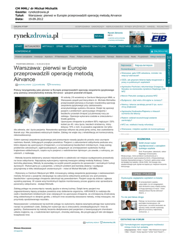 CM MML/ dr Micha³ Michalik Gazeta: rynekzdrowia.pl Tytu³: Warszawa: pierwsi w Europie przeprowadzili operacjê metod¹ Airvance Data: 19.09.2012 GRUPA PTWP GOSPODARKA SAMORZĄDY NIERUCHOMOŚCI RYNEK SPOŻYWCZY HANDEL ROLNICTWO Rynek Zdrowia NR 9 SZUKAJ Partner portalu: » zamów prenumeratę » numery archiwalne START AKTUALNOŚCI ARTYKUŁY OPINIE MIESIĘCZNIK SERWISY TEMATYCZNE PRACA PRZETARGI GIEŁDA FORUM KONFERENCJE Finanse i zarządzanie ZALOGUJ SIĘ Inwestycje Aparatura IT/Telemedycyna Prawo Polityka zdrowotna Ubezpieczenia Farmacja PWX/RYNEK ZDROWIA | 18-09-2012 08:50 prześlij dalej Nauka Najnowsze Warszawa: pierwsi w Europie przeprowadzili operację metodą Airvance wydrukuj artykuł Badania i rozwój Po godzinach Usługi medyczne Najpopularniejsze Komentowane » Warszawa: gala CZD odwołana, minister nie wręczył odznaczeń » OZZL: jak grupowo lekarze będą rezygnować z pracy w publicznych szpitalach 0 komentarzy Polscy laryngolodzy jako pierwsi w Europie przeprowadzili operację zespolenia językowego przy pomocy amerykańskiej metody Airvance - pacjent przestał chrapać. W sobotę (15 września) w Centrum Medycznym MML w Warszawie zespół pod kierunkiem dr. Michała Michalika przeprowadził pierwszą w Europie nowatorską operację zespolenia językowego przy zastosowaniu amerykańskiego systemu Airvance. Dzięki tej operacji pacjent z problemem uporczywego chrapania i bezdechu przestał chrapać już pierwszej nocy po zabiegu. Operacja wykonana została w znieczuleniu i trwała godzinę. Uporczywe chrapanie to problem 80% mężczyzn i 30% kobiet po 40. roku życia, bezdech śródsenny, który dotyczy 10% z nich, to poważne zagrożenie nie tylko dla zdrowia, ale i życia pacjenta. Nowatorska operacja odbywa się przez jamę ustną, bez uszkodzenia tkanek szyi. Nie pozostawia widocznych śladów. Zabieg nie wiąże się z rehabilitacją ani koniecznością rekonwalescencji. Celem operacji zespolenia językowego jest przesunięcie nasady języka do przodu oraz usunięcie nadmiaru tkanek, blokujących przepływ powietrza. Pacjenci z zaburzeniami oddychania podczas snu, które objawia się uporczywym chrapaniem, a w konsekwencji bezdechem śródsennym, mają szereg problemów zdrowotnych, ogólnoustrojowych, związanych ze zmniejszeniem wydolności funkcji krążeniowo-oddechowych, często są to pacjenci z nadciśnieniem tętniczym, po zawale, z cukrzycą, po udarach, z nadwagą. - Metodę leczenia dobieramy zawsze indywidualnie w zależności od miejsca występowania przeszkody na torze oddychania. Najczęściej wykonujemy najmniej inwazyjne zabiegi metodą Koblacji, Celon, techniką plazmową. Metody te pozwalają na szybki powrót pacjenta do sprawności i normalnych funkcji życiowych. Wykonujemy je u pacjentów, u których problem jest bardziej złożony i występuje przynajmniej w kilku lokalizacjach anatomicznych - mówi dr Michał Michalik z CM MML. - Wykonany w Centrum Medycznym MML innowacyjny zabieg zespolenia językowego z zastosowaniem metody Airvance u pacjenta cierpiącego na zaburzenia oddychania podczas snu pod postacią bezdechów i uporczywego chrapania zakończył się powodzeniem. Pacjent czuje się dobrze i zgłasza wyraźną poprawę. W czasie wizyt kontrolnych będzie monitorowany proces gojenia oraz sprawdzane parametry oddychania - dodaje Michalik. Zabieg polega na przesunięciu nasady języka w stronę żuchwy. Dzięki temu pacjent ma zagwarantowany lepszy przepływ powietrza oraz dotlenienie organizmu. AIRVANCE to nadzieja dla osób z bezdechami śródsennymi oraz cierpiących na uporczywe chrapanie, ze zmniejszoną drożnością dróg oddechowych w obrębie gardła, u których inne wcześniej stosowane metody, mniej inwazyjne, nie przyniosły spodziewanego rezultatu. Nowoczesność i unikatowość tej techniki polega na wykonaniu dojścia wewnątrzustnego bez wykonania nacięć na powłokach ciała. Zabieg ten wykonuje się w znieczuleniu anestezjologicznym i trwa do godziny. Zastosowanie tej metody leczenia dedykowane jest pacjentom z towarzyszącymi chorobami układu krążenia, np. z nadciśnieniem tętniczym, chorobą wieńcową, dla przyjmujących leki obniżające krzepliwość krwi. » Agnieszka Pachciarz rekomenduje Grzegorza Nowaka na stanowisko dyrektora Śląskiego OW NFZ » Marcin Pakulski zastępcą prezesa NFZ » Bydgoszcz: zbyt wielu chirurgów w Juraszu? » Niemcy: lekarze zarabiają ponad 5 tys. euro i chcą strajkować » Agnieszka Kozłowska-Rajewicz o klauzuli sumienia dla lekarzy » Radom: oddział neurochirurgii zostanie zamknięty? » NFZ ws. wielkości kwoty refundacji » Warszawa: miejskie szpitale do komercjalizacji ROZMOWA SUM chciał nadal współpracować z zarządem tyskiego szpitala Prof. Przemysław Jałowiecki, rektor Śląskiego Uniwersytetu Medycznego, mówi portalowi rynekzdrowia.pl o okolicznościach wyprowadzenia klinik z Wojewódzkiego Szpitala Specjalistycznego w Tychach, gdzie przez wiele lat działały trzy katedry i kliniki SUM. Od nowego roku akademickiego tyski szpital nie będzie już miejscem leczenia klinicznego. OPINIE I POLEMIKI Dyskusyjne zaglądanie szpitalom w koszty W amerykańskim szpitalu usłyszałem, że ich osiągnięciem było skrócenie czasu między jedną a drugą operacją o 8 minut - mówi miesięcznikowi Rynek Zdrowia* Adam(...) To nie jest łatwa droga Patrząc na lecznictwo wyłącznie pod kątem komercyjnym, nie wykluczam, że może dochodzić do sytuacji, kiedy ośrodki wybierają głównie procedury najbardziej rentowne(...) OSTATNIO NA FORUM wydrukuj artykuł Słowa kluczowe chrapanie skomentuj (0) Farmakologiczne wspomaganie możliwości mózgu może być pułapką catyuopwoex, <html> <head> <title>Welcome to nginx! </title> </head> <body bgcolor="white" text="black">... CM MML/ dr Micha³ Michalik Gazeta: rynekzdrowia.pl Tytu³: Warszawa: pierwsi w Europie przeprowadzili operacjê metod¹ Airvance Data: 19.09.2012 Czechy: resort zdrowia publikuje etykiety alkoholi - na