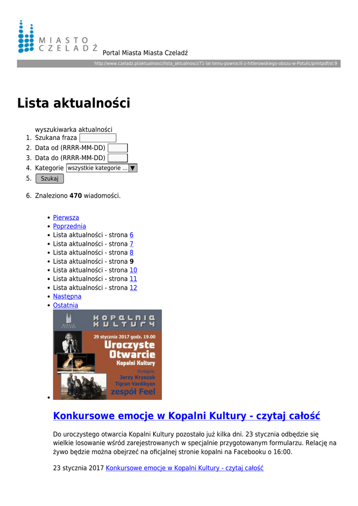 Portal Miasta Miasta Czeladź http://www.czeladz.pl/aktualnosci/lista_aktualnosci/71-lat-temu-powrocili-z-hitlerowskiego-obozu-w-Potulic/printpdf/st:9 Lista aktualności wyszukiwarka aktualności 1. Szukana fraza 2. Data od (RRRR-MM-DD) 3. Data do (RRRR-MM-DD) 4. Kategorie wszystkie kategorie ... ▼ 5. Szukaj 6. Znaleziono 470 wiadomości. Pierwsza Poprzednia Lista aktualności - strona 6 Lista aktualności - strona 7 Lista aktualności - strona 8 Lista aktualności - strona 9 Lista aktualności - strona 10 Lista aktualności - strona 11 Lista aktualności - strona 12 Następna Ostatnia Konkursowe emocje w Kopalni Kultury - czytaj całość Do uroczystego otwarcia Kopalni Kultury pozostało już kilka dni. 23 stycznia odbędzie się wielkie losowanie wśród zarejestrowanych w specjalnie przygotowanym formularzu. Relację na żywo będzie można obejrzeć na oficjalnej stronie kopalni na Facebooku o 16:00. 23 stycznia 2017 Konkursowe emocje w Kopalni Kultury - czytaj całość Rocznica wybuchu powstania styczniowego - czytaj całość W południe, 23 stycznia pod krzyżem przy ul. Nowopogońskiej na Piaskach oddaliśmy hołd bohaterom powstania styczniowego. 23 stycznia 2017 Rocznica wybuchu powstania styczniowego - czytaj całość Oświadczenie o rocznej wartości sprzedaży napojów alkoholowych tylko do 31 stycznia - czytaj całość Jeśli sprzedajesz napoje alkoholowe powinieneś pamiętać, że na początku każdego roku jesteś zobowiązany złożyć pisemne oświadczenie o wartości sprzedaży poszczególnych rodzajów napojów alkoholowych za rok poprzedni oraz wnieść opłaty za zezwolenie na sprzedaż napojów alkoholowych. 20 stycznia 2017 Oświadczenie o rocznej wartości sprzedaży napojów alkoholowych tylko do 31 stycznia - czytaj całość Nagrodzono najpiękniejsze iluminacje - czytaj całość Podczas 25. Finału Wielkiej Orkiestry Świątecznej Pomocy na czeladzkim rynku poznaliśmy autorów najpiękniejszych iluminacji świątecznym. 19 stycznia 2017 Nagrodzono najpiękniejsze iluminacje - czytaj całość "Zabytek Zadbany" - czytaj całość Trwa kolejna edycja ogólnopolskiego konkursu Ministerstwa Kultury i Dziedzictwa Narodowego oraz Generalnego Konserwatora Zabytków „Zabytek Zadbany”. 17 stycznia 2017 "Zabytek Zadbany" - czytaj całość Spotkanie z Andriollim w Muzeum Saturn - czytaj całość Do końca lutego w Muzeum Saturn można oglądać wyjątkową wystawę poświęconą życiu i twórczości Elwiro Michała Andriollego, użyczoną przez Muzeum Biograficzne Elwiro Michała Andriollego z siedzibą w Józefowie. 17 stycznia 2017 Spotkanie z Andriollim w Muzeum Saturn - czytaj całość WOŚP - znów zagraliśmy na rekord! - czytaj całość Na ostateczny wynik trzeba będzie jeszcze zaczekać, ale już teraz wiadomo, że w ramach zbiórki na rzecz Wielkiej Orkiestry Świątecznej Pomocy pobiliśmy w Czeladzi kolejny rekord. 16 stycznia 2017 WOŚP - znów zagraliśmy na rekord! - czytaj całość Uwaga Konkurs! - czytaj całość 29 stycznia 2017 roku o godzinie 19.00 odbędzie się uroczyste otwarcie Kopalni Kultury, od poniedziałku 16 stycznia można wygrać możliwość zakupu biletu na to wydarzenie. 16 stycznia 2017 Uwaga Konkurs! - czytaj całość Zakład Inżynierii Komunalnej szuka pracownika - czytaj całość Prezes Zarządu Zakładu Inżynierii komunalnej sp. z o.o. w Czeladzi ogłasza nabór na wolne stanowisko pracy 13 stycznia 2017 Zakład Inżynierii Komunalnej szuka pracownika - czytaj całość Konkurs wiedzy o prawie wyborczym - czytaj całość "Wybieram Wybory" pod takim hasłem odbywa się ogólnopolski konkurs wiedzy o prawie wyborczym dla uczniów szkół ponadgimnazjalnych. 12 stycznia 2017 Konkurs wiedzy o prawie wyborczym - czytaj całość Pierwsza Poprzednia Lista aktualności - strona 6 Lista aktualności - strona 7 Lista aktualności - strona 8 Lista aktualności - strona 9 Lista aktualności - strona 10 Lista aktualności - strona 11 Lista aktualności - strona 12 Następna Ostatnia