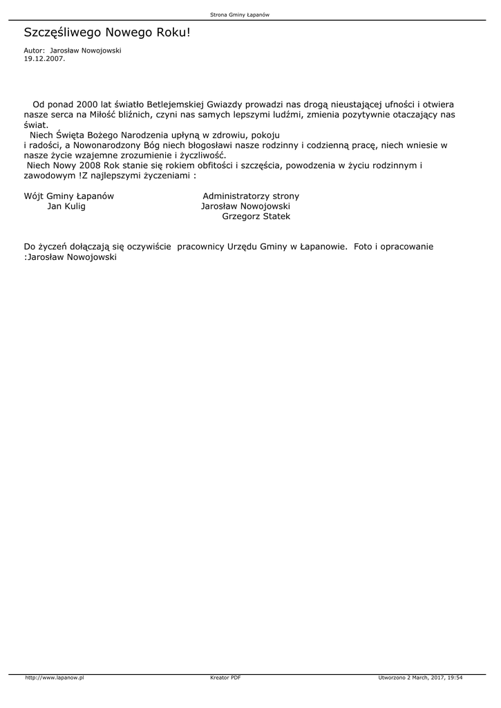 Strona Gminy Łapanów Szczęśliwego Nowego Roku! Autor: Jarosław Nowojowski 19.12.2007. Od ponad 2000 lat światło Betlejemskiej Gwiazdy prowadzi nas drogą nieustającej ufności i otwiera nasze serca na Miłość bliźnich, czyni nas samych lepszymi ludźmi, zmienia pozytywnie otaczający nas świat. Niech Święta Bożego Narodzenia upłyną w zdrowiu, pokoju i radości, a Nowonarodzony Bóg niech błogosławi nasze rodzinny i codzienną pracę, niech wniesie w nasze życie wzajemne zrozumienie i życzliwość. Niech Nowy 2008 Rok stanie się rokiem obfitości i szczęścia, powodzenia w życiu rodzinnym i zawodowym !Z najlepszymi życzeniami : Wójt Gminy Łapanów Jan Kulig Administratorzy strony Jarosław Nowojowski Grzegorz Statek Do życzeń dołączają się oczywiście pracownicy Urzędu Gminy w Łapanowie. Foto i opracowanie :Jarosław Nowojowski http://www.lapanow.pl Kreator PDF Utworzono 2 March, 2017, 19:54