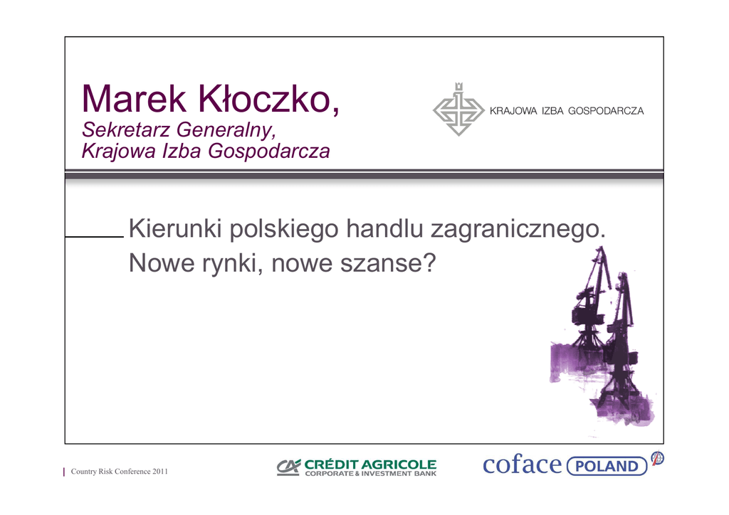 Marek Kłoczko, Sekretarz Generalny, Krajowa Izba Gospodarcza Kierunki polskiego handlu zagranicznego. Nowe rynki, nowe szanse? Country Risk Conference 2011 Krajowa Izba Gospodarcza Art. 2 USTAWY z dnia 30 maja 1989 r. o izbach gospodarczych „Izba gospodarcza jest organizacją samorządu gospodarczego, reprezentującą interesy gospodarcze zrzeszonych w niej podmiotów w zakresie ich działalności wytwórczej, handlowej, budowlanej lub usługowej, w szczególności wobec organów państwowych.” Członkowie Krajowej Izby Gospodarczej w tym: – 152 » Izby regionalne i lokalne – 50 » Izby branŜowe – 65 » Izby dwu- i wielostronne – 18 » Inne organizacje – 19 Country Risk Conference 2011 Krajowa Izba Gospodarcza Podstawowe obszary działania » Polityka gospodarcza » Sprawy członkowskie » Legalizacja dokumentów » ArbitraŜ gospodarczy » Wywiadownia handlowa » Szkolenia » Wydawnictwa » Współpraca z Zagranicą i promocja Country Risk Conference 2011 Krajowa Izba Gospodarcza Podstawowe obszary działania » Udział w targach i wystawach międzynarodowych » Organizacja misji gospodarczych » Organizacja konferencji, forów, sympozjów, seminariów » Szkolenia » EXPO 2000 i 2005 » Europejski Szczyt Gospodarczy 28-30.04. 2004 » Kompleksowe pakiety promocyjne » Konkursy: Mister Eksportu, Polska Nagroda Jakości, Akademia Marek, Fair Play, Bank Przyjazny dla Przedsiębiorców, Wybitny Polski Eksporter » Projekt Marka Polska Country Risk Conference 2011 Obroty polskiego handlu zagranicznego w latach 1991-2010 250000 200000 mln USD 150000 100000 50000 0 -50000 1991 1992 1993 1994 1995 1996 1997 1998 1999 2000 2001 2002 2003 2004 2005 2006 2007 2008 2009 2010 est -100000 Export Country Risk Conference 2011 Import Saldo % Udział Polski w handlu światowym Country Risk Conference 2011 EURO Export per capita dla UE-27 (2010) 3850 Country Risk Conference 2011 Kierunki geograficzne polskiego eksportu Country Risk Conference 2011 Główni partnerzy eksportowi Polski Country Risk Conference 2011 Nowe rynki Wymiana handlowa Polska-Chiny 11254 12000 9983 mld USD 10000 8515 8000 6000 Export 4000 Import 2000 722 867 1051 0 2007 Country Risk Conference 2011 2008 2009 Nowe rynki Wymiana handlowa Polska-kraje arabskie mln USD 2500 2180,65 2000 1547,74 1500 1302,01 1166,09 Export 1000 668,76 661,63 500 0 2007 Country Risk Conference 2011 2008 2009 Import Nowe rynki Wymiana handlowa Polska-Brazylia 800 mln USD 707 680,1 700 677,2 600 465 500 400 300 Export 275 200,3 200 100 0 2007 Country Risk Conference 2011 2008 2009 Import Nowe rynki Wymiana handlowa Polska-Indie 1200 976,1 mln USD 1000 803,6 800 699,7 600 Export 400 200 298,6 337,3 162,1 0 2007 Country Risk Conference 2011 2008 2009 Import Nowe rynki Wymiana handlowa Polska-Wietnam 600 529,8 tys. USD 500 418,3 374 400 300 Export 200 100 126,4 108,2 68,3 0 2007 Country Risk Conference 2011 2008 2009 Import Boryszew/Impexmetal KLUCZOWE ETAPY 1996 1999 2001-2003 Boryszew wchodzi na Giełdę Papierów Wartościowych jako znany producent płynu chłodnicowy BORYGO Boryszew pozyskuje inwestora strategiczneg o - Pana Romana Karkosika Przejęcia obejmujące: - Elana (poliestery i polimery) - Huta Oława (tlenki cynku i ołowiu) Nagroda „Byka i Niedźwiedzia” w kategorii: "Najlepsza inwestycja w spółkę giełdową w 2003 roku" 2005 2005 2007 2007-2009 Utworzenie oddziału w Sochaczewieoddzielenie produkcji od siedziby zarządu i pozostałej działalności holdingu Przydzielenie Oddziału Boryszew w Sochaczewie ERG Boryszew -100% zaleŜności Wiele zmian na rzecz restrukturyzacji kapitałowych, w tym zmian własnościowych w ramach grupy Przejęcie Grupy Impexmetal największego polski ego producenta półproduktów z metali nieŜelaznych Country Risk Conference 2011 2003 2005 Połączenie Elana z Hutą Oława – stają się nowymi oddziałami Boryszewa 2010 Dalsza poprawa wyników finansowych Pozyskanie Grupy Maflow 2011 Nowe przejęcia w ramach przemysłu motoryzacyjneg o w trakcie analiz Boryszew/Impexmetal LOKALIZACJA SPÓŁEK Country Risk Conference 2011 Grupa Maspex Wadowice Grupa Maspex Wadowice jest jedną z największych firm w Europie Środkowo – Wschodniej w segmencie produktów spoŜywczych. Spółka jest zdecydowanym liderem na rynku producentów soków, nektarów i napojów w Polsce, w Czechach, na Słowacji, czołowym producentem na Węgrzech, w Rumunii i Bułgarii. Jest równieŜ wiodącym producentem produktów instant (kawa cappuccino, kakao, zabielacze w proszku do kawy, herbatki rozpuszczalne) w Europie ŚrodkowoWschodniej. Maspex to takŜe lider na rynku makaronów w Polsce oraz ich wiodący producent w Rumunii. Firma stawia na niezmienną od lat strategię, czyli na budowę marek, które są silnie zakorzenione w świadomości konsumentów i realizację projektów akwizycji, które mogą ją powiększyć i rozbudować jej ofertę produktów markowych. Grupa Maspex Wadowice, w ciągu ponad 20 lat obecności na rynku, przeprowadziła 14 akwizycji, w tym 8 za granicą. Marki takie jak: Tymbark, Kubuś, Lubella, Puchatek, Ekland, DecoMorreno, Cremona, La Festa i Plusssz to zdecydowani liderzy w swoich kategoriach, produkty, które cieszą się ogromnym zaufaniem konsumentów nie tylko w Polsce, ale równieŜ w innych krajach Europy Środkowo – Wschodniej. Country Risk Conference 2011 Grupa Maspex Wadowice HISTORIA 1990 1995 Powstanie firmy Maspex/ Wadowice Zakup spółki Polska śywność w Olsztynku oraz marki Kubuś 2005 Zakup spółki Queen’s, wiodącego producenta soków w Bułgarii Przejęcie udziałów węgierskiej firmy Plusssz Vitamin Kft – właściciela marki Plusssz, lidera na węgierskim rynku musujących preparatów witaminowych – oraz marki Apenta, jednego z najstarszych znaków towarowych na węgierskim rynku wody mineralnej. Country Risk Conference 2011 1998-1999 Inwestycje na rynkach zagranicznych. Na Węgrzech, w Czechach, następnie Rumunii i na Słowacji powstają pierwsze zagraniczne