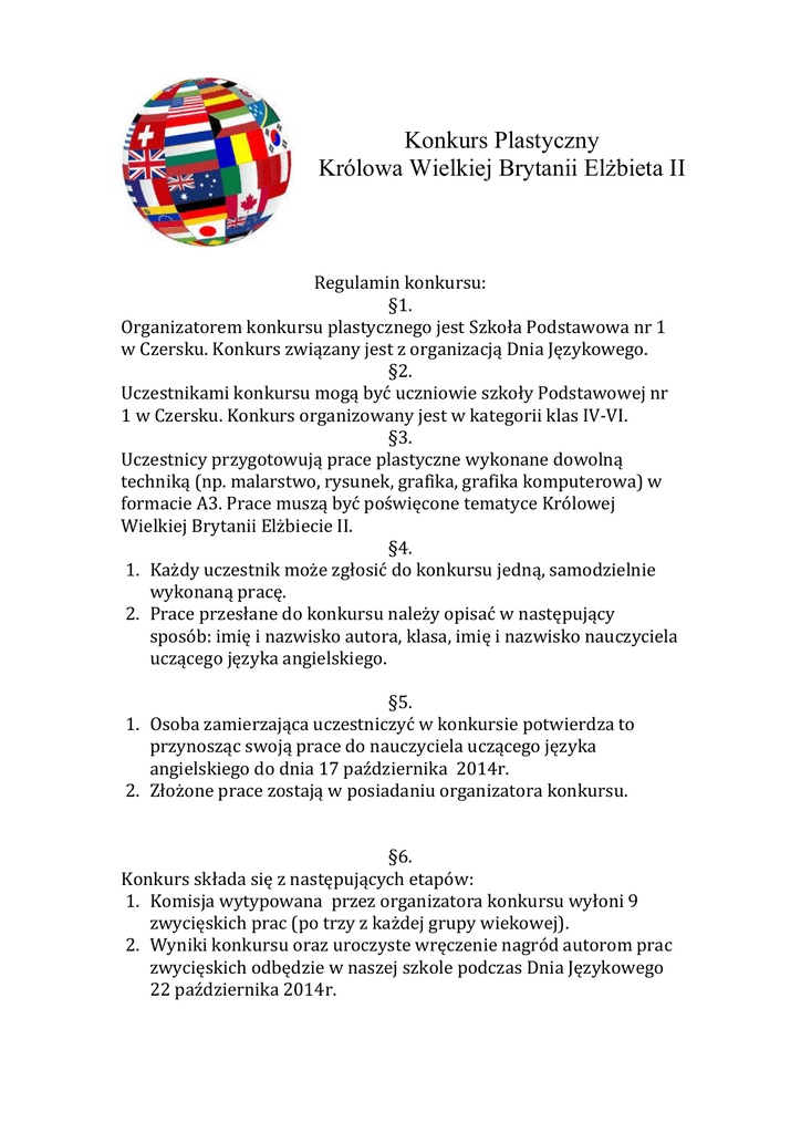 Konkurs Plastyczny Królowa Wielkiej Brytanii Elżbieta II Regulamin konkursu: §1. Organizatorem konkursu plastycznego jest Szkoła Podstawowa nr 1 w Czersku. Konkurs związany jest z organizacją Dnia Językowego. §2. Uczestnikami konkursu mogą być uczniowie szkoły Podstawowej nr 1 w Czersku. Konkurs organizowany jest w kategorii klas IV-VI. §3. Uczestnicy przygotowują prace plastyczne wykonane dowolną techniką (np. malarstwo, rysunek, grafika, grafika komputerowa) w formacie A3. Prace muszą być poświęcone tematyce Królowej Wielkiej Brytanii Elżbiecie II. §4. 1. Każdy uczestnik może zgłosić do konkursu jedną, samodzielnie wykonaną pracę. 2. Prace przesłane do konkursu należy opisać w następujący sposób: imię i nazwisko autora, klasa, imię i nazwisko nauczyciela uczącego języka angielskiego. §5. 1. Osoba zamierzająca uczestniczyć w konkursie potwierdza to przynosząc swoją prace do nauczyciela uczącego języka angielskiego do dnia 17 października 2014r. 2. Złożone prace zostają w posiadaniu organizatora konkursu. §6. Konkurs składa się z następujących etapów: 1. Komisja wytypowana przez organizatora konkursu wyłoni 9 zwycięskich prac (po trzy z każdej grupy wiekowej). 2. Wyniki konkursu oraz uroczyste wręczenie nagród autorom prac zwycięskich odbędzie w naszej szkole podczas Dnia Językowego 22 października 2014r. §7. Nagrodzone prace zostaną wyeksponowane na wystawie zorganizowanej w szkole. §8. Zwycięzcy konkursu otrzymają atrakcyjne nagrody rzeczowe. §9. Biorąc udział w konkursie uczestnik wyraża zgodę na zastosowanie się do niniejszego regulaminu. §10. 1. Nadesłanie prac oznacza akceptację warunków konkursu i regulaminu, którego ostateczna interpretacja należy do jury konkursu. 2. Udział w konkursie jest równoznaczny z wyrażeniem przez osoby uczestniczące zgody na przetwarzanie przez organizatora ich danych osobowych na potrzeby konkursu oraz w celach marketingowych organizatora /ustawa o ochronie danych osobowych z dn.28.09.1997 r. Dz.U. Nr 133 poz. 833 z póz. zm./. SERDECZNIE ZAPRASZAMY DO WZIĘCIA UDZIAŁU W NASZYM KONKURSIE.
