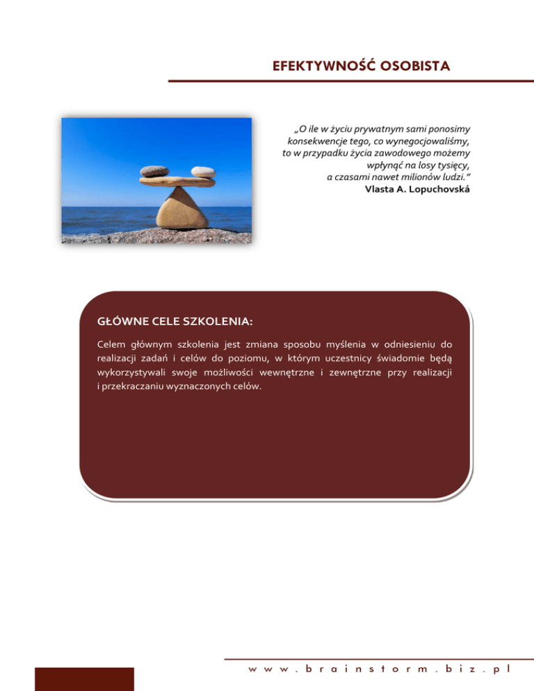 EFEKTYWNOŚĆ OSOBISTA „O ile w życiu prywatnym sami ponosimy konsekwencje tego, co wynegocjowaliśmy, to w przypadku życia zawodowego możemy wpłynąć na losy tysięcy, a czasami nawet milionów ludzi.” Vlasta A. Lopuchovská GŁÓWNE CELE SZKOLENIA: Celem głównym szkolenia jest zmiana sposobu myślenia w odniesieniu do realizacji zadań i celów do poziomu, w którym uczestnicy świadomie będą wykorzystywali swoje możliwości wewnętrzne i zewnętrzne przy realizacji i przekraczaniu wyznaczonych celów. Uczestnicy zdobędą kompetencje na trzech poziomach: Na poziomie wiedzy uczestnicy : 1. Dowiedzą się, w jakim stopniu ich własna wizja i misja wpływa na realizację ich celów 2. Poznają, jaką wagę odgrywa uświadomienie sobie ról, jakie pełnią w życiu i które z tych ról wspierają, a które ograniczają ich działania w kierunku realizacji ich celów 3. Poznają metodę kompasu i kalendarza oraz dowiedzą się, czym są tzw. „dzwonki alarmowe” 4. Dowiedzą się, jak wykorzystać kręgi wpływu w odniesieniu do realizacji swoich celów 5. Dowiedzą się, jak planowanie zadań w odniesieniu do celów, ról oraz misji i wizji wpływa na realizację zadań biznesowych Na poziomie umiejętności uczestnicy : 1. Będą potrafić świadomie budować swój plan dnia i tygodnia z uwzględnieniem zadań, które w największym stopniu przybliżają ich do realizacji ich celów biznesowych, 2. Przećwiczą tworzenie mapy czynników, które wspierają i które ograniczają realizację celu biznesowego 3. Będą dążyć do celu, a nawet go przekraczać uświadamiając sobie, jak ten cel jest wspierany przez misję i wizję oraz role życiowe Na poziomie postawy uczestnicy : 1. Przekonają się, iż to, czy realizują cel zależy przede wszystkim od nich samych i od tego, jakie działania w tym kierunku podejmują 2. Uświadomią sobie, iż realizacja niektórych celów wspierana jest przez zewnętrzną wolę, aby przybliżać się do realizacji własnych celów biznesowych wpisanych w swoją misję i wizję 2 PROGRAM SZKOLENIA EFEKTYWNOŚĆ OSOBISTA MODUŁ 1. PIERWSZY NAWYK - BĄDŹ PROAKTYWNY OPIS Pętle wspierające vs. pętle ograniczające realizację moich celów biznesowych Siła wyobrażenia i twórczej wizualizacji w zmianie postawy Burza mózgów + dyskusja moderowana Jak przekraczać granice i przezwyciężać ograniczenia, które wynikają z mojego doświadczenia Mini wykład Etapy postępowania przy świadomym przejściu z postawy reaktywnej do proaktywnej Tworzenie map „dobrych praktyk” 2. DRUGI I TRZECI NAWYK – Jak definiować, redefiniować bądź operacjonalizować cele, aby zawsze mieć wizję końca ZACZYNAJ Z WIZJĄ Dlaczego i jak wizja końca wpływa na realizację celów KOŃCA I WYKONUJ Case study NAJPIERW RZECZY Macierz Eisenhovera, Krzywa REFA i zasada ABC jako NAJWAŻNIEJSZE narzędzia przydatne w wyłanianiu czynności i zadań które w największym stopniu przybliżają nas do realizacji celów biznesowych Planowanie i kontrola realizacji zadań z wykorzystaniem poznanych narzędzi. Ćwiczenia indywidualne + omówienie 3. CZWARTY, PIĄTY Strategie I SZÓSTY NAWYK – MYŚL W KATEGORIACH WYGRANA - działania win-win, win-lose, lose-lose – charakterystyka Moje cele jako proces – patrzenie z szerszej perspektywy Ćwiczenia w podgrupach + omówienie Moje oczekiwania vs. oczekiwania innych 3 WYGRANA, STARAJ Wpływ synergii na realizację moich celów biznesowych SIĘ NAJPIERW Dyskusja moderowana ZROZUMIEĆ, A POTEM BYĆ ZROZUMIANYM, PAMIĘTAJ O SYNERGII 4. SIÓDMY I ÓSMY Czym jest rutyna? Kiedy powstaje? NAWYK - Skutki działania i myślenia rutynowego OSTRZENIE PIŁY I Jak zauważać pierwsze symptomy rutyny i jak im PRZYWÓDZTWO WOBEC SIEBIE I INNYCH przeciwdziałać? Burza mózgów + mini wykład Charakterystyka czynników wpływających na moją motywację do działania i realizację moich celów Czym jest przywództwo wobec innych, a czym jest przywództwo wobec siebie samego Jak przewodzić samemu sobie– opracowanie własnej strategii działania 4