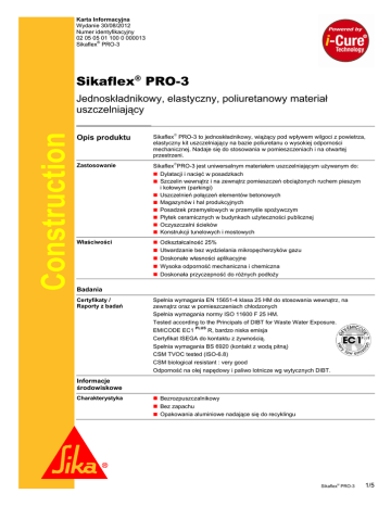 Karta Informacyjna Wydanie 30/08/2012 Numer identyfikacyjny 02 05 05 01 100 0 000013 Sikaflex® PRO-3 Sikaflex® PRO-3 Construction Jednoskładnikowy, elastyczny, poliuretanowy materiał uszczelniający Opis produktu Sikaflex PRO-3 to jednoskładnikowy, wiążący pod wpływem wilgoci z powietrza, elastyczny kit uszczelniający na bazie poliuretanu o wysokiej odporności mechanicznej. Nadaje się do stosowania w pomieszczeniach i na otwartej przestrzeni. Zastosowanie SikaflexPRO-3 jest uniwersalnym materiałem uszczelniającym używanym do: Dylatacji i nacięć w posadzkach Szczelin wewnątrz i na zewnątrz pomieszczeń obciążonych ruchem pieszym i kołowym (parkingi) Uszczelnień połączeń elementów betonowych Magazynów i hal produkcyjnych Posadzek przemysłowych w przemyśle spożywczym Płytek ceramicznych w budynkach użyteczności publicznej Oczyszczalni ścieków Konstrukcji tunelowych i mostowych Właściwości Odkształcalność 25% Utwardzanie bez wydzielania mikropęcherzyków gazu Doskonałe własności aplikacyjne Wysoka odporność mechaniczna i chemiczna Doskonała przyczepność do różnych podłoży Badania Certyfikaty / Raporty z badań Spełnia wymagania EN 15651-4 klasa 25 HM do stosowania wewnątrz, na zewnątrz oraz w pomieszczeniach chłodzonych Spełnia wymagania normy ISO 11600 F 25 HM. Tested according to the Principals of DIBT for Waste Water Exposure. EMICODE EC1 PLUS R, bardzo niska emisja Certyfikat ISEGA do kontaktu z żywnością. Spełnia wymagania BS 6920 (kontakt z wodą pitną) CSM TVOC tested (ISO-6.8) CSM biological resistant : very good Odporność na olej napędowy i paliwo lotnicze wg wytycznych DIBT. Informacje środowiskowe Charakterystyka Bezrozpuszczalnikowy Bez zapachu Opakowania aluminiowe nadające się do recyklingu Sikaflex® PRO-3 1/5 Certyfikaty ® LEED EQc 4.1 SCAQMD, Rule 1168 BAAQMD, Reg. 8, Rule 51 spełnia spełnia spełnia Dane produktu Postać Barwa Biała, betonowo – szara, szara, czarna, inne kolory na zamówienie Opakowanie 600 ml kiełbaski 300 ml kartusze Składowanie Warunki składowania / Czas przydatności do użycia Produkt przechowywany z dala od wilgoci i źródeł ciepła, w fabrycznie zamkniętym opakowaniu, w suchym i chłodnym miejscu, w temperaturze +10°C ÷ +25°C, chroniony przed bezpośrednim promieniowaniem słonecznym najlepiej użyć w ciągu 15 miesięcy od daty produkcji. Dane techniczne Baza chemiczna Wiążący pod wpływem wilgoci, jednoskładnikowy poliuretan. Gęstość ~ 1,35 kg/dm Czas naskórkowania ~ 60 minut (w +23°C, 50% w.w.) Szybkość utwardzania ~ 3,5 mm / 24 h (w +23°C, 50% w.w.) Możliwość odkształcenia 25% Wymiary szczeliny Minimalna szerokość 10 mm / Maksymalna szerokość 35 mm 3 (DIN 53 479 B) * Wymiary rekomendowane, dotyczące szczelin dylatacyjnych/pracujących. Dopuszczalne jest uszczelnianie także szczelin i pęknięć o wymiarach znacznie mniejszych. Stabilność 0 mm, bardzo dobra Temperatura użytkowania -40°C ÷ +80°C (DIN EN ISO 7390) Właściwości mechaniczne Wytrzymałość na rozdzieranie ~ 8 MPa (w +23°C, 50% w.w.) (DIN 53 515) Twardość Shore A ~ 38 po 28 dniach (w +23°C, 50% w.w.) (DIN 53 505) Moduł sprężystości E ~ 0,6 MPa po 28 dniach (w +23°C, 50% w.w.) Wydłużenie przy zerwaniu > 700% po 28 dniach (w +23°C, 50% w.w.) Powrót poodkształceniowy >80% po 28 dniach (w +23°C, 50% w.w.) (DIN EN ISO 8340) (DIN 53 504) (DIN EN ISO 7389 B) Odporność Odporność chemiczna Odporny na wodę, wodę morską, wodę wapienną, zaczyn cementowy oraz neutralne wodne dyspersje detergentów. Odporność na olej napędowy i paliwo lotnicze wg wytycznych DIBT. Nieodporny na alkohole, kwasy organiczne, stężone ługi i kwasy, węglowodory chlorowane i aromatyczne. Sikaflex® PRO-3 2/5 Informacje o systemie Szczegóły aplikacji Zużycie / projektowanie szczeliny Spoiny muszą być projektowane z uwzględnieniem odkształcalności materiału wypełniającego. Generalnie szerokość spoiny dylatacyjnej powinna zawierać się w przedziale 10 ÷ 35 mm. Należy zachować proporcje szerokości do głębokości wypełnienia ~ 1,0 : 0,8. Szczeliny <10 mm służą określeniu miejsca pęknięć i nie są traktowane jako dylatacje pracujące. Szerokość szczeliny należy mierzyć w momencie aplikacji kitu (zalecana temperatura +10°C). Dla różnicy temperatur 40°C Odległość między szczelinami 2m 4m 6m 8m 10 m Minimalna szerokość szczeliny 10 mm 10 mm 10 mm 15 mm 20 mm Głębokość wypełnienia 10 mm 10 mm 10 mm 12 mm 15 mm Dla aplikacji zewnętrznej (maksymalna różnica temperatury 80°C) Odległość między szczelinami 2m 4m 5m 6m 8m Minimalna szerokość szczeliny 10 mm 15 mm 18 mm 20 mm 30 mm Głębokość wypełnienia 10 mm 12 mm 15 mm 15 mm 25 mm Szczelinę należy starannie zwymiarować. Przy kalkulacji wymaganej szerokości szczeliny należy wziąć pod uwagę właściwości techniczne materiału wypełniającego, warunki podłoża, czynniki oddziałujące na elementy budowli ich konstrukcję i wymiary Szerokość szczeliny 10 mm 15 mm 20 mm 25 mm 30 mm Głębokość szczeliny 10 mm 12-15 mm 17 mm 20 mm 25 mm Długość wypełnienia z opakowania 600 ml ~6 m ~2,5–3,0 m ~1,8 m 1,2 m ~0,8 m Długość wypełnienia z opakowania 300 ml ~3 m 1,5 m 0,9 m 0,6 m ~0,4 m Podparcie wypełnienia: stosować wyłącznie materiał kompatybilny ® z uszczelnieniem, o zamkniętej strukturze, Sika Rundschnur – sznur ze spienionego polietylenu. Wypełnienie szczeliny na płasko zmniejsza ryzyko potykania się i zapobiega zbieraniu się brudu Jakość podłoża Wypełnienie szczeliny obciążonej mechanicznie Podłoże musi być czyste i suche, jednorodne, wolne od zatłuszczeń, pyłu i luźnych cząstek. Farby, mleczko cementowe, luźno związane z podłożem cząstki należy bezwzględnie usunąć. Sikaflex® PRO-3 3/5 Przygotowanie podłoża ® Sikaflex PRO-3 generalnie ma bardzo dobrą przyczepność do większości czystych, nośnych podłoży. W celu uzysk
