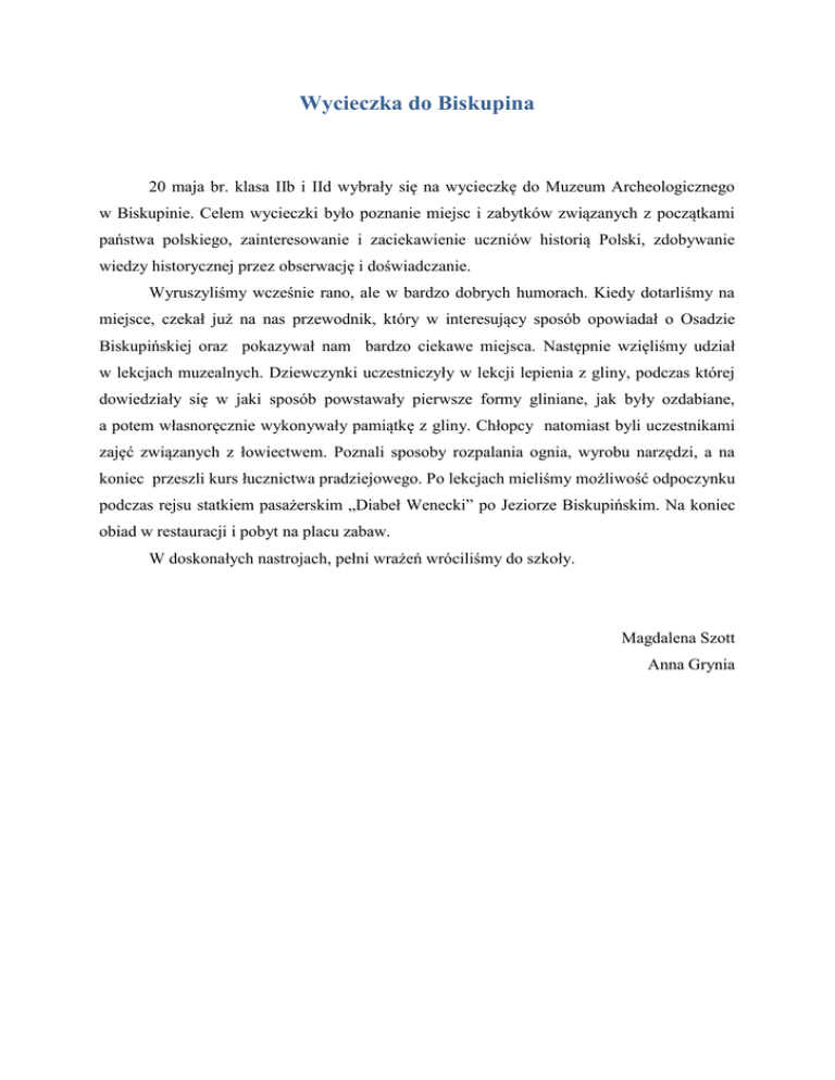 Wycieczka do Biskupina 20 maja br. klasa IIb i IId wybrały się na wycieczkę do Muzeum Archeologicznego w Biskupinie. Celem wycieczki było poznanie miejsc i zabytków związanych z początkami państwa polskiego, zainteresowanie i zaciekawienie uczniów historią Polski, zdobywanie wiedzy historycznej przez obserwację i doświadczanie. Wyruszyliśmy wcześnie rano, ale w bardzo dobrych humorach. Kiedy dotarliśmy na miejsce, czekał już na nas przewodnik, który w interesujący sposób opowiadał o Osadzie Biskupińskiej oraz pokazywał nam bardzo ciekawe miejsca. Następnie wzięliśmy udział w lekcjach muzealnych. Dziewczynki uczestniczyły w lekcji lepienia z gliny, podczas której dowiedziały się w jaki sposób powstawały pierwsze formy gliniane, jak były ozdabiane, a potem własnoręcznie wykonywały pamiątkę z gliny. Chłopcy natomiast byli uczestnikami zajęć związanych z łowiectwem. Poznali sposoby rozpalania ognia, wyrobu narzędzi, a na koniec przeszli kurs łucznictwa pradziejowego. Po lekcjach mieliśmy możliwość odpoczynku podczas rejsu statkiem pasażerskim „Diabeł Wenecki” po Jeziorze Biskupińskim. Na koniec obiad w restauracji i pobyt na placu zabaw. W doskonałych nastrojach, pełni wrażeń wróciliśmy do szkoły. Magdalena Szott Anna Grynia