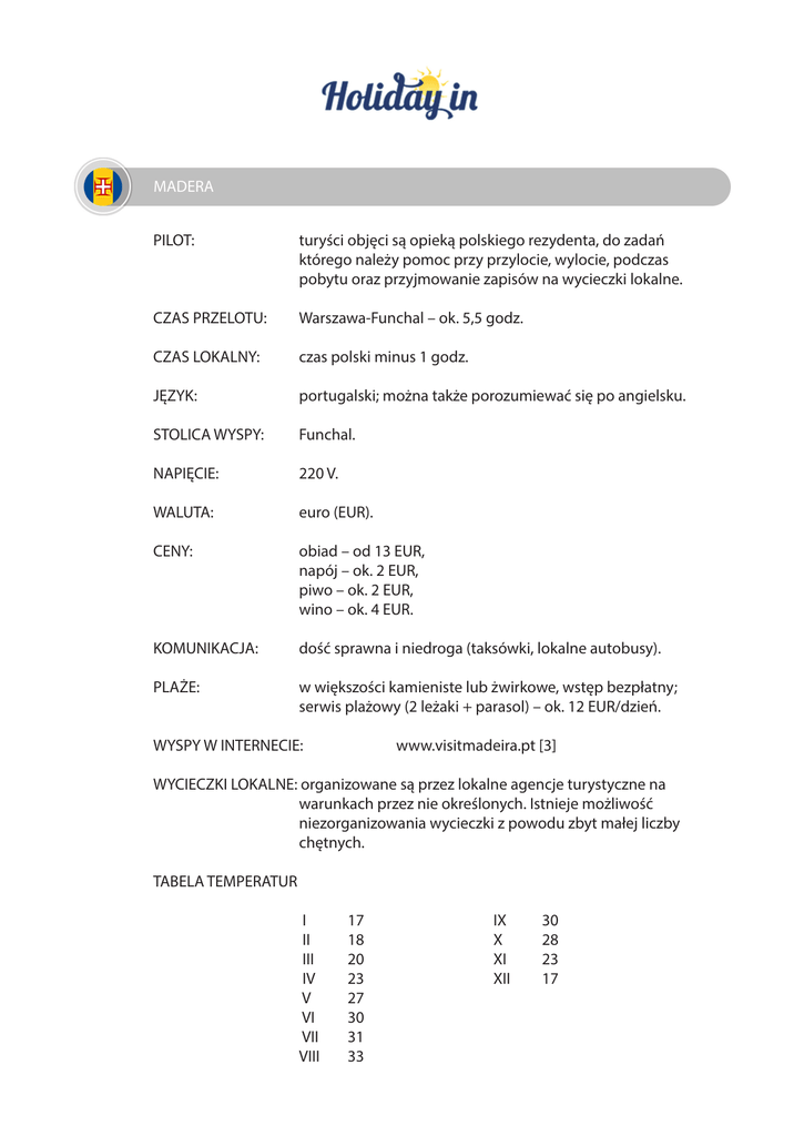 MADERA PILOT: turyści objęci są opieką polskiego rezydenta, do zadań którego należy pomoc przy przylocie, wylocie, podczas pobytu oraz przyjmowanie zapisów na wycieczki lokalne. CZAS PRZELOTU: Warszawa-Funchal – ok. 5,5 godz. CZAS LOKALNY: czas polski minus 1 godz. JĘZYK: portugalski; można także porozumiewać się po angielsku. STOLICA WYSPY: Funchal. NAPIĘCIE: 220 V. WALUTA: euro (EUR). CENY: obiad – od 13 EUR, napój – ok. 2 EUR, piwo – ok. 2 EUR, wino – ok. 4 EUR. KOMUNIKACJA: dość sprawna i niedroga (taksówki, lokalne autobusy). PLAŻE: w większości kamieniste lub żwirkowe, wstęp bezpłatny; serwis plażowy (2 leżaki + parasol) – ok. 12 EUR/dzień. WYSPY W INTERNECIE: www.visitmadeira.pt [3] WYCIECZKI LOKALNE: organizowane są przez lokalne agencje turystyczne na warunkach przez nie określonych. Istnieje możliwość niezorganizowania wycieczki z powodu zbyt małej liczby chętnych. TABELA TEMPERATUR I II III IV V VI VII VIII 17 18 20 23 27 30 31 33 IX X XI XII 30 28 23 17