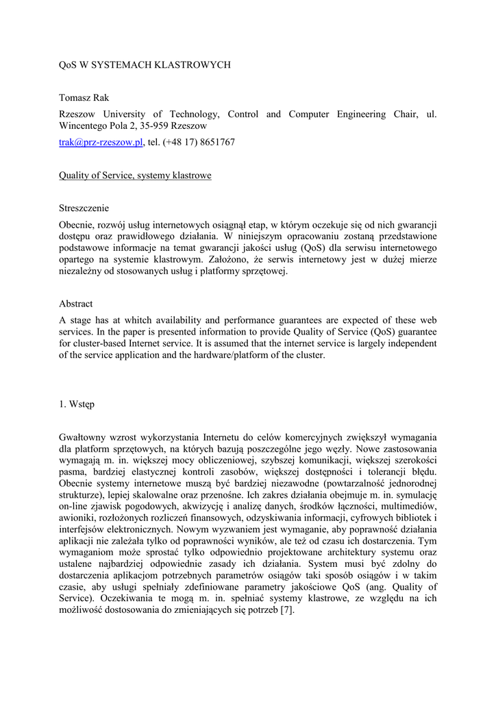 QoS W SYSTEMACH KLASTROWYCH Tomasz Rak Rzeszow