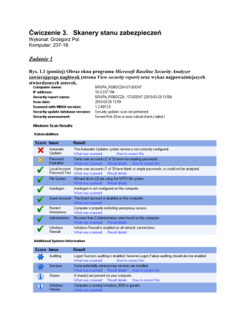 Ćwiczenie 3. Skanery stanu zabezpieczeń Wykonał: Grzegorz Pol Komputer: 237-16 Zadanie 1 Rys. 1.1 (poniżej) Obraz okna programu Microsoft Baseline Security Analyzer zawierającego nagłówek (strona View security report) oraz wykaz najpoważniejszych stwierdzonych usterek. Najpoważniejsze wykryte usterki: Rys. 1.2 (poniżej) Obraz najważniejszych elementów okna programu Microsoft Baseline Security Analyzer osiągalnego po wybraniu jednego z łączników What was scanned. Łacznik What was scanned dla Automatic Updates Check Łącznik What was scanned dla Password Expiration Łącznik What was scanned dla Internet Explorer Enhanced Security Configuration for Non Administrators Łącznik What was scanned dla Internet Explorer Enchanced Security Configuration for Administrators Rys. 1.3 (poniżej) Obraz najważniejszych elementów okna programu Microsoft Baseline Security Analyzer osiągalnego po wybraniu jednego z łączników Result details. Łącznik Result details dla Password Expiration Łącznik Result details dla Local acoount Password Test Rys. 1.4 (poniżej) Obraz najważniejszych elementów okna programu Microsoft Baseline Security Analyzer osiągalnego po wybraniu jednego z łączników How to correct this. Łącznik How to correct dla Automatic Updates Łącznik How to correct dla Password Expiration WŁASNE SPOSTRZEŻENIA I WNIOSKI do zadania 1: Narzędzie te służy do sprawdzania stanu zabezpieczeń systemu w sieci (w naszym przypadku jest to Windows 2003 Server z dodatkiem SP1) oraz przeglądarki Internet Explorer (w naszym przypadku 6.0). Ponadto jesteśmy informowani o dostępnych udostępnionych poprawkach na serwerze firmy Microsoft, o jakości haseł, ważnych ustawień konfiguracyjnych. Po każdym skanowaniu program wyświetla nam raport: z informacjami co zostało zeskanowane, wynikiem szczegółowym oraz informacją pomocną do zabezpieczenia systemu/przeglądarki. W naszym przypadku program zgłasza problemy dotyczące: automatycznych aktualizacji (zostały one przez nas wyłaczone), długości wygasania hasła (nie wygasa), "dziurawą" przeglądarką. Wszystkie problemy w zakładkąch są rozwiązywane sposobem: zainstaluj / odznacz / zaznacz. Zostały one tak skonstruowane aby początkujący użytkownik komputera mógł z nich skorzystać. Zadanie 2 Rys. 2.1 (poniżej) Obraz głównego okna programu Retina po zakończeniu skanowania (pod zakładką Audit) z widocznymi informacjami identyfikującymi skanowany komputer. Rys. 2.2 (poniżej) Obraz okna zawierającego całą sekcję Network Analysis Results raportu głównego (podsumowanie informacji w sekcji i wszystkie wykresy). Rys. 2.3 (poniżej) Obraz okna zawierającego tabelę w sekcji Top 20 Vulnerabilities raportu głównego. Rys. 2.4 (poniżej) Obraz okna zawierającego cały opis i procedurę usunięcia usterki Cumulative Security Update of ActiveX Kill Bits (950760) z raportu Procedury WŁASNE SPOSTRZEŻENIA I WNIOSKI do zadania 2: Retina Network Security Scanner to narzędzie służące do skanowania sieci w poszukiwaniu luk, które mogą okazać się niebezpieczne. Następnie program ocenia stopień zagrożenia każdej z nich i podaje najlepsze rozwiazania. Skanowanie sieci trwa dość krótko. Program dodatkowo generuje raporty zawierające sporą ilość wykresów co ułatwia przyswajanie informacji. Zadanie 3 Rys. 3.1 (poniżej) Obraz okna klienta pakietu Nessus zawierającego informacje o wybranym obiekcie skanowania i wybranej zasadzie. Rys. 3.2 (poniżej) Obraz okna klienta pakietu Nessus zawierającego najważniejsze elementy opisu dowolnie wybranej usterki. WŁASNE SPOSTRZEŻENIA I WNIOSKI do zadania 3: Nessus jest skanerem badającym ponad 20 tysięcy punktów w systemie zagrażających naszemu bezpieczeństwu. W ciągu kilku minut skaner dostarcza nam czytelny i przejrzysty raport w postaci drzewka, niestety pozbawiony wykresów. Raporta możemy zapisać w formacie *.as by móc odczytać później. Zadanie 4 Rys. 4.1 (poniżej) Obraz okna zawierającego raport NetworkVulnerability Assessment Summary. Rys. 4.2 (poniżej) Obraz okna zawierającego fragment raportu Technician - Vulnerability Assessment, z opisem i procedurą usunięcia usterki Generate Security Audit Privilege: Inappropriate user with Generate Security Audits privilege Vuln count = 2 WŁASNE SPOSTRZEŻENIA I WNIOSKI do zadania 4: IIS Internet Security tak jak poprzednie programy służy do wykrywania luk w sieci. Program po dość długim skanowaniu (porównując z innymi badanymi dziś programami) umożliwia wygenerowanie bardzo szczegółowych raportów o błędach. Zostały one podzialone w zależności od zagrożenia na High, Medium, Low po to by użytkownik skupił się na poważniejszych z nich.