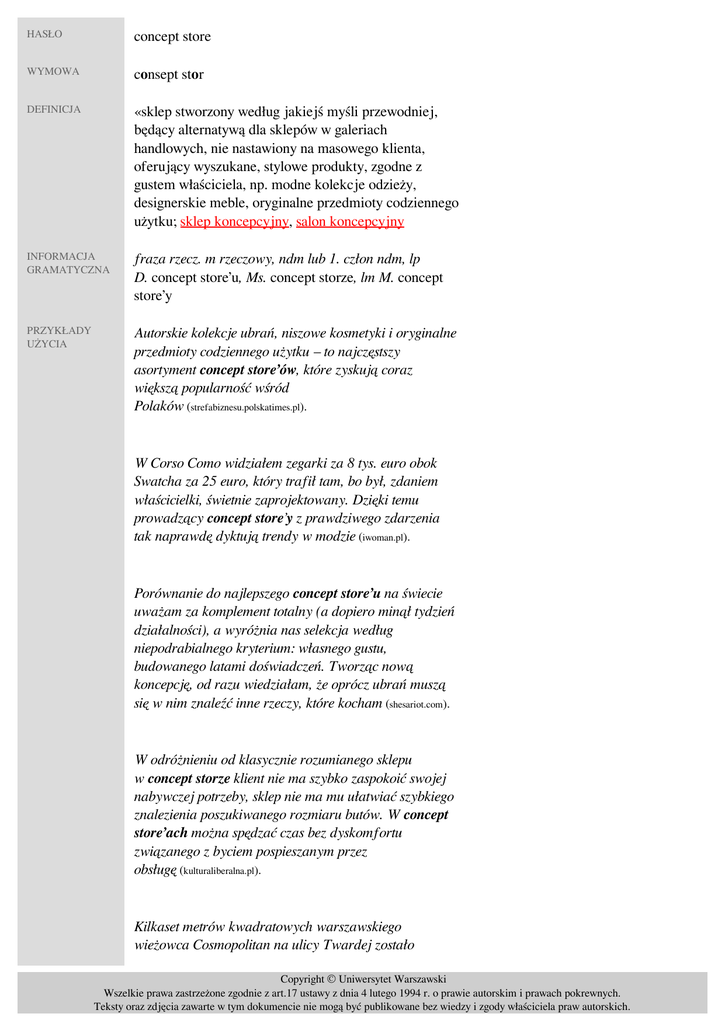 HASŁO concept store WYMOWA consept stor DEFINICJA «sklep stworzony według jakiejś myśli przewodniej, będący alternatywą dla sklepów w galeriach handlowych, nie nastawiony na masowego klienta, oferujący wyszukane, stylowe produkty, zgodne z gustem właściciela, np. modne kolekcje odzieży, designerskie meble, oryginalne przedmioty codziennego użytku; sklep koncepcyjny, salon koncepcyjny» INFORMACJA GRAMATYCZNA fraza rzecz. m rzeczowy, ndm lub 1. człon ndm, lp D. concept store’u, Ms. concept storze, lm M. concept store’y PRZYKŁADY UŻYCIA Autorskie kolekcje ubrań, niszowe kosmetyki i oryginalne przedmioty codziennego użytku – to najczęstszy asortyment concept store’ów, które zyskują coraz większą popularność wśród Polaków (strefabiznesu.polskatimes.pl). W Corso Como widziałem zegarki za 8 tys. euro obok Swatcha za 25 euro, który trafił tam, bo był, zdaniem właścicielki, świetnie zaprojektowany. Dzięki temu prowadzący concept store’y z prawdziwego zdarzenia tak naprawdę dyktują trendy w modzie (iwoman.pl). Porównanie do najlepszego concept store’u na świecie uważam za komplement totalny (a dopiero minął tydzień działalności), a wyróżnia nas selekcja według niepodrabialnego kryterium: własnego gustu, budowanego latami doświadczeń. Tworząc nową koncepcję, od razu wiedziałam, że oprócz ubrań muszą się w nim znaleźć inne rzeczy, które kocham (shesariot.com). W odróżnieniu od klasycznie rozumianego sklepu w concept storze klient nie ma szybko zaspokoić swojej nabywczej potrzeby, sklep nie ma mu ułatwiać szybkiego znalezienia poszukiwanego rozmiaru butów. W concept store’ach można spędzać czas bez dyskomfortu związanego z byciem pospieszanym przez obsługę (kulturaliberalna.pl). Kilkaset metrów kwadratowych warszawskiego wieżowca Cosmopolitan na ulicy Twardej zostało Copyright © Uniwersytet Warszawski Wszelkie prawa zastrzeżone zgodnie z art.17 ustawy z dnia 4 lutego 1994 r. o prawie autorskim i prawach pokrewnych. Teksty oraz zdjęcia zawarte w tym dokumencie nie mogą być publikowane bez wiedzy i zgody właściciela praw autorskich. zagospodarowane na concept store, skupiający najlepsze polskie marki i produkty. Butik FORO powstał z myślą o świątecznych zakupach i będzie działać do 23 grudnia (muno.pl). ETYMOLOGIA WIZUALIZACJE <ang. concept store, dosł. ‘sklep z pomysłem’> Zobacz w grafice Google DATA Rejestracja hasła: 18.06.2015, 21.29, ostatnia aktualizacja hasła: 08.08.2015, 17.27 AUTOR Paweł Ciach REDAKTOR Maciej Czeszewski Copyright © Uniwersytet Warszawski Wszelkie prawa zastrzeżone zgodnie z art.17 ustawy z dnia 4 lutego 1994 r. o prawie autorskim i prawach pokrewnych. Teksty oraz zdjęcia zawarte w tym dokumencie nie mogą być publikowane bez wiedzy i zgody właściciela praw autorskich. Powered by TCPDF (www.tcpdf.org)