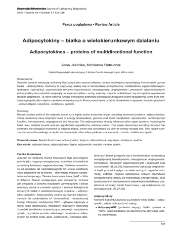 diagnostyka laboratoryjna Journal of Laboratory Diagnostics 2010 • Volume 46 • Number 3 • 331-338 Praca poglądowa • Review Article Adipocytokiny – białka o wielokierunkowym działaniu Adipocytokines – proteins of multidirectional function Anna Jasińska, Mirosława Pietruczuk Zakład Diagnostyki Laboratoryjnej, II Klinika Chorób Wewnętrznych, UM w Łodzi Streszczenie Ostatnie badania wskazują na tkankę tłuszczową jako wysoce aktywny narząd endokrynny wydzielający hormonalnie czynne białka – adipocytokiny. Hormony te odgrywają ważną rolę w homeostazie energetycznej, metabolizmie węglowodanowym i lipidowym, reprodukcji, czynnościach sercowo-naczyniowych, hematopoezie, angiogenezie i procesach odpornościowych. Adipocytokiny bezpośrednio wpływają na wiele narządów – mózg, wątrobę, mięśnie szkieletowe i są szczególnie regulowane stanem odżywienia. Ta nowo odkryta funkcja sekrecyjna podkreśla biologiczne znaczenie tkanki tłuszczowej, która była traktowana jedynie jako miejsce zapasów energetycznych. Praca przedstawia ostatnie doniesienia o leptynie i innych cytokinach – adiponektynie, rezystynie, wisfatynie i apelinie. Summary Recent studies point to the adipose tissue as a highly active endocrine organ secreting hormonal proteins- adipocytokines. These hormones have important roles in energy homeostasis, glucose and lipids metabolism, reproduction, cardiovascular function, hematopoesis, angiogenesis and immunity. The adipocytokines directly influence other organ systems, including the brain, liver, skeletal muscle and are significantly regulated by nutrional status. This newly discovered secretory function has extended the biological revelance of adipose tissue, which was considered as only an energy storage site. This review summarizes recent knowledge on leptin and especially other adipocytokines – adiponectin, resistin, visfatin and apelin. Słowa kluczowe:tkanka tłuszczowa, adipocytokiny, leptyna, adiponektyna, rezystyna, wisfatyna, apelina Key words:adipose tissue, adipocytokines, leptin, adiponectin, resistin, visfatin, apelin Tkanka tłuszczowa Jeszcze do niedawna tkanka tłuszczowa była postrzegana jedynie jako magazyn energetyczny i oceniana w kontekście przemiany lipidowej i węglowodanowej. Badania prowadzone od początku lat osiemdziesiątych XX wieku umożliwiły nowe spojrzenie na tę tkankę – jako ważne miejsce wydzielania endokrynnego. Tkanka tłuszczowa biała (WAT – White Adipose Tissue) występująca jako podskórna, trzewna jest związana z wieloma narządami wewnętrznymi i bierze znaczący udział w procesie syntezy i sekrecji biologicznie aktywnych białek o wielokierunkowym działaniu – adipocytokin (adipokin). Adipocytokiny zwane są również adipohormonami dla podkreślenia ich hormonalnej i metabolicznej funkcji. Elementy morfotyczne WAT – głównie adipocyty w różnej fazie dojrzewania, fibroblasty, mastocyty, makrofagi i komórki śródbłonka uczestniczą w produkcji i wydzielaniu cytokin, czynników wzrostu, składowych dopełniacza, adipocytokin na drodze endo, para i autokrynnej. Znaczące dzia- łanie tych białek przejawia się w kontrolowaniu homeostazy energetycznej, hematopoezie, osteogenezie, angiogenezie, hemostazie, procesach odpornościowych i zapalnych oraz rozrodczości [28,29,30]. Adipocytokiny wykazują bezpośredni bądź pośredni wpływ na wiele ważnych organów m.in. mózg, wątrobę, mięśnie szkieletowe, których prawidłowe funkcjonowanie zależy od homeostazy energetycznej. Ilość syntezowanych i wydzielanych adipokin jest dodatkowo uzależniona od masy tkanki tłuszczowej – jej zwiększenia lub zmniejszenia [1,23,27,35]. Adipocytokiny Komórki tkanki tłuszczowej są źródłem wielu białek – adipocytokin, wśród nich wyróżnić należy: • Adipsynę/ASP (proteaza seryny), białko opisane w 1987r., odpowiedzialne za alternatywną aktywację układu dopełniacza, 331 Adipocytokiny – białka o wielokierunkowym działaniu • Leptynę, białko kontrolujące homeostazę energetyczną, wpływające na metabolizm węglowodanowy, lipidowy, odgrywające rolę w procesach odpornościowych, • Adiponektynę, odpowiedzialną m.in. za homeostazę glikemii i lipidemii, • Rezystynę, odgrywającą szczególną rolę w procesach zapalnych i odpornościowych, • Wisfatynę, działającą synergistycznie z adiponektyną, • Apelinę, uczestniczącą w homeostazie wodnej ustroju i procesie angiogenezy, • Chemerynę, czynnik stymulujący różnicowanie i dojrzewanie adipocytów. Wśród białek produkowanych przez tkankę tłuszczową, nie będących „klasycznymi” adipocytokinami wyróżnić należy: • PAI-1, inhibitor aktywatora plazminogenu (plazminogen activator inhibitor-1), białko odpowiedzialne za homeostazę naczyniową, • TNF-alfa, IL-6, IL-8, będące klasycznymi cytokinami, • MCP-1, czynnik chemotaktyczny monocytów (monocyte chemoattractant protein) • Angiotensynogen II, białko odpowiedzialne za regulację ciśnienia tętniczego, • VEGF (vascular endothelial growth factor), czynnik wpływający na angiogenezę [1,23,31,35] • Leptyna Wykrycie genu otyłości (obese gen – ob) w 1994r. stało się znaczącym dowodem na stwierdzenie, że tkanka tłuszczowa pełni ważne funkcje regulatorowe w ustroju. Gen otyłości zlokalizowany jest w chromosomie 7q31.3 – zbudowany z 20 kilopar zasad z 3 eksonami i 2 intronami. Produktem tego genu jest leptyna, która jest białkiem o wielokierunkowym działaniu - neurohormonalnym, metabolicznym, immunomodulatorowym. To plejotropowe działanie leptyny stało się przedmiotem wielu badań naukowych w różnych ośrodkach [13,19,24,37]. Produkcja leptyny zachodzi głównie w komórkach białej tkanki tłuszczowej (WAT), w niewielkich ilościach w tkance brunatnej (BAT). Na jej syntezę ma wpływ rozmiar adipocytów – im większe komórki, tym większa ilość uwalnianego hormonu Leptyna (od greckiego lep