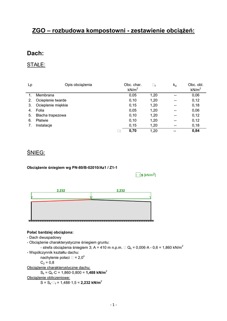 ZGO – rozbudowa kompostowni - zestawienie obciążeń: Dach: STAŁE: Lp 1. 2. 3. 4. 5. 6. 7. Opis obciążenia Obc. char. 2 kN/m 0,05 0,10 0,15 0,05 0,10 0,10 0,15 0,70 : Membrana Ocieplenie twarde Ocieplenie miękkie Folia Blacha trapezowa Płatwie Instalacje f kd 1,20 1,20 1,20 1,20 1,20 1,20 1,20 1,20 --------- ŚNIEG: Obciążenie śniegiem wg PN-80/B-02010/Az1 / Z1-1 S [kN/m2] 2,232 2,232 Połać bardziej obciążona: - Dach dwuspadowy - Obciążenie charakterystyczne śniegiem gruntu: 2 - strefa obciążenia śniegiem 3; A = 410 m n.p.m. Qk = 0,006·A - 0,6 = 1,860 kN/m - Współczynnik kształtu dachu: o nachylenie połaci = 2,0 C2 = 0,8 Obciążenie charakterystyczne dachu: 2 Sk = Qk·C = 1,860·0,800 = 1,488 kN/m Obciążenie obliczeniowe: 2 S = Sk·f = 1,488·1,5 = 2,232 kN/m -1- Obc. obl. 2 kN/m 0,06 0,12 0,18 0,06 0,12 0,12 0,18 0,84 WIATR: Obciążenie wiatrem wg PN-B-02011:1977/Az1 / Z1-3 p [kN/m2] -0,795 -0,353 H=10,0 kierunek wiatru B=50,0 Połać nawietrzna: - Budynek o wymiarach: B = 50,0 m, L = 70,0 m, H = 10,0 m o - Dach dwuspadowy, kąt nachylenia połaci = 2,0 - Charakterystyczne ciśnienie prędkości wiatru: 2 - strefa obciążenia wiatrem III; H = 410 m n.p.m. qk = 300·[1+0,0006·(H-300)] ·[(20000H)/(20000+H)] = 327 Pa 2 qk = 0,327 kN/m - Współczynnik ekspozycji: rodzaj terenu: A; z = H = 10,0 m Ce(z) = 0,5+0,05·10,0 = 1,00 - Współczynnik działania porywów wiatru: = 1,80 - Współczynnik ciśnienia wewnętrznego: budynek zamknięty Cw = 0 - Współczynnik ciśnienia zewnętrznego: Cz = -0,9 - Współczynnik aerodynamiczny C: C = Cz - Cw = -0,9 - 0 = -0,9 Obciążenie charakterystyczne: 2 pk = qk·Ce·C· = 0,327·1,00·(-0,9)·1,80 = -0,530 kN/m Obciążenie obliczeniowe: 2 p = pk·f = (-0,530)·1,5 = -0,795 kN/m -2- Obciążenie wiatrem wg PN-B-02011:1977/Az1 / Z1-3 p [kN/m2] -0,795 -0,353 H=10,0 kierunek wiatru B=50,0 Połać zawietrzna: - Budynek o wymiarach: B = 50,0 m, L = 70,0 m, H = 10,0 m o - Dach dwuspadowy, kąt nachylenia połaci = 2,0 - Charakterystyczne ciśnienie prędkości wiatru: 2 - strefa obciążenia wiatrem III; H = 410 m n.p.m. qk = 300·[1+0,0006·(H-300)] ·[(20000H)/(20000+H)] = 327 Pa 2 qk = 0,327 kN/m - Współczynnik ekspozycji: rodzaj terenu: A; z = H = 10,0 m Ce(z) = 0,5+0,05·10,0 = 1,00 - Współczynnik działania porywów wiatru: = 1,80 - Współczynnik ciśnienia wewnętrznego: budynek zamknięty Cw = 0 - Współczynnik ciśnienia zewnętrznego: Cz = -0,4 - Współczynnik aerodynamiczny C: C = Cz - Cw = -0,4 - 0 = -0,4 Obciążenie charakterystyczne: 2 pk = qk·Ce·C· = 0,327·1,00·(-0,4)·1,80 = -0,236 kN/m Obciążenie obliczeniowe: 2 p = pk·f = (-0,236)·1,5 = -0,353 kN/m -3- Ściany: ściana górna lekka Lp 1. 2. 3. 4. 5. 6. 7. Opis obciążenia Obc. char. 2 kN/m 0,10 0,10 0,10 0,10 0,15 0,10 0,10 0,75 Σ: Blacha Ocieplenie Blacha Ryglówka Izolacja akustyczna Blacha Instalacje γf kd 1,20 1,20 1,20 1,20 1,20 1,20 1,20 1,20 --------- γf kd 1,10 1,20 1,20 1,20 1,20 1,12 ------- Obc. obl. 2 kN/m 0,12 0,12 0,12 0,12 0,18 0,12 0,12 0,90 ściana dolna ciężka Lp 1. 2. 3. 4. 5. Opis obciążenia Obc. char. 2 kN/m 6,25 0,15 0,20 1,00 0,10 7,70 Σ: Ściana żelbetowa Izolacja akustyczna Wykończenie Blacha ochronna Instalacje WIATR: Obciążenie wiatrem wg PN-B-02011:1977/Az1 / Z1-1 p [kN/m2] L=70,0 0,618 kierunek wiatru -0,353 -0,618 -0,618 B=50,0 Ściana nawietrzna: - Budynek o wymiarach: B = 50,0 m, L = 70 m, H = 10,0 m -4- Obc. obl. 2 kN/m 6,88 0,18 0,24 1,20 0,12 8,62 - Charakterystyczne ciśnienie prędkości wiatru: 2 - strefa obciążenia wiatrem III; H = 410 m n.p.m. qk = 300·[1+0,0006·(H-300)] ·[(20000H)/(20000+H)] = 327 Pa 2 qk = 0,327 kN/m - Współczynnik ekspozycji: rodzaj terenu: A; z = H = 10,0 m Ce(z) = 0,5+0,05·10,0 = 1,00 - Współczynnik działania porywów wiatru: = 1,80 - Współczynnik ciśnienia wewnętrznego: budynek zamknięty Cw = 0 - Współczynnik ciśnienia zewnętrznego: Cz = 0,7 - Współczynnik aerodynamiczny C: C = Cz - Cw = 0,7 - 0 = 0,7 Obciążenie charakterystyczne: 2 pk = qk·Ce·C· = 0,327·1,00·0,7·1,80 = 0,412 kN/m Obciążenie obliczeniowe: 2 p = pk·f = 0,412·1,5 = 0,618 kN/m Obciążenie wiatrem wg PN-B-02011:1977/Az1 / Z1-1 p [kN/m2] L=70,0 0,618 kierunek wiatru -0,353 -0,618 -0,618 B=50,0 Ściana zawietrzna: - Budynek o wymiarach: B = 50,0 m, L = 70,0 m, H = 10,0 m - Charakterystyczne ciśnienie prędkości wiatru: 2 - strefa obciążenia wiatrem III; H = 410 m n.p.m. qk = 300·[1+0,0006·(H-300)] ·[(20000H)/(20000+H)] = 327 Pa 2 qk = 0,327 kN/m - Współczynnik ekspozycji: rodzaj terenu: A; z = H = 10,0 m Ce(z) = 0,5+0,05·10,0 = 1,00 - Współczynnik działania porywów wiatru: = 1,80 - Współczynnik ciśnienia wewnętrznego: budynek zamknięty Cw = 0 - Współczynnik ciśnienia zewnętrznego: Cz = -0,4 - Współczynnik aerodynamiczny C: C = Cz - Cw = -0,4 - 0 = -0,4 Obciążenie charakterystyczne: 2 pk = qk·Ce·C· = 0,327·1,00·(-0,4)·1,80 = -0,236 kN/m Obciążenie obliczeniowe: -5- p = pk·f = (-0,236)·1,5 = -0,353 kN/m 2 Obciążenie wiatrem wg PN-B-02011:1977/Az1 / Z1-1 p [kN/m2] L=70,0 0,618 kierunek wiatru -0,353 -0,618 -0,618 B=50,0 Ściany boczne: - Budynek o wymiarach: B = 50,0 m, L = 70,0 m, H = 10,0 m - Charakterystyczne ciśnienie prędkości wiatru: 2 - strefa obciążenia wiatrem III; H = 410 m n.p.m. qk = 300·[1+0,0006·(H-300)] ·[(20000H)/(20000+H)] = 327 Pa 2 qk = 0,327 kN/m - Współczynnik ekspozycji: rodzaj terenu: A; z = H = 10,0 m Ce(z) = 0,5+0,05·10,0 = 1,00 - Współczynnik działania porywów wiatru: = 1,80 - Współczynnik ciśnienia wewnętrznego: budynek zamknięty Cw = 0 - Współczynnik ciśnienia zewnętrznego: Cz = -0,7 - Współczynnik aerodynamiczny C: C = Cz - Cw = -0,7 - 0 = -0,7 Obciążenie charakterystyczne: 2 pk = qk·Ce·C· = 0,327·1,00·(-0,7)·1,80 = -0,412 kN/m Obciążenie obliczeniowe: 2 p = pk·f = (-0,412)·1,5 = -0,618 kN/m -6- Komory: Gęstość materiału zasypowego: ~ 15,0 kN/m3 Boksy: Gęstość m