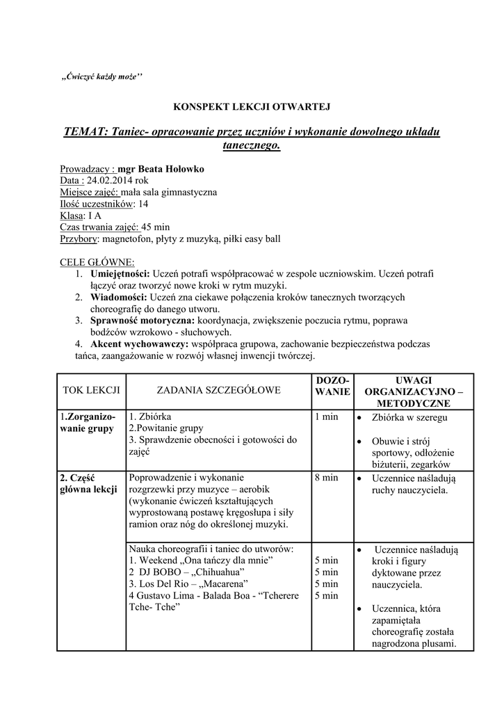 ,,Ćwiczyć każdy może’’ KONSPEKT LEKCJI OTWARTEJ TEMAT: Taniec- opracowanie przez uczniów i wykonanie dowolnego układu tanecznego. Prowadzacy : mgr Beata Hołowko Data : 24.02.2014 rok Miejsce zajęć: mała sala gimnastyczna Ilość uczestników: 14 Klasa: I A Czas trwania zajęć: 45 min Przybory: magnetofon, płyty z muzyką, piłki easy ball CELE GŁÓWNE: 1. Umiejętności: Uczeń potrafi współpracować w zespole uczniowskim. Uczeń potrafi łączyć oraz tworzyć nowe kroki w rytm muzyki. 2. Wiadomości: Uczeń zna ciekawe połączenia kroków tanecznych tworzących choreografię do danego utworu. 3. Sprawność motoryczna: koordynacja, zwiększenie poczucia rytmu, poprawa bodźców wzrokowo - słuchowych. 4. Akcent wychowawczy: współpraca grupowa, zachowanie bezpieczeństwa podczas tańca, zaangażowanie w rozwój własnej inwencji twórczej. TOK LEKCJI 1.Zorganizowanie grupy 2. Część główna lekcji ZADANIA SZCZEGÓŁOWE DOZOWANIE 1. Zbiórka 2.Powitanie grupy 3. Sprawdzenie obecności i gotowości do zajęć 1 min Poprowadzenie i wykonanie rozgrzewki przy muzyce – aerobik (wykonanie ćwiczeń kształtujących wyprostowaną postawę kręgosłupa i siły ramion oraz nóg do określonej muzyki. 8 min Nauka choreografii i taniec do utworów: 1. Weekend „Ona tańczy dla mnie” 2 DJ BOBO – „Chihuahua” 3. Los Del Rio – „Macarena” 4 Gustavo Lima - Balada Boa - “Tcherere Tche- Tche” UWAGI ORGANIZACYJNO – METODYCZNE Zbiórka w szeregu Obuwie i strój sportowy, odłożenie biżuterii, zegarków Uczennice naśladują ruchy nauczyciela. Uczennice naśladują kroki i figury dyktowane przez nauczyciela. Uczennica, która zapamiętała choreografię została nagrodzona plusami. 5 min 5 min 5 min 5 min 5. Przygotowanie do prezentacji układów tanecznych przygotowanych w grupach przez uczennice. 4 min 6. Prezentacja układów tanecznych przygotowanych przez uczennice. 7 min 7. Ćwiczenia rozciągające, uspokajające i 4 min oddechowe wykorzystaniem piłki easy ball. 3. Część 1. Uporządkowanie sali organizacyjno 2. Zbiórka w szeregu - porządkowa 3. Pogadanka 4. Pożegnanie grupy 1 min Uczennice miały za zadanie wcześniej przed lekcją przygotować w grupach układy. Układy oceniane przez nauczyciela i uczennice. Wybór najciekawszego układu. Uczennice naśladują nauczyciela, wszystkie ćwiczenia wykonywane w rytm muzyki. pochwalenia uczennic za zaangażowanie i przygotowanie do lekcji; podsumowanie plusów i wystawienie ocen