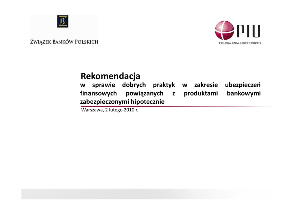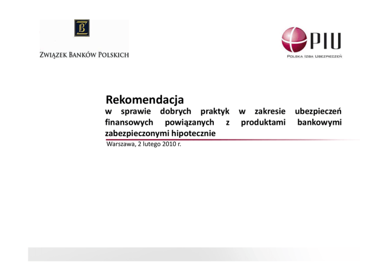 Rekomendacja w sprawie dobrych praktyk w zakresie ubezpieczeń finansowych powiązanych z produktami bankowymi zabezpieczonymi hipotecznie Warszawa, 2 lutego 2010 r. Podstawowe informacje Cel • określenie ogólnych zasad postępowania banków w przypadku, gdy wykonywanie przez bank lub ubezpieczyciela umów ubezpieczenia ryzyka banku może wywołać skutki dla klienta banku Zakres przedmiotowy • Rekomendacja określa ogólne zasady postępowania banków, zawierających w imieniu własnym i na własny rachunek umowę ubezpieczenia finansowego • Dotyczy relacji pomiędzy bankiem, ubezpieczycielem a klientem banku w zakresie: ubezpieczenia pomostowego, ubezpieczenia brakującego wkładu własnego, ubezpieczenia wartości nieruchomości, ubezpieczenia tytułu prawnego • Rekomendacja została opracowana we współpracy z Polską Izbą Ubezpieczeń i przyjęta przez Zarząd ZBP 22 grudnia 2010 r. • Rekomendacja wejdzie w życie 1 lipca 2011 r. Definicje w rekomendacji • Ubezpieczenie finansowe: ubezpieczenie zapewniające pokrycie przez ubezpieczyciela strat • • • • majątkowych banku, spowodowanych zajściem zdarzeń objętych ochroną ubezpieczeniową związanych z umową o produkt bankowy Ubezpieczenie pomostowe: ubezpieczenie ryzyka banku w zakresie spłaty produktu bankowego w okresie od dnia jego wypłaty, maksymalnie do dnia uprawomocnienia się wpisu hipoteki na rzecz banku w księdze wieczystej Ubezpieczenie niskiego wkładu (brakującego wkładu własnego): ubezpieczenie ryzyka banku w zakresie spłaty części produktu bankowego odpowiadającego różnicy pomiędzy wymaganym przez bank wkładem własnym, a wkładem wniesionym przez klienta Ubezpieczenie wartości nieruchomości: ubezpieczenie banku od utraty wartości nieruchomości stanowiącej zabezpieczenie banku przed skutkiem spadku wartości nieruchomości, gwarantujące bankowi w okresie ubezpieczenia zachowanie adekwatności wartości nieruchomości stanowiącej zabezpieczenie produktu bankowego do kwoty zadłużenia Ubezpieczenie tytułu prawnego: ubezpieczenie banku od skutków wad prawnych nieruchomości, w tym obciążeń nieruchomości, które nie zostały zidentyfikowane przed zawarciem umowy produktu bankowego Najważniejsze postanowienia Relacja Bank - Ubezpieczyciel • Bank odpowiada za autentyczność i prawidłowość dokumentacji niezbędnej do wykonania umowy ubezpieczenia finansowego • Ubezpieczyciel i bank definiują w umowie ubezpieczenia finansowego zakres informacji i dokumentów udostępnianych przez bank ubezpieczycielowi Relacja Bank – Klient Banku • Obowiązki informacyjne banku • Bank zapewnia klientowi informację o zawartej przez siebie umowie ubezpieczenia finansowego związanej z • • • daną umową o produkt bankowy Z dokumentacji powinno jasno wynikać, że ubezpieczyciel obejmuje ryzyko banku ochroną ubezpieczeniową z chwilą wypłaty całości kwoty produktu bankowego lub pierwszej transzy (w przypadku, gdy umowa przewiduje wypłatę w transzach) Informacje przekazywane klientowi nie mogą wprowadzać w błąd co do charakteru ubezpieczenia finansowego oraz roli podmiotów umowy ubezpieczenia Dokumentacja zawiera co najmniej następujące informacje: przedmiot ubezpieczenia, zakres ochrony, okres ubezpieczenia, informacje o podmiocie uprawnionym do otrzymania odszkodowania z umowy ubezpieczenia; oświadczenia klienta niezbędne do prawidłowego wykonywania umowy ubezpieczenia (w szczególności dotyczące udostępniania ubezpieczycielowi danych objętych tajemnicą bankową) Najważniejsze postanowienia • Koszty ubezpieczenia • Klient nie ponosi ciężaru składki ubezpieczeniowej, do której zapłaty zobowiązany jest bank jako Ubezpieczający • Bank ma prawo uwzględnić w kosztach zawarcia i wykonywania umowy o produkt bankowy koszt podwyższonego ryzyka spłaty kredytu w związku z brakiem zabezpieczenia spłaty lub niedostatecznym jej zabezpieczeniem, zgodnie z zasadami obowiązującymi w banku, zawartymi w Dokumentacji. Koszty związane z podwyższonym ryzykiem banku będą naliczane wyłącznie za okres, w którym to ryzyko występuje • Jeśli bank wymaga dla oceny i aktualizacji stanu zabezpieczenia kredytu dodatkowych czynności po stronie klienta (związanych np. z inspekcją czy wyceną nieruchomości), Dokumentacja jasno określa zakres tych czynności, m.in. kto ponosi ich koszt i kto je wykonuje • Bank nie jest uprawniony do pobierania od klienta żadnych dodatkowych zabezpieczeń na rzecz ubezpieczyciela Najważniejsze postanowienia • Dokumentacja • Postanowienia dokumentacji sformułowane niejednoznacznie interpretuje się na korzyść klienta • Obsługa klientów • Udzielanie odpowiedzi na zapytania i reklamacje oraz inne kontakty z klientami, bez względu na formę komunikacji, wykonywane są terminowo (30 dni) oraz zawierają informacje kompletne i zrozumiałe dla klienta Najważniejsze postanowienia • Zgłaszanie roszczeń/wypłata odszkodowań • Bank może wezwać klienta do przedstawienia informacji lub dokumentów niezbędnych do likwidacji szkody • Dokumentacja zawiera informacje o skutkach wynikających z umowy ubezpieczenia, a w szczególności o uprawnieniu ubezpieczyciela do regresu (sposób określania jego maksymalnej wartości) • Ubezpieczyciel nie może wymagać żadnych zabezpieczeń od klienta w związku z wykonywaniem umowy ubezpieczenia finansowego Całkowity stan zadłużenia z tytułu kredytów mieszkaniowych 263,642 247,527 214,892 192,612 116,840 77,706 35,807 50,425 29,576 20,030 2002 2003 2004 2005 2006 2007 2008 2009 I-IX 2010 XII 2010 Dziękujemy za uwagę