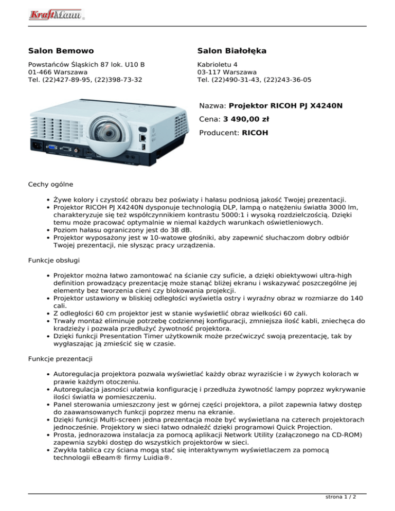Salon Bemowo Salon Białołęka Powstańców Śląskich 87 lok. U10 B 01-466 Warszawa Tel. (22)427-89-95, (22)398-73-32 Kabrioletu 4 03-117 Warszawa Tel. (22)490-31-43, (22)243-36-05 Nazwa: Projektor RICOH PJ X4240N Cena: 3 490,00 zł Producent: RICOH Cechy ogólne Żywe kolory i czystość obrazu bez poświaty i hałasu podniosą jakość Twojej prezentacji. Projektor RICOH PJ X4240N dysponuje technologią DLP, lampą o natężeniu światła 3000 lm, charakteryzuje się też współczynnikiem kontrastu 5000:1 i wysoką rozdzielczością. Dzięki temu może pracować optymalnie w niemal każdych warunkach oświetleniowych. Poziom hałasu ograniczony jest do 38 dB. Projektor wyposażony jest w 10-watowe głośniki, aby zapewnić słuchaczom dobry odbiór Twojej prezentacji, nie słysząc pracy urządzenia. Funkcje obsługi Projektor można łatwo zamontować na ścianie czy suficie, a dzięki obiektywowi ultra-high definition prowadzący prezentację może stanąć bliżej ekranu i wskazywać poszczególne jej elementy bez tworzenia cieni czy blokowania projekcji. Projektor ustawiony w bliskiej odległości wyświetla ostry i wyraźny obraz w rozmiarze do 140 cali. Z odległości 60 cm projektor jest w stanie wyświetlić obraz wielkości 60 cali. Trwały montaż eliminuje potrzebę codziennej konfiguracji, zmniejsza ilość kabli, zniechęca do kradzieży i pozwala przedłużyć żywotność projektora. Dzięki funkcji Presentation Timer użytkownik może przećwiczyć swoją prezentację, tak by wygłaszając ją zmieścić się w czasie. Funkcje prezentacji Autoregulacja projektora pozwala wyświetlać każdy obraz wyraziście i w żywych kolorach w prawie każdym otoczeniu. Autoregulacja jasności ułatwia konfigurację i przedłuża żywotność lampy poprzez wykrywanie ilości światła w pomieszczeniu. Panel sterowania umieszczony jest w górnej części projektora, a pilot zapewnia łatwy dostęp do zaawansowanych funkcji poprzez menu na ekranie. Dzięki funkcji Multi-screen jedna prezentacja może być wyświetlana na czterech projektorach jednocześnie. Projektory w sieci łatwo odnaleźć dzięki programowi Quick Projection. Prosta, jednorazowa instalacja za pomocą aplikacji Network Utility (załączonego na CD-ROM) zapewnia szybki dostęp do wszystkich projektorów w sieci. Zwykła tablica czy ściana mogą stać się interaktywnym wyświetlaczem za pomocą technologii eBeam® firmy Luidia®. strona 1 / 2 Specjalne piórko przechwytuje ręczne pismo prezentera, a także oferuje szereg innych możliwości takich jak np. wyświetlanie wstępnie zapisanych szablonów nauczania czy map. Podczas korzystania z funkcji Tryb Koloru Ściany projektor PJ X4240N dostosowuje kolory wyświetlanego obrazu, by zoptymalizować jakość podczas prezentacji na tle innym niż białe. Funkcje sieciowe Projektor PJ X4240N ma możliwość łączności Ethernet i jest kompatybilny z komputerami PC i Mac, więc wyświetlanie filmów i materiałów video nie stanowi problemu. Prezentacja może być wyświetlana z nośnika pamięci USB lub urządzenia kompatybilnego. Port HDMI umożliwia podłączenie odtwarzaczy DVD czy Blu-ray, by odtwarzać filmy nawet w formacie 3D. Administratorzy mają możliwość konfiguracji ustawień projektora i monitorowania użytkowania tak, aby usprawnić pracę i poprawić efektywność. Projektor RICOH PJ X4240N wspierany jest przez PJLink i Ricoh@Remote Service, dzięki którym administratorzy mogą zdalnie włączać i wyłączać urządzenia, konfigurować je z dowolnego miejsca, generować stan i raportowanie błędów, aby zapewnić optymalną wydajność i zwiększyć żywotność projektora. strona 2 / 2 Powered by TCPDF (www.tcpdf.org)