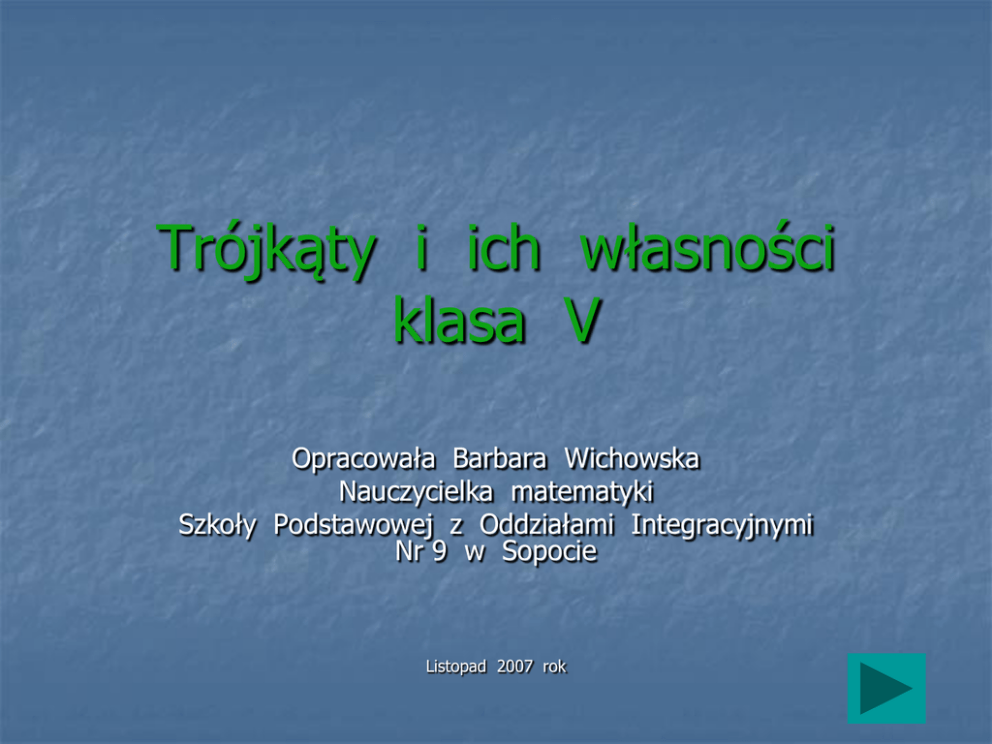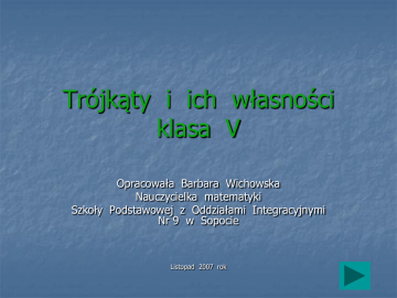 Trójkąty i ich własności klasa V Opracowała Barbara Wichowska Nauczycielka matematyki Szkoły Podstawowej z Oddziałami Integracyjnymi Nr 9 w Sopocie Listopad 2007 rok SPIS TREŚCI 1. Temat: Z jakich odcinków można zbudować trójkąt? 2. Temat: Rodzaje trójkątów i ich własności 3. Temat: Kąty w trójkątach Z jakich odcinków można zbudować trójkąt? CO TO JEST TRÓJKĄT ? Trójkąt - część płaszczyzny ograniczona łamaną zamkniętą składającą się z trzech odcinków, które stanowią boki trójkąta C A B CZY Z KAŻDYCH TRZECH ODCINKÓW MOŻNA ZBUDOWAĆ TRÓJKĄT? Przykład 1 a b c SPRÓBUJ Przykład 2 k l m SPRÓBUJ PRZYKŁAD 1 b c a Z tych odcinków można zbudować trójkąt Zastanów się dlaczego ? CZY Z KAŻDYCH TRZECH ODCINKÓW MOŻNA ZBUDOWAĆ TRÓJKĄT? Przykład 1 a b c SPRÓBUJ Przykład 2 k l m SPRÓBUJ Przykład 2 l k m Z tych odcinków nie można zbudować trójkąta Zastanów się dlaczego? podpowiedź Budowanie trójkątów z zapałek Uwaga: zapałek nie można łamać !!! Zadanie 1 sprawdź czy można zbudować trójkąt z trzech, czterech, pięciu …… zapałek? Swoje wyniki zapisz w zeszycie w takiej tabeli: BOKI TRÓJKĄTÓW a b PORÓWNANIE BOKÓW c a+b c b+c Czy można zbudować trójkąt? a a+c b Zadanie 2 z ilu zapałek nie można zbudować trójkąta ? Tak/Nie PORÓWNANIE BOKÓW TRÓJKĄTA b a c BOKI TRÓJKĄTÓW PORÓWNANIE BOKÓW Czy można zbudować trójkąt? a b c a+b c b+c a a+c b 1 2 3 3 3 5 1 4 2 NIE 2 2 3 4 3 5 2 5 2 TAK 3 5 2 8 2 7 3 5 5 NIE 10 12 15 22 15 27 10 25 12 TAK 12 7 4 19 7 NIE 25 12 10 37 10 22 25 35 12 NIE 4 11 12 16 Wnioski z obliczeń Przykłady, kiedy nie można było zbudować trójkąta: a+b = 8 > 37 > c a+c b 3 4 2 5 10 35 > 2 = 5 > 12 3 b+c a > 1 7 > 3 22 < 25 5 Przykłady, kiedy można zbudować trójkąt: a+b c > 3 22 > 15 4 więc: a+b > c a+c 5 25 b > 2 > 12 a+c > b b+c 5 27 a > 2 > 10 b+c > a Przypomnijmy jeszcze raz a+b > c a+c > b b+c > Trójkąt możemy zbudować, gdy suma długości dwóch boków jest większa od trzeciego boku Jest to warunek konieczny konstruowalności trójkątów POWRÓT DO SPRAWDZIANU a SPRAWDŹ SIĘ Zadanie 1: Sprawdź czy z podanych boków można zbudować trójkąt? a) |AB| = 8 cm |BC | = 10 cm |CA| = 4 cm |LM | = 35 dm NIE |MK| = 14 cm TAK c) |PR| = 2 m |PS | = 3 m NIE |RP| = 6 m TAK d) |AB| = 2,8 cm NIE |BC | = 4,9 cm |CA| = 1,4 cm TAK b) |KL| = 23 dm TAK e) |AB| = 3,3 dm TAK f) |AB| = 389 mm TAK |BC | = 14 cm |BC | = 0,82 m NIE |CA| = 0,187 m NIE |CA| = 5,14 dm NIE SOBIE ŚWIETNIE PORADZIŁEŚ POWRÓT DO SPRAWDZIANU Widać, że opanowałeś te zagadnienia POWRÓT DO SPRAWDZIANU PRZYKRO MI, ALE NIE UMIESZ JESZCZE TEGO jak POWRÓT DO SPRAWDZIANU SPRÓBUJ JESZCZE RAZ POMOC POWRÓT DO RAWDZIANU DZIĘKUJĘ ZA WSPÓLNĄ NAUKĘ Barbara Wichowska Rodzaje trójkątów i ich własności Wiemy już z jakich odcinków trójkąty mogą powstać. Czy wszystkie trójkąty są takie same? Czym się różnią? Zbadajmy to Klasyfikacja trójkątów ze względu na boki 1. Trójkąty o wszystkich bokach różnych różnych + bokach = trójkąty różnoboczne bok b = 10 cm bok a = 5 cm bok c = 13 cm Klasyfikacja trójkątów ze względu na boki 2. Trójkąty o wszystkich bokach równych równych + bokach = trójkąty równoboczne bok k = 8 m bok l = 8 m bok m = 8 m Klasyfikacja trójkątów ze względu na boki 3. Trójkąty o dwóch bokach równych ramię = ramię k=7 cm ramię k=7 cm ramię podstawa m= 5 cm trójkąt równoramienny Klasyfikacja trójkątów ze względu na kąty A kąt BAC ( kąt CAB ) kąt B kąty możemy oznaczać za pomocą wierzchołków trójkąta lub literami greckimi Kąt ABC ( kąt CBA) kąt γ C kąt ACB ( kąt BCA ) kąt γ Klasyfikacja trójkątów ze względu na kąty 1. Trójkąty, które mają wszystkie kąty ostre kąty , , γ < 90º ostre γ podstawa kąty = trójkąty ostrokątne Klasyfikacja trójkątów ze względu na kąty 2. Trójkąty, które mają dwa kąty ostre i jeden kąt prosty przyprostokątna prosty kąt = trójkąt prostokątny = 90º przyprostokątna Klasyfikacja trójkątów ze względu na kąty 3. Trójkąty, które mają dwa kąty ostre i jeden kąt rozwarty rozwarty kąt = trójkąt rozwartokątny > 90º < 90º Klasyfikacja trójkątów ze względu na boki i kąty Spróbuj, sklasyfikować podane trójkąty: Trójkąt różnoboczny ze względu na boki (kliknij tutaj po pomoc) ze względu na kąty (kliknij tutaj po pomoc) Trójkąt rozwartokątny ze względu na boki (kliknij ze względu na kąty (kliknij Trójkąt ostrokątny Trójkąt równoramienny ) pomoc) tutaj po pomoc tutaj po Klasyfikacja trójkątów ze względu na boki i kąty Trójkąt różnoboczny ze względu na boki (kliknij ze względu na kąty (kliknij Trójkąt ostrokątny ze względu na boki (kliknij ze względu na kąty (kliknij Trójkąt prostokątny ) pomoc) tutaj po pomoc tutaj po Trójkąt różnoboczny ) pomoc) tutaj po pomoc tutaj po Klasyfikacja trójkątów ze względu na boki i kąty Trójkąt równoramienny ze względu na boki (kliknij ze względu na kąty (kliknij Trójkąt prostokątny tutaj po Trójkąt równoboczny ze względu na boki (kliknij ze względu na kąty (kliknij Trójkąt ostrokątny ) pomoc) tutaj po pomoc ) pomoc) tutaj po pomoc tutaj po Klasyfikacja trójkątów ze względu na boki i kąty Trójkąt równoramienny ze względu na boki (kliknij ze względu na kąty (kliknij Trójkąt rozwartokątny ) pomoc) tutaj po pomoc tutaj po Ile odpowiedzi było prawidłowych? 1 - 4 5 - 7 8 - 9 10 - 12 13 - 14 Otrzymałeś 1 - 4 dobre odpowiedzi To nie jest satysfakcjonujący wynik !!! Nie ma co rozpaczać Proponuję wrócić i przerobić ten materiał jeszcze raz powrót Otrzymałeś 5 - 7 dobrych odpowiedzi No, już nieźle … ale czy jesteś zadowolony ze swojego wyniku? Obudź się, stać cię na więcej. Pokaż co potrafisz!!! Więc do pracy !!! Wracamy jeszcze raz Otrzymałeś 8 - 9 dobrych odpowiedzi Jest trochę lepiej. Masz się czym pochwalić. Opan