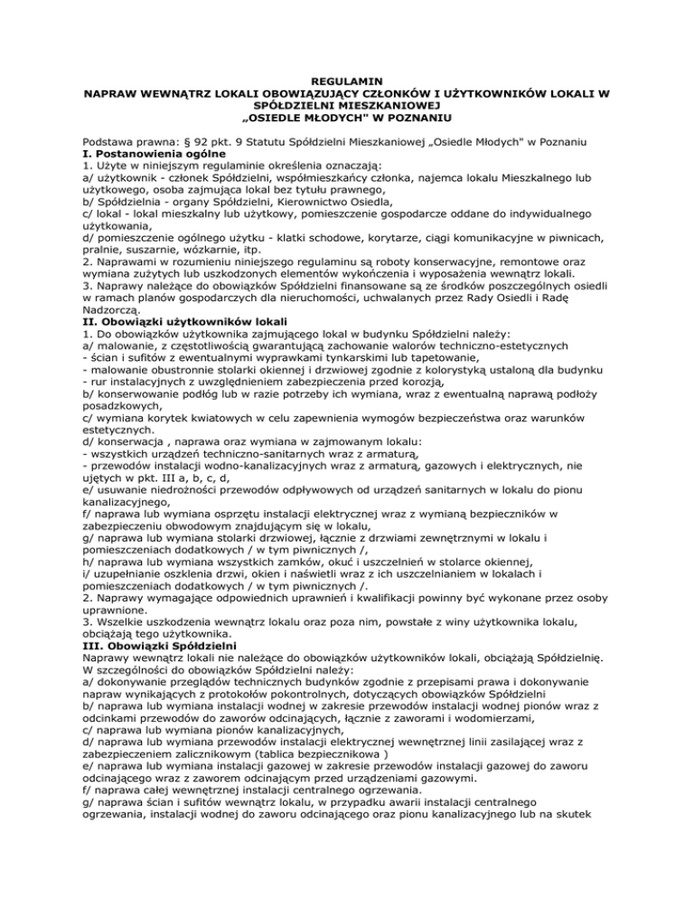REGULAMIN NAPRAW WEWNĄTRZ LOKALI OBOWIĄZUJĄCY CZŁONKÓW I UŻYTKOWNIKÓW LOKALI W SPÓŁDZIELNI MIESZKANIOWEJ „OSIEDLE MŁODYCH" W POZNANIU Podstawa prawna: § 92 pkt. 9 Statutu Spółdzielni Mieszkaniowej „Osiedle Młodych" w Poznaniu I. Postanowienia ogólne 1. Użyte w niniejszym regulaminie określenia oznaczają: a/ użytkownik - członek Spółdzielni, współmieszkańcy członka, najemca lokalu Mieszkalnego lub użytkowego, osoba zajmująca lokal bez tytułu prawnego, b/ Spółdzielnia - organy Spółdzielni, Kierownictwo Osiedla, c/ lokal - lokal mieszkalny lub użytkowy, pomieszczenie gospodarcze oddane do indywidualnego użytkowania, d/ pomieszczenie ogólnego użytku - klatki schodowe, korytarze, ciągi komunikacyjne w piwnicach, pralnie, suszarnie, wózkarnie, itp. 2. Naprawami w rozumieniu niniejszego regulaminu są roboty konserwacyjne, remontowe oraz wymiana zużytych lub uszkodzonych elementów wykończenia i wyposażenia wewnątrz lokali. 3. Naprawy należące do obowiązków Spółdzielni finansowane są ze środków poszczególnych osiedli w ramach planów gospodarczych dla nieruchomości, uchwalanych przez Rady Osiedli i Radę Nadzorczą. II. Obowiązki użytkowników lokali 1. Do obowiązków użytkownika zajmującego lokal w budynku Spółdzielni należy: a/ malowanie, z częstotliwością gwarantującą zachowanie walorów techniczno-estetycznych - ścian i sufitów z ewentualnymi wyprawkami tynkarskimi lub tapetowanie, - malowanie obustronnie stolarki okiennej i drzwiowej zgodnie z kolorystyką ustaloną dla budynku - rur instalacyjnych z uwzględnieniem zabezpieczenia przed korozją, b/ konserwowanie podłóg lub w razie potrzeby ich wymiana, wraz z ewentualną naprawą podłoży posadzkowych, c/ wymiana korytek kwiatowych w celu zapewnienia wymogów bezpieczeństwa oraz warunków estetycznych. d/ konserwacja , naprawa oraz wymiana w zajmowanym lokalu: - wszystkich urządzeń techniczno-sanitarnych wraz z armaturą, - przewodów instalacji wodno-kanalizacyjnych wraz z armaturą, gazowych i elektrycznych, nie ujętych w pkt. III a, b, c, d, e/ usuwanie niedrożności przewodów odpływowych od urządzeń sanitarnych w lokalu do pionu kanalizacyjnego, f/ naprawa lub wymiana osprzętu instalacji elektrycznej wraz z wymianą bezpieczników w zabezpieczeniu obwodowym znajdującym się w lokalu, g/ naprawa lub wymiana stolarki drzwiowej, łącznie z drzwiami zewnętrznymi w lokalu i pomieszczeniach dodatkowych / w tym piwnicznych /, h/ naprawa lub wymiana wszystkich zamków, okuć i uszczelnień w stolarce okiennej, i/ uzupełnianie oszklenia drzwi, okien i naświetli wraz z ich uszczelnianiem w lokalach i pomieszczeniach dodatkowych / w tym piwnicznych /. 2. Naprawy wymagające odpowiednich uprawnień i kwalifikacji powinny być wykonane przez osoby uprawnione. 3. Wszelkie uszkodzenia wewnątrz lokalu oraz poza nim, powstałe z winy użytkownika lokalu, obciążają tego użytkownika. III. Obowiązki Spółdzielni Naprawy wewnątrz lokali nie należące do obowiązków użytkowników lokali, obciążają Spółdzielnię. W szczególności do obowiązków Spółdzielni należy: a/ dokonywanie przeglądów technicznych budynków zgodnie z przepisami prawa i dokonywanie napraw wynikających z protokołów pokontrolnych, dotyczących obowiązków Spółdzielni b/ naprawa lub wymiana instalacji wodnej w zakresie przewodów instalacji wodnej pionów wraz z odcinkami przewodów do zaworów odcinających, łącznie z zaworami i wodomierzami, c/ naprawa lub wymiana pionów kanalizacyjnych, d/ naprawa lub wymiana przewodów instalacji elektrycznej wewnętrznej linii zasilającej wraz z zabezpieczeniem zalicznikowym (tablica bezpiecznikowa ) e/ naprawa lub wymiana instalacji gazowej w zakresie przewodów instalacji gazowej do zaworu odcinającego wraz z zaworem odcinającym przed urządzeniami gazowymi. f/ naprawa całej wewnętrznej instalacji centralnego ogrzewania. g/ naprawa ścian i sufitów wewnątrz lokalu, w przypadku awarii instalacji centralnego ogrzewania, instalacji wodnej do zaworu odcinającego oraz pionu kanalizacyjnego lub na skutek nieszczelności dachu i ścian zewnętrznych. Użytkownik lokalu na swój wniosek może otrzymać ekwiwalent za zniszczenia powstałe z winy Spółdzielni, udokumentowane protokołem z oględzin, w oparciu o wycenę zatwierdzoną przez Kierownictwo Osiedla. Ekwiwalent zostanie wypłacony po wykonaniu prac. h/ naprawa stolarki okiennej, za wyjątkiem zamków, okuć i uszczelnień lub jej wymiana, i/ naprawa ścian, posadzek balkonowych i balustrad oraz usuwanie przecieków przez loggie i balkony. j/ malowanie pomieszczeń ogólnego użytku. IV. Postanowienia szczegółowe dotyczące zmian w lokalach i budynkach 1. Zakazuje się użytkownikom lokali wykonywania następujących robót: a/ stosowania automatu ciśnieniowego przy misce ustępowej, b/ montażu paneli natryskowych, wanien z hydromasażem na instalacji wewnętrznej lokalu nie wyposażonej w zawór zwrotny, c/ montażu wentylatorów elektrycznych do przewodów wentylacji i szachów instalacyjnych, d/ zabudowy szachtów instalacyjnych oraz wykorzystywania ich na cele gospodarcze, e/ przeróbek instalacji gazowej do zaworu odcinającego przed urządzeniami, f/ malowania stolarki okiennej zewnętrznej, balkonów i loggii oraz elementów konstrukcyjnych niezgodnych z kolorystyką budynku, g/ zabudowy balkonów i loggii, h/ montażu lub demontażu osłon balkonowych, i/ montażu krat na balkonach i loggiach. 2. Bez pisemnej zgody Spółdzielni, zakazuje się użytkownikom lokali wykonywania następujących robót: a/ demontażu i wymiany grzejników, b/ zabudowy ciągów komunikacyjnych, c/ przeróbek ścian konstrukcyjnych i działowych, d/ przeróbek instalacji elektrycznej, e/ wymiany stolarki okiennej, f/ montażu urządzeń telekomunikacyjnych, radiowo-telewizyjnych i łączności, g/ montażu szyldów i reklam, h/ montażu żaluzji i rolet zewnętrznych. V. Postanowie