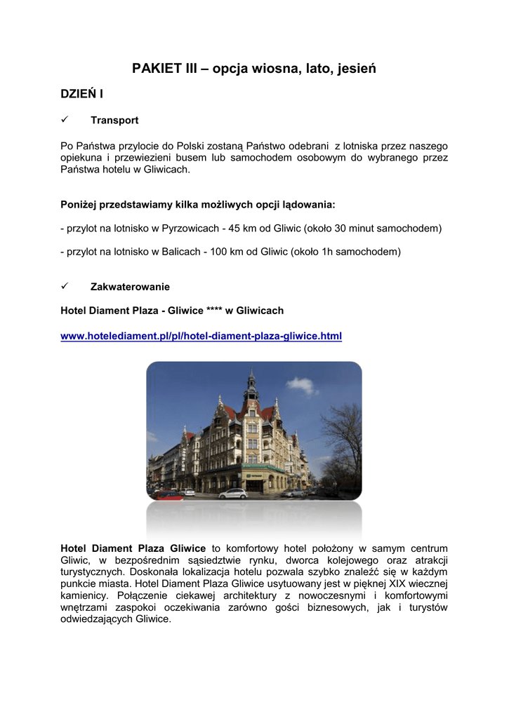 PAKIET III – opcja wiosna, lato, jesień DZIEŃ I Transport Po Państwa przylocie do Polski zostaną Państwo odebrani z lotniska przez naszego opiekuna i przewiezieni busem lub samochodem osobowym do wybranego przez Państwa hotelu w Gliwicach. Poniżej przedstawiamy kilka możliwych opcji lądowania: - przylot na lotnisko w Pyrzowicach - 45 km od Gliwic (około 30 minut samochodem) - przylot na lotnisko w Balicach - 100 km od Gliwic (około 1h samochodem) Zakwaterowanie Hotel Diament Plaza - Gliwice **** w Gliwicach www.hotelediament.pl/pl/hotel-diament-plaza-gliwice.html Hotel Diament Plaza Gliwice to komfortowy hotel położony w samym centrum Gliwic, w bezpośrednim sąsiedztwie rynku, dworca kolejowego oraz atrakcji turystycznych. Doskonała lokalizacja hotelu pozwala szybko znaleźć się w każdym punkcie miasta. Hotel Diament Plaza Gliwice usytuowany jest w pięknej XIX wiecznej kamienicy. Połączenie ciekawej architektury z nowoczesnymi i komfortowymi wnętrzami zaspokoi oczekiwania zarówno gości biznesowych, jak i turystów odwiedzających Gliwice. POKOJE Hotel posiada 67 komfortowych pokoi wyposażonych w telewizory LCD z wyborem kanałów telewizji satelitarnej, biurka do pracy, mini bary, bezpłatne łącze internetowe oraz telefon i łazienki z kabiną prysznicową lub wanną, w tym 12 klimatyzowanych pokoi typu BUSINESS o podwyższonym standardzie, wyposażonych dodatkowo w sejfy elektroniczne. Do dyspozycji Gości oddajemy także stylowo urządzony Apartament Gdański. RESTAURACJA Restauracja Atmosfera to kameralna i niezwykle urokliwa restauracja w centrum Gliwic. Klimat restauracji tworzą oryginalne witraże na ścianach oraz wystawa niepowtarzalnej, włoskiej porcelany. W menu restauracji znajdą Państwo zarówno aromatyczne i lekkie dania, jak i tradycyjne potrawy regionalne w nowoczesnym wydaniu DZIEŃ II Wizyta w gabinecie stomatologicznym. DZIEŃ III Trzeciego dnia chcielibyśmy zaproponować Państwu naukę gry w golfa na profesjonalnym polu golfowym, pod czujnym okiem instruktora. Dla tych z Państwa, którzy już potrafią grać proponujemy podszlifowanie swoich umiejętności oraz grę na pełnowymiarowym polu. Kraków Valley Golf & Country Club Krakow Valley Golf & Country Club to pierwsze w południowej Polsce, 18-dołkowe pole golfowe klasy mistrzowskiej, zaprojektowane przez jednego ze znanych architektów golfowych - Ronalda Freama z Kaliforni. O wyborze lokalizacji zadecydowały walory krajobrazowe Jury Krakowsko – Częstochowskiej, a szczególnie sąsiadujących terenów Jurajskich Parków Krajobrazowych. Pole golfowe, wybudowane według standardu USGA, może zaspokoić ambicję najbardziej wymagających graczy. Całkowita długość pola z professional tee wynosi 6518 m . Zróżnicowanie topograficzne, szerokie, pofałdowane fairway’e, głębokie bunkry – to najbardziej charakterystyczne elementy. Wkomponowane w typowo jurajski krajobraz, otoczone granicą gęstego lasu, robią duże wrażenie, nawet na golfistach, którzy odwiedzili najpiękniejsze pola golfowe świata. Jest to jeden z najnowocześniejszych obiektów treningowych w Europie. Miejsce treningów i zgrupowań polskiej kadry narodowej juniorów. Na terenie Kraków Valley Golf & Country Club znajduje się Akademia Golfa - to miejsce przeznaczone do nauki gry w golfa dla początkujących oraz do treningu dla zaawansowanych graczy. Na obszarze 20ha znajdą Państwo miejsca służące do treningu poszczególnych elementów gry, a także wszystkie przeszkody, które mogą Państwa spotkać na mistrzowskim polu golfowym: Driving Range: miejsce służące do treningu wybijania piłki na odległość Pole golfowe Akademii Golfa, par 18: wokół Driving Range rozlokowano 6 dołków stanowiących odrębne, treningowe pole golfowe. Krótsze niż na mistrzowskim polu golfowym dołki, sprawią, że nawet początkujący mogą odnieść sukces! Putting Green: teren pokryty bardzo nisko koszoną trawą, na którym znajdują się dołki; służy do ćwiczenia wbijania piłki do dołka. 2 Chipping greeny: miejsca służące do nauki wybijania piłki z wyższej trawy na green Bunkry treningowe: zagłębienia wypełnione piaskiem, gdzie ćwiczymy trudną umiejętność wybijania piłki z piasku DZIEŃ IV Wizyta w gabinecie stomatologicznym. Dzień V Piątego dnia chcielibyśmy pokazać Państwu jedno z najbardziej urokliwych miejsc w tych okolicach, a mianowicie tereny Jury Krakowsko-Częstochowskiej. Tam poza niebywałymi walorami estetycznymi zapewnimy Państwu zajęcia, które znacznie podniosą poziom Państwa adrenaliny, ale przede wszystkim pozostawią wiele nie zapomnianych wrażeń. Wyprawa samochodami terenowymi Podczas tej wyprawy chcielibyśmy zaproponować Państwu przejazd samochodami terenowymi – Land Rover Discovery przez urokliwe tereny Jury KrakowskoCzęstochowskiej połączony z elementami przeprawy. Będzie to nie tylko okazja do podziwiania piękna Orlich Gniazd czyli pozostałości po wspaniałych, średniowiecznych zamkach, ale przede wszystkim możliwość spróbowania pokonania wyznaczonej trasy profesjonalnym samochodem terenowym. Zaś dla tych z Państwa, którzy mieli już styczność z takimi pojazdami będzie to okazja do podszkolenia techniki jazdy. Wytyczona przez nas trasa to kopia trasy słynnego polskiego rajdu przeprawowego Poland Trophy - odpowiednio dostosowana do poziomu i umiejętności uczestników. Podczas wyprawy nie zabraknie jednak przeprawy przez rozlewiska, rzeki, tereny bagienne, strome zjazdy i trawersy piaskowe zaskoczą spektakularnością! W każdym samochodzie terenowym znajdował się będzie instruktor, który czuwał będzie nad Państwa bezpieczeństwem oraz służył pomocą w awaryjnych sytuacjach. Uwaga: zawsze po drogach asfaltowych samochód prowadzi instruktor!!! Nasi instruktorzy to między innymi organizatorzy licznych wypraw do Afryki czy Mongolii, a także organizatorzy i uczestnicy wypraw i zawodów Pucharu Polski. Podczas wypra