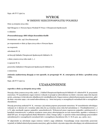 Sygn. akt IV U 350/14 WYROK W IMIENIU RZECZYPOSPOLITEJ POLSKIEJ Dnia 13 sierpnia 2014 roku Sąd Okręgowy w Nowym Sączu Wydział IV Pracy i Ubezpieczeń Społecznych w składzie: Przewodniczący: SSO Alicja Kowalska-Kulik Protokolant: sekr. sąd. Ewa Rusnarczyk po rozpoznaniu w dniu 31 lipca 2014 roku w Nowym Sączu na rozprawie odwołania W. K. od decyzji Zakładu Ubezpieczeń Społecznych Oddział w N. z dnia 5 marca 2014 roku znak: (...) w sprawie W. K. przeciwko Zakładowi Ubezpieczeń Społecznych Oddział w N. o emeryturę zmienia zaskarżoną decyzję w ten sposób, że przyznaje W. K. emeryturę od dnia 1 grudnia 2013 roku. Sygn. akt IV U 350/14 UZASADNIENIE wyroku z dnia 13 sierpnia 2014 roku Decyzją z dnia 5 marca 2014 roku, znak: (...) Zakład Ubezpieczeń Społecznych Oddział w N. odmówił W. K. przyznania emerytury. W uzasadnieniu organ rentowy wskazał, iż przyjął za udowodnione na dzień 1 stycznia 1999 roku łącznie 29 lat, 4 miesiące i 6 dni okresów składkowych i nieskładkowych. Organ rentowy odmówił przyznania emerytury, gdyż do dnia 1 stycznia 1999 r. nie został udowodniony 15 – letni staż pracy w szczególnych warunkach lub w szczególnym charakterze. Decyzję powyższą zaskarżył W. K., wnosząc o jej zmianę poprzez przyznanie emerytury. W uzasadnieniu odwołujący wskazał, że w okresie od 1 września 1969 roku do 24 września 2002 roku był zatrudniony w Przedsiębiorstwie (...) w N. jako mechanik napraw pojazdów samochodowych. Wykonywał prace naprawcze pojazdów autobusowych w kanałach remontowych, w pełnym wymiarze czasu pracy obowiązującym na tym stanowisku, zgodnie z wykazem A dział XIV poz. 16 rozporządzenia Rady Ministrów z dnia 7 lutego 1983 r. w sprawie wieku emerytalnego pracowników zatrudnionych w szczególnych warunkach lub w szczególnym charakterze (Dz. U. Nr 8, poz. 43, z późn. zm.). W odpowiedzi na odwołanie organ rentowy wniósł o jego oddalenie. Uzasadniając swoje stanowisko ponownie wyjaśnił, że Zakład odmówił przyznania emerytury, gdyż na dzień 1 stycznia 1999 roku odwołujący nie udokumentował 15 lat pracy w szczególnych warunkach lub w szczególnym charakterze. Podniósł, iż w świadectwie pracy z dnia 28 kwietnia 2009 roku wydanym przez (...) w N. stwierdzono, że odwołujący nie wykonywał pracy w warunkach szczególnych. Bezspornym w niniejszej sprawie jest, że W. K., ur. (...), udowodnił na dzień 1 stycznia 1999 roku 29 lat, 4 miesiące i 6 dni okresów składkowych i nieskładkowych. Odwołujący nie jest członkiem otwartego funduszu emerytalnego, a wniosek o przyznanie emerytury złożył w dniu 20 grudnia 2013 roku. Sąd ustalił następujący stan faktyczny: W okresie od dnia 1 września 1969 roku do dnia 24 czerwca 2002 roku W. K. był zatrudniony w Przedsiębiorstwie (...) S.A. W okresie od 1 września 1969 roku do 24 czerwca 1972 roku odwołujący był uczniem (...) Szkoły Zawodowej dla Pracujących (...) – Oddział w N. w zawodzie mechanik-kierowca pojazdów samochodowych. Nauka odbywała się w systemie trzech dni pracy i trzech dni nauki. Po ukończeniu szkoły, od dnia 1 sierpnia 1972 roku odwołujący rozpoczął pracę stale i w pełnym wymiarze czasu pracy na stanowisku mechanika napraw pojazdów samochodowych. Odwołujący pracował na stacji obsługi (...) na ul. (...) w N.. Dokonywano tam napraw zarówno autobusów, jak i samochodów ciężarowych służących do przewozu towarów. Przedsiębiorstwo posiadało ok. 100 autobusów oraz ok. 100 samochodów ciężarowych wraz z przyczepami. Odwołujący jako mechanik naprawiał wszystkie zespoły i podzespoły pojazdów, tj. układów zawieszenia: resory, osie przednie; układów hamulcowych; układów kierowniczych, skrzyni biegów, sprzęgła, silników i in. Czynności te były wykonywane w 14 kanałach remontowych o długości ok. 10 metrów, w których mogło pracować jednocześnie kilku mechaników (1-4). Początkowo w (...) pracowało ok. 100 mechaników, później ich liczba ulegała zmniejszeniu do 60 - 70 osób. Praca była świadczona w trybie zmianowym (trzy zmiany), na jednej zmianie pracowało początkowo ok. 30 mechaników, później liczba ta się zmniejszała. Odwołujący wszystkie naprawy wykonywał w kanale remontowym. Poza kanałem znajdował się w celu np. wjechania pojazdem na kanał czy wyjechania z niego, odkręcenia koła, by dokonać naprawy hamulców, czy też by przynieść potrzebną część. Odwołujący w ciągu dnia spędzał ok. 7 godzin w kanale. Wraz z odwołującym był zatrudniony m.in. S. O. na identycznym stanowisku, tj. mechanik napraw samochodowych, oraz S. M. jako kontroler techniczny na stacji diagnostycznej. dowód : świadectwo pracy z dnia 25.06.2002r. k. 3 akt ZUS, zeznania świadków : S. M. od 04:43 min do 17:13 min, S. O. od 17:28 min do 29:02 min, oraz zeznania odwołującego od 29:32 min do 39:08 min, akta osobowe odwołującego, akta emerytalne S. O., Wyrokiem z dnia 14 czerwca 2012 r. sygn. akt IV P 133/12 Sąd Rejonowy w Nowym Sączu Wydział IV Pracy i Ubezpieczeń Społecznych ustalił, że powodowie P. W. i S. O. zatrudnieni w (...) S.A. w likwidacji wykonywali stale i w pełnym wymiarze czasu pracy – pracę w warunkach szczególnych na stanowisku mechanika w kanałach remontowych przy naprawie pojazdów mechanicznych od 1 stycznia 1980 r. do 10 maja 2009 r. Zakład Ubezpieczeń Społecznych Oddział w N. przyznał S. O. emeryturę z tytułu pracy w warunkach szczególnych od 21 lipca 2012 r. – na podstawie powyższego wyroku. (dowód : akta emerytalne świadka S. O., akta Sądu Rejonowego w Nowym Sączu, sygn. IV P 133/12 ) Powyższy stan faktyczny Sąd ustalił na podstawie akt ZUS oraz akt osobowych, której wiarygodności i mocy dowodowej żadna ze stron nie kwestionowała w toku postępowania. Sąd oparł się również na zeznaniach odwołującego się oraz świadków S. M. i S. O., uznając je za wiarygodne, spójne, logiczne i zgodne z pozostałym