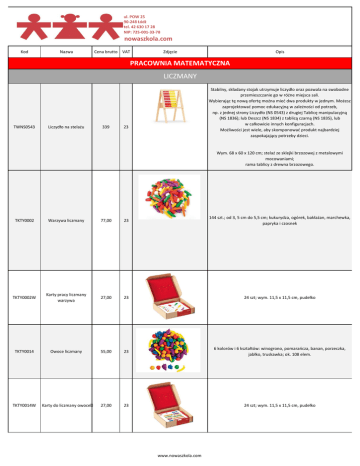 ul. POW 25 90-248 Łódź tel. 42 630 17 28 NIP: 725-001-33-78 nowaszkola.com Kod Nazwa Cena brutto VAT Zdjęcie Opis PRACOWNIA MATEMATYCZNA LICZMANY TWNS0543 Liczydło na stelażu 339 Stabilny, składany stojak utrzymuje liczydło oraz pozwala na swobodne przemieszczanie go w różne miejsca sali. Wybierając tę nową ofertę można mied dwa produkty w jednym. Możesz zaprojektowad pomoc edukacyjną w zależności od potrzeb, np. z jednej strony Liczydło (NS 0543) z drugiej Tablicę manipulacyjną (NS 1836); lub Deszcz (NS 1834) z tablicą czarną (NS 1835), lub w całkowicie innych konfiguracjach. Możliwości jest wiele, aby skomponowad produkt najbardziej zaspokajający potrzeby dzieci. 23 Wym. 68 x 60 x 120 cm; stelaż ze sklejki brzozowej z metalowymi mocowaniami; rama tablicy z drewna brzozowego. TKTY0002 Warzywa liczmany 77,00 23 144 szt.; od 3, 5 cm do 5,5 cm; kukurydza, ogórek, bakłażan, marchewka, papryka i czosnek TKTY0002W Karty pracy liczmany warzywa 27,00 23 24 szt; wym. 11,5 x 11,5 cm, pudełko TKTY0014 Owoce liczmany 55,00 23 6 kolorów i 6 kształtów: winogrono, pomaraocza, banan, porzeczka, jabłko, truskawka; ok. 108 elem. TKTY0014W Karty do liczmany owoce 27,00 23 24 szt; wym. 11,5 x 11,5 cm, pudełko www.nowaszkola.com nowaszkola.com Kod Nazwa Cena brutto VAT Zdjęcie Opis TKTY6475 Zwierzątka. Klocki złączki 49,00 23 Zwierzątka łączące się ze sobą łapkami i brzuszkami, wykonane z elastycznego tworzywa sztucznego. Zestaw zawiera 70 szt. zwierzątek w różnych kolorach. Z klocków można układad piramidy, okręgi, układad zwierzątka w rzędy, a także wykorzystywad je do układania rytmów lub jako liczmany podczas zajęd matematycznych. Wym.: 6 x 6 cm. wiek: 3+ TKTY6475W Złączki zwierzątka. Karty pracy 27,00 23 24 szt.; wym. 11,5 x 11,5 cm, pudełko TKTY0009 Zwierzęta 3 wysokości. Liczmany 86,00 23 108 szt., 3 wysokości zwierząt: od ok. 2,5 cm do ok. 4 cm TKTY0009W Karty pracy do Liczmanów 3 wysokości 27,00 23 24 szt; wym. 11,5 x 11,5 cm, pudełko TKTY7119 Liczmany sześciany 45,00 23 TKTY7119W Karty do liczmany sześciany 27,00 23 24 szt; wym. 11,5 x 11,5 cm, pudełko TKLR3372 Liczbowa rodzinka. Liczmany 97,00 23 72 szt; wym. 11,5 x 11,5 cm, pudełko 4 kolory, 100 szt. Wym. 2 cm www.nowaszkola.com nowaszkola.com Kod Nazwa Cena brutto VAT TKLR0180 Zwierzęta. Liczmany 57,00 23 6 zwierząt (krowa, owca, koo, kura, świnka i kaczka). Każde ze zwierząt występuje w sześciu kolorach (zielonym, żółtym, fioletowym, czerwonym, niebieskim i pomaraoczowym); 72 szt.; wym. ok. 2,5 cm TKMC1145 Misiowa rodzinka. Liczmany 55,00 23 Misiowa rodzinka to: pan miś (waga 12 g), pani misiowa (waga 8 g) i 4 misiaczki każdy o wadze 4 g. Instrukcja licznych zajęd z misiową rodzinką. 96 szt.: 16 misiów, 16 misiowych, 64 misiaczki, w zestawie nie ma walizki TKTY6336 Liczmany Łaocuch 45,00 23 Uniwersalny materiał do sortowania, przeliczania, mierzenia oraz tworzenia rytmów. Łączenie ogniwek doskonali zdolności manualne i koordynację wzrokowo-ruchową. 200 szt. w 4 kolorach; wym. 5 x 7 cm 23 Dwustronne karty z zadaniami o określonym stopniu trudności od 1 do 4. Ilustracje na kartach odpowiadają wszystkim cechom, które można dostrzec na liczmanach (Misiowa rodzinka, MC 1145). Korzystanie z kart dwiczy u dziecka m. in. wykonywanie poleceo według instrukcji, rozróżnianie kolorów, kształci wrażliwośd na powtarzające się sekwencje, rytm oraz logiczne myślenie. 16 kart o wym. 29,3 x 11,3 cm 23 Zestaw kolorowych ogniwek w kształcie figur geometrycznych. Pozwala na układanie dowolnych ciągów rytmicznych. Łączenie ze sobą ogniwek doskonali zdolności manualne i koordynację wzrokowo-ruchową. Dzieci poznają kształty figur geometrycznych. Ogniwa mogą służyd jako liczmany, można je sortowad według koloru, kształtu bądź rozmiaru. 4 kolory; 40 szt.; wym. od 3 do 7 cm TKLR0753 TKTY7211 Karty aktywności. Misiowa rodzinka Liczmany Geometryczny łaocuch 54,00 26,00 Zdjęcie Opis TKTL9174 Studnia Jakuba. Gra zręcznościowa 63,00 23 Drążki służą do odtwarzania i układania kształtów: liter, cyfr, znaków, figur geometrycznych. Umożliwiają tworzenie wielu własnych gier, poprzez zliczanie, przyporządkowywanie kolorom wartości. 60 drewnianych drążków o śr. 1 cm i dł. 18 cm; 1 drewniana kostka z kolorowymi ściankami TKAG3686 Patyczki do liczenia krótkie 8,00 23 ok. 40 sztuk długośd 59mm www.nowaszkola.com nowaszkola.com Kod Nazwa Cena brutto VAT TKTY7210 Patyczki do liczenia długie 75,00 23 1000 szt., dł.10 cm, 10 kolorów TKFI1510 Kolorowe liczby. Klocki matematyczne 46,00 23 Klocki o różnej długości w 10 kolorach. Najmniejszy biały klocek ilustruje liczbę 1 i jest punktem odniesienia dla innych klocków w zestawie które są jego wielokrotnością. od 3 lat; 186 klocków; wym. pudełka 19 x 17 cm 23 Zabawa polega na układaniu obrazków z patyczków. Dzieci mogą układad je według wzorów umieszczonych na planszach, lub tworzyd własne kompozycje. 60 patyczków (12 x 4 cm) w czterech kolorach; 8 dwustronnych plansz (wym. 17,5 x 25 cm) z wzorami do układania; 1–2 graczy; od 3 lat 23 Drewniane kolorowe liczmany w formie długich pałeczek, posiadające na koocach podwójne boczne magnesy, dzięki którym liczmany łatwo można łączyd w grupy oraz tworzyd z nich różnorodne konstrukcje. Zestaw zawiera 100 szt. liczmanów o przekroju okrągłym w 5 kolorach (drewno, niebieski, żółty, czerwony, zielony). Wymiary: śr. 0,8 cm, dł. 30 cm. Wiek: 3+ TKGR0092 TKNS0390 Patyczaki. Układanka edukacyjna Liczmany magnetyczne konstrukcyjne 52,00 169,00 Zdjęcie Opis TKEI0192 Liczmany-żetony 45,00 23 Przezroczysta wersja kolorowych krążków. Niezwykle ekonomiczne i trwałe liczmany do sortowania, przeliczania i przeprowadzania prostych działao. Praca z liczmanami pozwalają dzieciom na naukę matematyki poprzez manipulację konkretnym materiałem. Krążki można wykorzystad do przeprowadzania dwiczeo w so