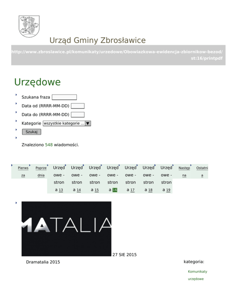 Urząd Gminy Zbrosławice http://www.zbroslawice.pl/komunikaty/urzedowe/Obowiazkowa-ewidencja-zbiornikow-bezod/ st:16/printpdf Urzędowe Szukana fraza Data od (RRRR-MM-DD) Data do (RRRR-MM-DD) Kategorie wszystkie kategorie ... ▼ Szukaj Znaleziono 548 wiadomości. Pierws Poprze Urzęd Urzęd Urzęd Urzęd Urzęd Urzęd Urzęd Następ Ostatni za dnia owe - owe - owe - owe - owe - owe - owe - na a stron stron stron stron stron stron stron a 13 a 14 a 15 a a 17 a 18 a 19 16 27 SIE 2015 Dramatalia 2015 kategoria: Komunikaty urzędowe Wójt Gminy Zbrosławice Wiesław Olszewski zaprasza na tegoroczne Dramatalia oraz IV Gminną Wystawę Koron Żniwnych, które odbędą się 19 i 20 września. Początek imprezy w sobotę o godzinie 16:30. Wstęp wolnyDRAMATALIA - programNa scenie Zbrosławice, ul. Oświęcimska 2 (plac za Urzędem Gminy)Sobota:16:30 BLASKAPELLE 17:30 Prosto z gminy: ANY, DFK, JADWIŻKI 18:15 STA łączy pokolenia19:00 MARIA WYLĘŻEK 20:00 18 SIE 2015 kategoria: Bezpłatna pomoc prawna Komunikaty urzędowe Wójt Gminy Zbrosławice Wiesław Olszewski, wraz z Kancelarią Radcy Prawnego B.P. "Lexus", zaprasza mieszkańców i firmy do udziału w pilotażowym programie bezpłatnej pomocy prawnej. Pierwsze spotkania odbędą się w dniach 3 i 24 września br. w godzinach 10:00-15:00 w siedzibie Urzędu Gminy Zbrosławice przy ul. Oświęcimskiej 2 w pokoju nr 8 (2 piętro). Prosimy o wcześniejsze zgłoszenia pod nr tel. 509 496 772 lub poprzez 12 SIE 2015 Festyn odpustowy w Zbrosławicach 10 SIE 2015 kategoria: Ogłoszenie Komunikaty urzędowe Wójt Gminy Zbrosławice informuje, że został wywieszony na okres 21 dni, tj. od dnia 06.08.2015 r. do dnia 27.08.2015 r. na tablicy ogłoszeń Urzędu Gminy w Zbrosławicach przy ul.Oświęcimskiej 2, wykaz nieruchomości przeznaczonych do dzierżawy: działka nr 1315/239 (k. m. 2 dod. 3 obręb Ptakowice) o pow. 0,0300 ha. działka nr 665/266 (k. m. 1 obręb Kamieniec) o pow. 0,0532 ha. działka nr 207/8 (k. m. 2 dod. 3 obręb 28 LIP 2015 Informacja Urzędu Gminy kategoria: Komunikaty urzędowe Informujemy, że w najbliższy piątek, tj. 31 lipca, Wydział Gospodarki Nieruchomościami i Ochrony Środowiska, Wydział Spraw Obywatelskich oraz Urząd Stanu Cywilnego, będą czynne w godzinach 7:00-10:00. Jednocześnie informujemy, że od 3 sierpnia br. wydziały te będą znajdowały się w nowej siedzibie - Kamieniec, ul. Tarnogórska 34. Numery telefonów pozostają bez zmian. 21 LIP 2015 kategoria: SZAŁSZA PRZERWY W DOSTAWIE WODY Komunikaty urzędowe SZAŁSZA ULICE DĘBOWA I LIMBOWA Zakład Gospodarki Komunalnej i Mieszkaniowej w Zbrosławicach zawiadamia, że w dniach: 22 i 23.07.2015 w godzinach od 8 00 do 16 00 nastąpi przerwa w dostawie wody z powodu prac na sieci wodociągowej. W wyniku wykonywanych prac mogą wystąpić zabrudzenia wody spowodowane zaburzeniami przepływów na sieci. Przepraszamy za utrudnienia. 16 LIP 2015 Infolinia - woda kategoria: Komunikaty urzędowe Przedsiębiorstwo Nasienne "Księży Las" sp. z o.o. informuje o uruchomieniu infolinii dotyczącej wody dostarczanej do odbiorców w Księżym Lesie, Łubkach i Kamieńcu. Dzwoniąc pod numer 32 230 60 19, zainteresowani moga zgłaszać stan licznika oraz wszelkie awarie dotyczące dostawy wody. Bieżące informacje, dotyczące m.in. awarii, ich usuwania, planowanych przerwach w dostawie wody, planowanych naprawach, jak również informacje 14 LIP 2015 Obwieszczenie o uwarunkowaniach środowiskowych - "TRANS-LIS" kategoria: Komunikaty urzędowe Zbrosławice, dnia 13.07.2015 r. GG.6220.15.2013-2015 OBWIESZCZENIE O WYDANIU DECYZJI WÓJTA GMINY ZBROSŁAWICE USTALAJĄCEJ ŚRODOWISKOWE UWARUNKOWANIA DLA REALIZACJI PRZEDSIĘWZIĘCIA PN. „ZMIANA SPOSOBU UŻYTKOWANIA HALI W MAGAZYNIE WYROBÓW GOTOWYCH NA HALĘ PRODUKCJI PELETU Z BIOMASY NA DZIAŁCE O NUMERZE EWIDENCYJNYM 357/6 W WIESZOWIE PRZY ULICY WOLNOŚCI 21". Wójt Gminy Zbrosławice, działając na podstawie art. 21 ustawy z dnia 3 09 LIP 2015 ZASADY POSTĘPOWANIA PO WYSTĄPIENIU SZKÓD W GOSPODARSTWIE ROLNYM kategoria: Komunikaty urzędowe CO POWINIEN ZROBIĆ ROLNIK PO STWIERDZENIU SZKÓD W JEGO GOSPODARSTWIE: Po stwierdzeniu szkód w gospodarstwie rolnym w wyniku suszy, gradu, deszczu nawalnego, ujemnych skutków przezimowania, przymrozków wiosennych, powodzi, huraganu, pioruna, obsunięcia się ziemi lub lawiny, rolnik powinien poinformować pisemnie o wystąpieniu szkód Urząd Gminy, właściwy ze względu na położenie swoich gruntów. 08 LIP 2015 kategoria: Podatki do zmiany! Komunikaty urzędowe W dniu 16.01.2015 r. dla podatników Gminy Zbrosławice zostały wydane decyzje o wysokości podatku na 2015 rok. Podatek ten (w części dotyczącej gruntu) jest iloczynem stawki podatkowej ustalonej przez Radę Gminy Zbrosławice oraz powierzchni gruntu i jego klasyfikacji wynikającej z ewidencji Starostwa Powiatowego w Tarnowskich Górach. W drugiej połowie stycznia 2015 r. starostwo przekazało gminie wykaz dokonanych w 2014 roku zmian w Pierws Poprze Urzęd Urzęd Urzęd Urzęd Urzęd Urzęd Urzęd Następ Ostatni za dnia owe - owe - owe - owe - owe - owe - owe - na a stron stron stron stron stron stron stron a 13 a 14 a 15 a a 17 a 18 a 19 16