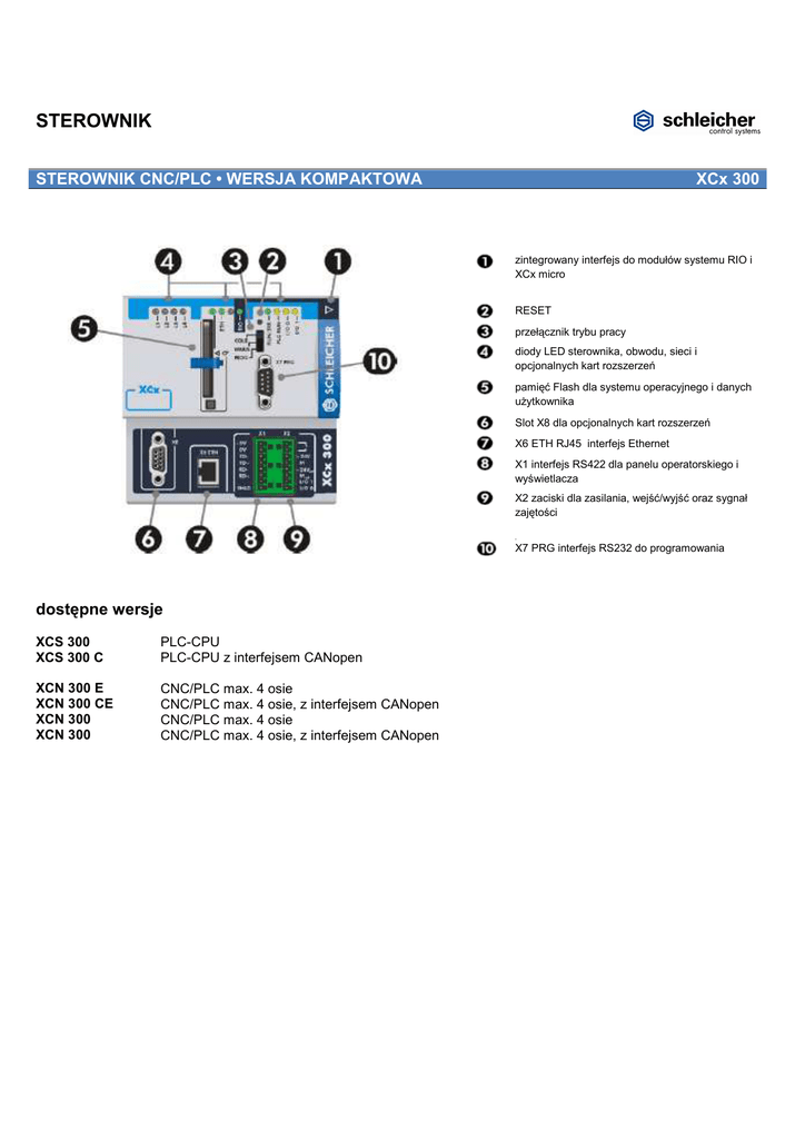 STEROWNIK STEROWNIK CNC/PLC • WERSJA KOMPAKTOWA XCx 300 zintegrowany interfejs do modułów systemu RIO i XCx micro RESET przełącznik trybu pracy diody LED sterownika, obwodu, sieci i opcjonalnych kart rozszerzeń pamięć Flash dla systemu operacyjnego i danych uŜytkownika Slot X8 dla opcjonalnych kart rozszerzeń X6 ETH RJ45 interfejs Ethernet X1 interfejs RS422 dla panelu operatorskiego i wyświetlacza X2 zaciski dla zasilania, wejść/wyjść oraz sygnał zajętości , X7 PRG interfejs RS232 do programowania dostępne wersje XCS 300 XCS 300 C PLC-CPU PLC-CPU z interfejsem CANopen XCN 300 E XCN 300 CE XCN 300 XCN 300 CNC/PLC max. 4 osie CNC/PLC max. 4 osie, z interfejsem CANopen CNC/PLC max. 4 osie CNC/PLC max. 4 osie, z interfejsem CANopen DANE TECHNICZNE XCS 300 nr artykułu sterownik R4.501.0060.0 XCS 300 C XCS 300 E XCS 300 CE XCN 300 XCN 300 C R4.501.0020.0 R4.501.0030.0 R4.501.0040.0 R4.501.0050.0 R4.501.0010.0 PLC CNC/PLC konfiguracja sprzętowa i pamięć procesor pamięć zegar rodzaj baterii czas działania baterii pamięć Flash (typ 2, zewnętrzna) Intel XScale PXA 210 ( 16 bitów, 200 MHz ) SD-RAM: 16 MB S-RAM: 512KB Flash (wewnętrzna): 2 MB zasilanie bateryjne, kalendarz z latami przestępnymi, dokładność 1s wanadowo-litowa 3V / 50 mAh min. 3 miesiące dla systemu operacyjnego i danych uŜytkownika od 16 MB do 1 GB właściwości CNC/PLC czas wykonania 1000 instrukcji czas rozprzestrzeniania sygnału bloki funkcyjne liczba osi / podsystemów cykl interpolacji CNC cykl bloku system operacyjny liczba zadań cykl wykonywania zadań pamięć flagi PLC zarządzanie pamięcią czas i licznik bit: ok. 0,8 ms bajt / Word / DWord: ok.0,5 ms 1 ms od wejścia do wyjścia przez interfejs XRIO kaŜda liczba z oprogramowania układowego i bloku funkcyjnego -/-/4/2 4/2 4/2 2 ms 2 ms 2 ms 2 ms 2 ms 2 ms VxWorks, wielozadaniowy system operacyjny ( czas / priorytet ) do 16 programowalny ≥ 1ms Dane: max. 16384 KB Program: 4096 KB Trwałe: 256 KB Nietrwałe: 2048 KB dynamiczne dowolna wartość z zakresu 1 ms…290 h 4/2 2 ms 2 ms oprogramowanie / szyna danych system operacyjny PLC system operacyjny CNC interfejs CANopen konfiguracja • • • • • • • • • • Multiprog (zgodnie z IEC 61131-3, zawiera serwer OPC) • (opcja) ProCANopen (konfigurator sieci CANopen) • (opcja) interfejs RS422 (X1) przerywane wejścia/wyjścia (X2) sygnał gotowości (X2) Ethernet (X6) RS232 (X7) slot na karty rozszerzeń (X8) XRIO interfejs panelu operatorskiego, 8-pin wtyczka 2 kombinacje kanałów (mogą być uŜyte jako we/wy), 8-pin wtyczka przekaźnik, wyzwalany przez STOP sterownika, na 8-pinowej wtyczce DC 24 V, max. 2A, ogólnego przeznaczenia, swobodny potencjał w stykach przekaźnika, normalnie otwarty struktura sieciowa, RJ45, 10 Mbit/s interfejs do programowania i diagnozowania, 9-pin wtyczka subminiaturowa slot na karty rozszerzeń przy CANopen zajęty przez moduł komunikacyjny CANopen dla we/wy 9-pin wtyczka subminiaturowa bezpośredni interfejs dla max. 8 RIO we/wy lub XCx micro modułów, max. 128 we/wy • • • DANE TECHNICZNE XCS 300 XCS 300 C XCS 300 E XCS 300 CE XCN 300 XCN 300 C tryby pracy typ przełącznika tryby pracy trójpołoŜeniowy PROG: PLC stop, tryb programowania WARM: PLC startuje z zapamiętanymi wartościami COLD: PLC startuje z wartościami początkowymi dla resetu sprzętowego wyłączenie zasilania, efektywny tylko w trybie PROG przycisk RESET obudowa, wymiary szerokość, wysokość, głębokość waga napięcie zasilania pobór mocy pobór prądu izolacja (od wewnętrznej elektroniki ) 125 x 125 x 129 mm 1,025 kg 24 V DC ± 20% tętnienie max. 5% max. 40 W max. 4,5 A (łącznie z cyfrowymi we/wy) X1 (RS422): tak X2 (cyfrowe we/wy): tak X6 ETH (Ethernet): tak X7 PRG (RS232): nie X8 (wolny slot): tak max. 40 W wyświetlacz LED L1, L2, L3, L4 CF zielone, zał. czerwone, zał. ETH zielone, migające czerwone, zał. RIO zielone, zał. zielone, migające czerwone, zał. Ŝółte, zał. RUN/ERR zielone, zał. czerwone, zał. czerwone, migające wył. PLC RUN Ŝółte, zał. Ŝółte, migające wył. I/O 1 I/O 2 Ŝółte, zał. wył. zarezerwowane dla modułów rozszerzeń Pamięć Flash dostęp do pamięci błąd dostępu sieć Ethernet dostęp do pamięci brak połączenia połączenie z systemem RIO praca gotowy do działania błąd szyny błąd ramki stan CPU poprawne zasilanie, Ŝadnych błędów CPU nie pracuje (watchdog) CPU wykrył błąd brak napięcia zasilania tryb pracy PLC PLC działa PLC działa, wyjścia zresetowane (gotowe do działania) PLC stop przerwanie we/wy we/wy ustawione we/wy nieustawione
