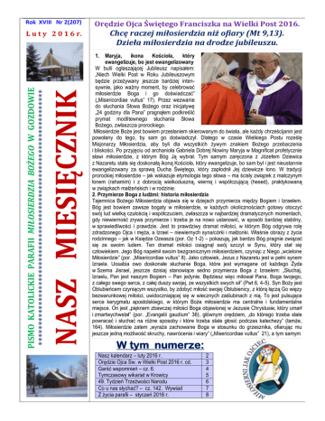 Rok XVIII Nr 2(207) L u t y 2 0 1 6 r. Orędzie Ojca Świętego Franciszka na Wielki Post 2016. Chcę raczej miłosierdzia niż ofiary (Mt 9,13). Dzieła miłosierdzia na drodze jubileuszu. NASZ MIESIĘCZNIK PISMO KATOLICKIE PARAFII MIŁOSIERDZIA BOŻEGO W GOZDOWIE **************************************************************** _______________________________________________________________________________________________________________________________________________________________________________________________________________________________________________ _________________________________ 1. Maryja, ikona Kościoła, który ewangelizuje, bo jest ewangelizowany W bulli ogłaszającej Jubileusz napisałem: „Niech Wielki Post w Roku Jubileuszowym będzie przeżywany jeszcze bardziej intensywnie, jako ważny moment, by celebrować miłosierdzie Boga i go doświadczać” („Misericordiae vultus” 17). Przez wezwanie do słuchania Słowa Bożego oraz inicjatywę „24 godziny dla Pana” pragnąłem podkreślić prymat modlitewnego słuchania Słowa Bożego, zwłaszcza prorockiego. Miłosierdzie Boże jest bowiem przesłaniem skierowanym do świata, ale każdy chrześcijanin jest powołany do tego, by sam go doświadczył. Dlatego w czasie Wielkiego Postu roześlę Misjonarzy Miłosierdzia, aby byli dla wszystkich żywym znakiem Bożego przebaczenia i bliskości. Po przyjęciu od archanioła Gabriela Dobrej Nowiny Maryja w Magnificat profetycznie sławi miłosierdzie, z którym Bóg Ją wybrał. Tym samym zaręczona z Józefem Dziewica z Nazaretu stała się doskonałą ikoną Kościoła, który ewangelizuje, bo sam był i jest nieustannie ewangelizowany za sprawą Ducha Świętego, który zapłodnił Jej dziewicze łono. W tradycji prorockiej miłosierdzie – jak wskazuje etymologia tego słowa – ma ścisły związek z matczynym łonem (rahamim) i z dobrocią wielkoduszną, wierną i współczującą (hesed), praktykowaną w związkach małżeńskich i w rodzinie. 2. Przymierze Boga z ludźmi: historia miłosierdzia Tajemnica Bożego Miłosierdzia objawia się w dziejach przymierza między Bogiem i Izraelem. Bóg jest bowiem zawsze bogaty w miłosierdzie, w każdych okolicznościach gotowy otoczyć swój lud wielką czułością i współczuciem, zwłaszcza w najbardziej dramatycznych momentach, gdy niewierność zrywa przymierze i trzeba je na nowo ustanowić, w sposób bardziej stabilny, w sprawiedliwości i prawdzie. Jest to prawdziwy dramat miłości, w którym Bóg odgrywa rolę zdradzonego Ojca i męża, a Izrael – niewiernych syna/córki i małżonki. Właśnie obrazy z życia rodzinnego – jak w Księdze Ozeasza (por. Oz 1-2) – pokazują, jak bardzo Bóg pragnie związać się ze swoim ludem. Ten dramat miłości osiągnął swój szczyt w Synu, który stał się człowiekiem. Jego Bóg napełnił swoim bezgranicznym miłosierdziem, czyniąc z Niego „wcielone Miłosierdzie” (por. „Misericordiae vultus” 8). Jako człowiek, Jezus z Nazaretu jest w pełni synem Izraela. Uosabia owo doskonałe słuchanie Boga, które jest wymagane od każdego Żyda w Szema Jisrael, jeszcze dzisiaj stanowiące sedno przymierza Boga z Izraelem: „Słuchaj, Izraelu, Pan jest naszym Bogiem – Pan jedynie. Będziesz więc miłował Pana, Boga twojego, z całego swego serca, z całej duszy swojej, ze wszystkich swych sił” (Pwt 6, 4-5). Syn Boży jest Oblubieńcem czyniącym wszystko, by zdobyć miłość swojej Oblubienicy, z którą łączą Go więzy bezwarunkowej miłości, uwidoczniającej się w wiecznych zaślubinach z nią. To jest pulsujące serce kerygmatu apostolskiego, w którym Boże miłosierdzie ma centralne i fundamentalne miejsce. On jest „pięknem zbawczej miłości Boga objawionej w Jezusie Chrystusie, który umarł i zmartwychwstał” (por. „Evangelii gaudium” 36), głównym orędziem, „do którego trzeba stale powracać i słuchać na różne sposoby i które trzeba stale głosić podczas katechezy” (tamże, 164). Miłosierdzie zatem „wyraża zachowanie Boga w stosunku do grzesznika, ofiarując mu jeszcze jedną możliwość skruchy, nawrócenia i wiary” („Misericordiae vultus” 21), a tym samym _____________________________________________________________________________________________________________________________ _______________________________________________________________________ _________________________________________________________________________________________________________________________________________________________________________________________________________________________________ W tym numerze: Nasz kalendarz – luty 2016 r. Orędzie Ojca Św. w Wielki Post 2016 r. cd. Garść wspomnień – cz. 6. Tymczasowy wikariat w Krowicy 49. Tydzień Trzeźwości Narodu Co u nas słychać? – cz. 142. Wywiad Z życia parafii – styczeń 2016 r. 2 3 4 5 6 7 8 NASZ MIESIĘCZNIK Rok XVIII Nr 2(207) NASZ KALENDARZ - L U T Y 2016 INTENCJA POWSZECHNA: Abyśmy opiekowali się światem stworzonym, który otrzymaliśmy jako bezinteresowny dar, żeby go pielęgnować i chronić dla przyszłych pokoleń. INTENCJA EWANGELIZACYJNA: 1. Poniedziałek. Dzień powszedni Czyt. Ml 3,1-4 lub Hbr 2,14-18; Łk 2,22-40 Zbiórka do puszek na zakony klauzurowe Aby wzrastały szanse na dialog i spotkanie wiary chrześcijańskiej ludów Azji. Dziś Mszy św. błogosławieństwo chleba, wody i soli . Odwiedziny chorych od godz. 13.00 O Polskę wierną Bogu, Krzyżowi i Ewangelii i wypełnienie Jasnogórskich Ślubów Narodu. +Henryk Grzesik 1999 2. WTOREK. ŚWIĘTO OFIAROWANIA PAŃSKIEGO INTENCJA ZA OJCZYZNĘ: 3. Środa. Dzień powszedni 4. I Czwartek miesiąca. Dzień powszedni 5. I Piątek miesiąca. Wspomnienie św. Agaty, męczennicy 6. I Sobota miesiąca. Wspomnienie śś. męczenników: Pawła Miki i Tow. W Gozdowie Apel Jasnogórski o godz. 21.00 +Łukasz Szymko 2010 +Józef Turowski 2015 ******************** WYDARZENIE MIESIĄCA 7. V 