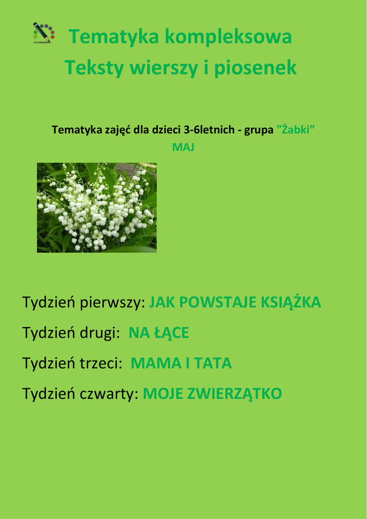 Tematyka kompleksowa Teksty wierszy i piosenek Tematyka zajęć dla dzieci 3-6letnich - grupa "Żabki” MAJ Tydzień pierwszy: JAK POWSTAJE KSIĄŻKA Tydzień drugi: NA ŁĄCE Tydzień trzeci: MAMA I TATA Tydzień czwarty: MOJE ZWIERZĄTKO PIOSENKA „ŁĄKA” 1. Na wiosennej łące tańczyły zające, po trawie skakały z łąką się witały. Witały ślimaka, motyla i szpaka, żabę, kreta, muchę, mrówkę i ropuchę. Ref.: Hej, ha, raz, dwa, trzy, z zajączkami zatańcz ty! Hej, ha, raz, dwa, trzy, z zajączkami tańcz i ty. 2. Na wiosennej łące tańczyły zające, po trawie skakały kwiatki oglądały. Oglądały bratki, fiołki i bławatki , mlecze i rumianek przez calutki ranek. Ref.: Hej, ha, raz, dwa, trzy,… PIOSENKA „Moja wesoła rodzinka” 1. My rodzinę dobrą mamy, zawsze razem się trzymamy! I choć czasem czas nas goni, My jak palce jednej dłoni! ref: Mama, tata, siostra, brat I ja – to mój mały świat! Dużo słońca, czasem grad – To wesoły jest mój świat! 2. Mama zawsze kocha czule, ja do mamy się przytulę, w bólu, żalu i rozterce, bo mam mama wielkie serce! ref: Mama, tata, siostra, brat To wesoły jest mój świat! 3. Gdy napsocę i nabroję, stoję w kącie, bo się boję! Tata skarci, pożałuje, a mamusia pocałuje! ref: Mama, tata, siostra, brat 4. Kiedy nie mam taty, mamy, wszyscy sobie pomagamy! I choć sprzątać nie ma komu, jest wesoło w naszym domu! ref: Mama, tata, siostra, brat UCZUMY SIĘ WIERSZA: ”Szczeniątka” Ewa Szelburg- Zarębinna Bez liku jest szczeniąt w koszyku. Jedno - podobne do matki. Drugie - w białe łatki. Trzecie - czarne jak wrona. Czwarte - bez ogona. Podpalanych dwoje. A ostatnie, to najmniejsze, ono... będzie moje!
