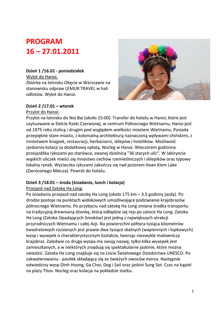 PROGRAM 16 – 27.01.2011 Dzień 1 /16.01 - poniedziałek Wylot do Hanoi. Zbiórka na lotnisku Okęcie w Warszawie na stanowisku odpraw LEMUR TRAVEL w hali odlotów. Wylot do Hanoi. Dzień 2 /17.01 – wtorek Przylot do Hanoi. Przylot na lotnisko do Noi Bai (około 15:00). Transfer do hotelu w Hanoi, które jest usytuowane w Delcie Rzeki Czerwonej, w centrum Północnego Wietnamu. Hanoi jest od 1975 roku stolicą i drugim pod względem wielkości miastem Wietnamu. Posiada przepiękne stare miasto, z kolonialną architekturą naznaczoną wpływami chińskimi, z mnóstwem knajpek, restauracji, herbaciarni, sklepów i hotelików. Możliwość zjedzenia kolacji za dodatkową opłatą. Nocleg w Hanoi. Wieczorem godzinna przejażdżka rykszami po starówce, zwanej dzielnicą "36 starych ulic". W labiryncie wąskich uliczek mieści się mnóstwo cechów rzemieślniczych i sklepików oraz typowy lokalny rynek. Wycieczka rykszami zakończy się nad jeziorem Hoan Kiem Lake (Zwróconego Miecza). Powrót do hotelu. Dzień 3 /18.01 – środa (śniadanie, lunch i kolacja) Przejazd nad Zatokę Ha Long. Po śniadaniu przejazd nad zatokę Ha Long (około 175 km – 3.5 godziny jazdy). Po drodze postoje na punktach widokowych umożliwiające podziwianie krajobrazów północnego Wietnamu. Po przybyciu nad zatokę Ha Long zmiana środka transportu na tradycyjną drewnianą dżonkę, którą odbędzie się rejs po zatoce Ha Long. Zatoka Ha Long (Zatoka Opadających Smoków) jest jedną z największych atrakcji przyrodniczych Wietnamu i całej Azji. Na powierzchni półtora tysiąca kilometrów kwadratowych rozsianych jest prawie dwa tysiące skalnych (wapiennych i łupkowych) wysp i wysepek o charakterystycznym kształcie, tworząc niezwykle malowniczy krajobraz. Zaledwie co druga wyspa ma swoją nazwę, tylko kilka wysepek jest zamieszkanych, a w niektórych znajdują się spektakularne jaskinie, które można zwiedzić. Zatoka Ha Long znajduje się na Liście Światowego Dziedzictwa UNESCO. Po zakwaterowaniu - posiłek składający się ze świeżych owoców morza. Następnie odwiedziny wysp Dinh Huong, Ga Choi, Dog i Sail oraz jaskini Sung Sot. Czas na kąpiel na plaży Titov. Nocleg oraz kolacja na pokładzie statku. 1 Dzień 4 /19.01 – czwartek (śniadanie, lunch) Powrót do Hanoi. Po śniadaniu podziwianie wschodu słońca nad zatoką Ha Long. W trakcie rejsu oglądanie, powstałych w wyniku procesów krasowych, wysp. Zmiana środka transportu na bambusowe łódki. Przekąski. Po posiłku powrót na ląd. Po południu przejazd do Hanoi. W drodze powrotnej wizyta w jednej z lokalnych wiosek by obejrzeć występy tradycyjnego Wodnego Teatru Lalek. Będzie to typowa wioska położona w delcie Rzeki Czerwonej, z tradycyjną architekturą, świątyniami oraz przyjaznymi ludźmi. Oprócz przedstawienia zwiedzanie grobowca mandaryna, który zapoczątkował teatr lalek w wiosce, odwiedziny jednego z lokalnych domów, będzie to też świetna okazja by porozmawiać z mieszkańcami i zobaczyć jak żyją (jest to niekomercyjne miejsce, z rzadka odwiedzane przez turystów. Opcjonalnie będzie można spotkać lokalnego bohatera, który zestrzelił podczas wojny kilka amerykańskich samolotów B52). Transfer do Hanoi. Zakwaterowanie w hotelu w Hanoi. Wieczorem czas wolny. Dzień 5 /20.01 – piątek (śniadanie, lunch i kolacja) Transfer do Hagiang. Śniadanie. Transfer z Hanoi do Hagiang, drogą wiodącą przez malownicze tereny północnego Wietnamu. Po drodze postoje na punktach widokowych oraz na lunch. Czas trwania przejazdu to około 7 godzin. Po przyjeździe do Hagiang zakwaterowanie w hotelu. Czas wolny. Dzień 6 /21.01 – sobota (śniadanie, lunch i kolacja) Plemiona górskie Śniadanie. Przejazd przez przełęcz Quan Ba do małych wspólnot zamieszkujących prowincję Yen Minh. Droga oferuje zapierające dech w piersiach krajobrazy, dla których warto jest zdobyć się na trudy podróży. Po drodze postój na lokalnym targowisku w Quyet Tien, następnie przejazd do Na Khe, skąd spacer w dół doliny, aby odwiedzić wioskę zamieszkałą przez Dao Lantien. Wizyta w wiosce jest świetną okazją, aby poznać kulturę tego plemienia oraz wietnamski szamanizm. Przejazd do Yen Minh na lunch. Po południu odwiedziny starej wioski zamieszkałej przez Białych Hmongów w Pho Cao. Następnie spotkanie z jedną z najrzadziej występujących grup etnicznych na północy - plemię LoLo. Po drodze postój na punkcie widokowym, dający możliwość zrobienia zdjęć głębokiej doliny, ze stoku Chin Khoanh („9 zakrętów”) oraz obejrzenia pałacu Króla Hmongów. Transfer do Dong Van. 2 Dzień 57/22.01 – niedziela (śniadanie, lunch i kolacja) Lokalne targowiska Śniadanie. Rano odwiedziny niezwykle barwnego, lokalnego targowiska, znajdującego się w centrum miasta Dong Van (targ odbywa się raz w tygodniu). Następnie wjazd na górę Ma Pi Leng, skąd rozpościera się panorama na góry północnego Wietnamu. Kolejny punkt programu to Meovac, gdzie znajduje się największe targowisko w Wietnamie. Przejazd do YenMinh na lunch. Po południu zwiedzanie wioski Lung Tam, która słynie z ręcznego tkania lnu. Przejazd do Hagiang. Zakwaterowanie w domu należącym do plemienia Tay - wioska Me (czysta pościel, wspólna łazienka). Po zakwaterowaniu spacer po wiosce. Kolacja. Nocleg. Dzień 8/23.01 – poniedziałek (śniadanie, lunch) Transfer powrotny do Hanoi, przelot do Hue Śniadanie. Krótki spacer po wiosce. Transfer z Hagiang do Hanoi. Przelot do Hue. Transfer do hotelu. Zakwaterowanie. Wieczorem czas wolny. Dzień 9 /24.01 – wtorek (śniadanie, lunch) Hue-Hoi An Po śniadaniu wycieczka łodzią po Perfumowanej Rzece. W trakcie wycieczki zwiedzanie Pagody Niebiańskiej Pani (Thien Mu), usytuowanej na brzegu rzeki. Jest to najstarsza pagoda w mieście. Następnie - Cesarskej Cytadeli, będącej największą atrakcją miasta. Jest to, dawna siedziba władców Hue. Stanowi duży kompleks budynków z pał