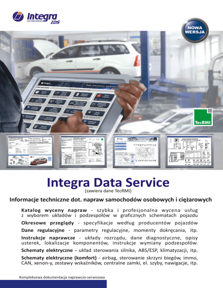 Kalkulacja naprawy Plan serwisowy Schemat ABS/ESP ABS/ESP Opel Opel Zafira Zafira Schemat Integra Data Service (zawiera dane TecRMI) Informacje techniczne dot. napraw samochodów osobowych i ciężarowych Katalog wyceny napraw - szybka i profesjonalna wycena usług z wyborem układów i podzespołów w graficznych schematach pojazdu Okresowe przeglądy - specyfikacje według producentów pojazdów Dane regulacyjne - parametry regulacyjne, momenty dokręcania, itp. Instrukcje naprawcze - układy rozrządu, dane diagnostyczne, opisy usterek, lokalizacje komponentów, instrukcje wymiany podzespołów. Schematy elektryczne - układ sterowania silnika, ABS/ESP, klimatyzacji, itp. Schematy elektryczne (komfort) - airbag, sterowanie skrzyni biegów, immo, CAN, xenon-y, zestawy wskaźników, centralne zamki, el. szyby, nawigacje, itp. Kompleksowa dokumentacja naprawczo-serwisowa Aktualne dane regulacyjne oraz informacje naprawcze są podstawą do szybkiej, efektywnej i profesjonalnej pracy każdego serwisu. W zakres programu Integra IDS wchodzą oryginalne dane z rynku motoryzacyjnego, które obejmują samochody osobowe, dostawcze i ciężarowe. Integra IDS zawiera cztery główne obszary informacji: Czasy napraw, Dane serwisowe, Dane techniczne, Instrukcje naprawcze. Okresowe przeglądy. Użytkowanie każdego samochodu wymaga jego okresowej obsługi, która powinna być wykonywana według zaleceń producenta pojazdu. Użytkownicy systemu mają dostęp do informacji dotyczących czynności serwisowych, jakie należy wykonać przy określonym przebiegu dla konkretnego samochodu. Dane obejmują również okresowe przeglądy. Czynności serwisowe można także rozszerzyć o dodatkowe prace zgłoszone indywidualnie przez klienta. Dzięki tego typu informacjom, warsztaty mogą przeprowadzać prace serwisowe zgodnie z zaleceniami producentów i oferować klientom okresową obsługę ich pojazdów na najwyższym poziomie. (Rys.1) Katalog wyceny napraw to moduł umożliwiający przygotowanie szybkiej wyceny naprawy z graficznym wyborem różnych układów i podzespołów pojazdu (Rys.2). Pomyłki przy podawaniu cen dotyczących wykonania danej usługi powodują konkretne straty dla każdego serwisu. Aby zapobiec takim sytuacjom potrzebne są sprawdzone informacje niezbędne do poprawnej kalkulacji prac warsztatowych. Zawarte czasy napraw są zgodne z informacjami producentów samochodów i uwzględniają indywidualne wyposażenie danej wersji pojazdu. Wycena naprawy uwzględnia wszystkie prace wchodzące w zakres danej usługi. Czynności serwisowo-naprawcze połączone są z numerami katalogowymi podzespołów pojazdu, co może być dużym ułatwieniem podczas korzystania z elektronicznych katalogów części zamiennych. Wiarygodna wycena usługi ma bardzo duży wpływ na profesjonalną obsługę klientów każdego serwisu. Dane regulacyjne to zbiór informacji o parametrach i danych regulacyjnych różnych układów pojazdu. Łatwy dostęp do wszystkich potrzebnych danych oraz szeroki zakres dodatkowych rysunków zapewnia pracownikom serwisu szybkie i sprawne przeprowadzenie niezbędnych czynności regulacyjno-kontrolnych. Omawiane dane zawierają m.in.: ogólne dane techniczne pojazdu, parametry układu zasilania paliwem (Benzyna/Diesel), dane układu zapłonowego, wartości kontrolne spalin, wymiary podwozia wraz z geometrią kół, parametry układu hamulcowego, momenty dokręcania śrub, pojemności układów, specyfikację olejów i smarów oraz dane układu elektrycznego pojazdu. (Rys.3) Instrukcje naprawcze zawierają wiele informacji serwisowych dotyczących diagnostyki, mechaniki oraz układu elektrycznego pojazdu. Instrukcje są czytelne i łatwe w użyciu podczas napraw serwisowych. Obejmują one szeroki zakres informacji m.in.: schematy, ilustracje graficzne, instrukcje demontażu i montażu różnych układów rozrządu oraz elementów podwozia, instrukcje wymiany filtrów kabinowych, opisy zewnętrznej części karoserii, metody kasowania wskaźników okresowych przeglądów, instrukcje identyfikacji pojazdu oraz opisy kodów błędów. (Rys.4) Oprogramowanie umożliwia drukowanie kosztorysów napraw, które uwzględniają wartość robocizny oraz potrzebne części do wykonania danej naprawy. Moduł Dane Serwisowe umożliwia drukowanie kart przeglądów okresowych pojazdu. Na kartach wyszczególnione są prace wykonywane przez serwisanta przy danym przebiegu lub po określonym czasie zalecanym przez producenta samochodu. (Rys.1 i 2) Diagnostyka układów. Jest to element modułu Podręczniki Techniczne, który został rozszerzony o dane diagnostyczne dotyczące elementów odpowiedzialnych za prawidłową pracę silnika wybranych pojazdów. Informacje zawarte w module umożliwiają szybką lokalizację czujników oraz osprzętu silnika. Informacje diagnostyczne wielu elementów przedstawione są pod postacią instrukcji krokowych, dzięki czemu można w szybki sposób zweryfikować poprawność działania danego podzespołu. (Rys.5) Układy klimatyzacji. Integra Data Service zawiera informacje techniczne dotyczące obsługi i naprawy układów klimatyzacji wraz ze schematami elektrycznymi tych systemów. Dokumentacja zawiera również dane techniczne dotyczące pojemności układów oraz zastosowanego środka chłodniczego i oleju. Informacje te są niezbędne przy serwisowaniu i naprawie układów klimatyzacji. Skrzynki bezpiecznikowe i przekaźnikowe. Zawarte w module dane zawierają informacje dotyczące skrzynek bezpiecznikowych oraz przekaźników. Zamieszczone rysunki przedstawiają miejsce zamontowania w samochodzie danej skrzynki oraz dokładny opis poszczególnych bezpieczników. (Rys.8) Schematy elektryczne. Moduł zawiera m.in. schematy elektryczne układów: sterowania silnikiem, ABS/ASR/ESP, klimatyzacji. ( Rys.9) Rys.6 Układy Airbag. Jest to obszar, który zawiera instrukcje dotyczące montażu i demontażu elementów systemów airbag oraz dane na temat warunków bezpiecze