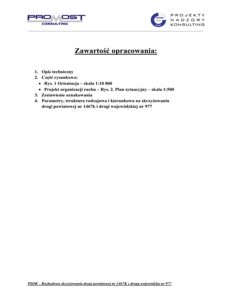 Zawartość opracowania: 1. Opis techniczny 2. Część rysunkowa: Rys. 1 Orientacja – skala 1:10 000 Projekt organizacji ruchu – Rys. 2. Plan sytuacyjny – skala 1:500 3. Zestawienie oznakowania 4. Parametry, struktura rodzajowa i kierunkowa na skrzyżowaniu drogi powiatowej nr 1467k i drogi wojewódzkiej nr 977 PSOR – Rozbudowa skrzyżowania drogi powiatowej nr 1467K z drogą wojewódzką nr 977 1. OPIS TECHNICZNY SPIS TREŚCI OPISU TECHNICZNEGO do projektu stałej organizacji ruchu 1. 2. 3. 4. 5. 6. PODSTAWA OPRACOWANIA ................................................................................................................... 3 PRZEDMIOT I CEL OPRACOWANIA ....................................................................................................... 4 STAN ISTNIEJĄCY ...................................................................................................................................... 6 STAN PROJEKTOWANY ............................................................................................................................ 7 TERMIN WPROWADZENIA ORGANIZACJI RUCHU .......................................................................... 11 OPIS PROJEKTOWANEJ ORGANIZACJI RUCHU ................................................................................. 11 PSOR – Rozbudowa skrzyżowania drogi powiatowej nr 1467K z drogą wojewódzką nr 977 1. PODSTAWA OPRACOWANIA Podstawą opracowania są następujące dokumenty: [1.] Umowa nr PZD/54/2013 z dnia 20.11.2013 r, zawarta pomiędzy Powiatowy Zarząd Drogowy w Gorlicach, a Promost Consulting T. Siwowski Spółka Jawna. [2.] Mapa do celów projektowych, opracowywana przez firmę Zespół Inżyniersko – Geodezyjny mgr inż. Bogusław Niedziela, grudzień 2013r. Pomiary i wizje lokalne w terenie, [3.] Rozporządzenie Ministra Transportu i Gospodarki Morskiej z dnia 2 marca 1999r. w sprawie warunków technicznych, jakim powinny odpowiadać drogi publiczne i ich usytuowanie (Dz. U. Nr 43, poz. 430), [4.] Rozporządzenie Rady Ministrów z dnia 24 stycznia 1986r. w sprawie wykonania niektórych przepisów ustawy o drogach publicznych (Dz. U. Nr 6, poz. 33, z późniejszymi zmianami), [5.] Rozporządzenie Ministra Infrastruktury z dnia 23 września 2003r. w sprawie szczegółowych warunków zarządzania ruchem na drogach oraz wykonywania nadzoru nad tym zarządzaniem (Dz. U. Nr 177 z 2003r., poz. 1729), [6.] Ustawa z dnia 20 czerwca 1997r. – Prawo o ruchu drogowym (Dz. U. z 2004r nr 108 poz. 908), [7.] Rozporządzenie Ministra Infrastruktury z dnia 3 lipca 2003r. w sprawie szczegółowych warunków technicznych dla znaków i sygnałów drogowych oraz urządzeń bezpieczeństwa ruchu drogowego i warunków ich umieszczania na drogach. PSOR – Rozbudowa skrzyżowania drogi powiatowej nr 1467K z drogą wojewódzką nr 977 2. PRZEDMIOT I CEL OPRACOWANIA Rozbudowywany odcinek drogi wojewódzkiej nr 977 relacji Tarnów – Konieczna zlokalizowany jest w południowo –wschodniej części województwa małopolskiego w gminie Gorlice i miasto Gorlice. Droga w całości znajduje się na terenie zabudowy jednorodzinnej. Inwestycja realizowana będzie w jednostce ewidencyjnej: Miasto Gorlice, obręb Stróżówka [nr 0003]; Gorlice, obręb Stróżówka [nr 0008]. Rozbudowywany odcinek droga powiatowej nr 1467K relacji Gorlice ul. Sikorskiego – Stróżówka rozdzielnia, zlokalizowana w południowo - wschodniej części województwa małopolskiego w gminie Gorlice i miasto Gorlice. Odcinek rozbudowywanej drogi w całości znajduje się na terenie zabudowy jednorodzinnej. Inwestycja realizowana będzie w jednostce ewidencyjnej: Miasto Gorlice, obręb Stróżówka [nr 0003]; Gorlice, obręb Stróżówka [nr 0008]. Cała inwestycja rozbudowy drogi powiatowej przebiega przez północno –zachodnią część miasta Gorlice oraz tereny Gminy Gorlice – miejscowość Stróżówka wg poniższej mapy. Droga stanowi połączenie istniejących ulic po tej stronie miasta w spójny układ komunikacyjny miasta. Powyższe widać na poniższej schematycznej orientacji (lokalizacja drogi powiatowej 1467K oznaczona czerwona ramką i na jej końcu DW977). DW 977 Rozbudowa obejmuje głównie: rozbudowę skrzyżowania drogi powiatowej nr 1467K z drogą wojewódzką nr 977 (budowa ronda); rozbudowę jezdni odcinków dróg powiatowej nr 1467K i wojewódzkiej nr 977w strefie skrzyżowania wraz z wykonaniem odcinkowego drenażu wzdłuż jezdni; budowę chodników; budowę i przebudowę zatoki autobusowej; PSOR – Rozbudowa skrzyżowania drogi powiatowej nr 1467K z drogą wojewódzką nr 977 przebudowę i budowę zjazdów; budowę ścian oporowych; przebudowę i budowę systemu odwodnienia drogi w postaci: rowów, ścieków prefabrykowanych oraz zabudowy rowów kanałami i kanalizacji deszczowej; budowa elementów odprowadzenia wód opadowych do odbiorników, zbiorników kanałowych retencyjnych; przebudowa, zabezpieczenie koryt odbiorników wód opadowych; zabezpieczenie i wzmocnienie skarp wykopów i nasypów wraz z odcinkowym drenażem; budowę i przebudowę zieleńców drogi (pobocza, skarpy teren do granicy pasa drogowego); przebudowę elementów zagospodarowania działek sąsiadujących z drogą (w liniach rozgraniczających teren inwestycji i wyznaczających teren niezbędny) wynikających z przebudowy sieci i zmiany ukształtowania wysokościowego i sytuacyjnego drogi; budowę przejść dla pieszych wraz z azylami; budowę oświetlenia ulicznego; przebudowę i zabezpieczenie infrastruktury technicznej kolidującej z przedmiotowym przedsięwzięciem; rozbiórka istniejących elementów zagospodarowania terenu kolidujących z inwestycją; wycinkę drzew i krzewów kolidujących z planowaną inwestycją; budowę budowli i urządzeń budowlanych związanych z drogą; wykonanie oznakowania pionowego i poziomego; wykonanie budowli i urządzeń budowlanych związanych z ochroną środowiska tj. urządzeń podczyszczających wody o