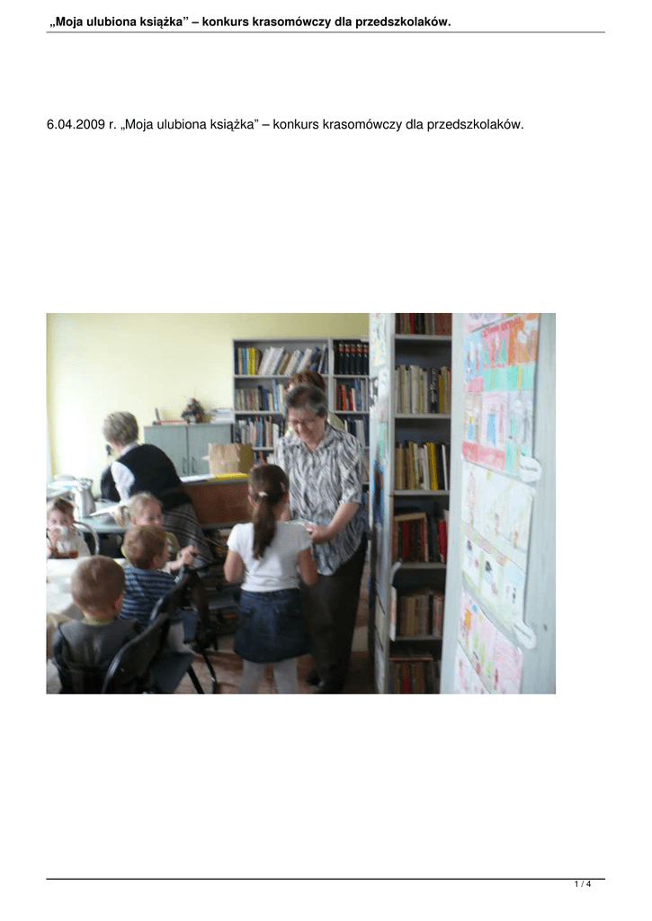 „Moja ulubiona książka” – konkurs krasomówczy dla przedszkolaków. 6.04.2009 r. „Moja ulubiona książka” – konkurs krasomówczy dla przedszkolaków. 1/4 „Moja ulubiona książka” – konkurs krasomówczy dla przedszkolaków. 2/4 „Moja ulubiona książka” – konkurs krasomówczy dla przedszkolaków. 3/4 „Moja ulubiona książka” – konkurs krasomówczy dla przedszkolaków. 4/4