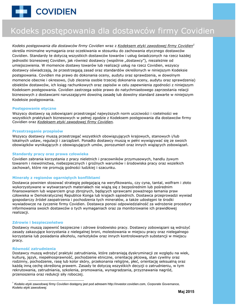 Kodeks postępowania dla dostawców firmy Covidien Kodeks postępowania dla dostawców firmy Covidien wraz z Kodeksem etyki zawodowej firmy Covidien1 określa minimalne wymagania oraz oczekiwania w stosunku do zachowania etycznego dostawców Covidien. Standardy te dotyczą wszystkich dostawców towarów i usług świadczonych na rzecz każdej jednostki biznesowej Covidien, jak również dostawcy (wspólnie „dostawcy”), niezależnie od umiejscowienia. W momencie dostawy towarów lub realizacji usług na rzecz Covidien, wszyscy dostawcy oświadczają, że przestrzegają zasad oraz standardów określonych w niniejszym Kodeksie postępowania. Covidien ma prawo do dokonania oceny, audytu oraz sprawdzenia, w dowolnym momencie obecnie i okresowo, (lub zlecenia osobie trzeciej dokonania oceny, audytu oraz sprawdzenia) obiektów dostawców, ich ksiąg rachunkowych oraz zapisów w celu zapewnienia zgodności z niniejszym Kodeksem postępowania. Covidien zastrzega sobie prawo do natychmiastowego zaprzestania relacji biznesowych z dostawcami naruszającymi dowolną zasadę lub dowolny standard zawarte w niniejszym Kodeksie postępowania. Postępowanie etyczne Wszyscy dostawcy są zobowiązani przestrzegać najwyższych norm uczciwości i rzetelności we wszystkich praktykach biznesowych w pełnej zgodzie z Kodeksem postępowania dla dostawców firmy Covidien oraz Kodeksem etyki zawodowej firmy Covidien. Przestrzeganie przepisów Wszyscy dostawcy muszą przestrzegać wszystkich obowiązujących krajowych, stanowych i/lub lokalnych ustaw, regulacji i zarządzeń. Ponadto dostawcy muszą w pełni wywiązywać się ze swoich obowiązków wynikających z obowiązujących umów, porozumień oraz innych wiążących zobowiązań. Standardy pracy oraz prawa człowieka Covidien zabrania korzystania z pracy nieletnich i pracowników przymusowych, handlu żywym towarem i niewolnictwa, niebezpiecznych i groźnych warunków i środowiska pracy oraz wszelkich zachowań, które nie promują godności ludzkiej i szacunku. Minerały z regionów ogarniętych konfliktami Dostawca powinien stosować strategię polegającą na weryfikowaniu, czy cyna, tantal, wolfram i złoto wykorzystywane w wytwarzanych materiałach nie wiążą się z bezpośrednim lub pośrednim finansowaniem lub wsparciem grup zbrojnych, będących sprawcami poważnego łamania praw człowieka w Demokratycznej Republice Konga lub krajach sąsiednich. Dostawca przeprowadzi wywiad gospodarczy źródeł zaopatrzenia i pochodzenia tych minerałów, a także udostępni te środki wywiadowcze na życzenie firmy Covidien. Dostawca ponosi odpowiedzialność za wdrożenie procedury informowania swoich dostawców o tych wymaganiach oraz za monitorowanie ich prawidłowej realizacji. Zdrowie i bezpieczeństwo Dostawcy muszą zapewnić bezpieczne i zdrowe środowisko pracy. Dostawcy zobowiązani są wdrożyć zasady zakazujące korzystania z nielegalnej broni, molestowania w miejscu pracy oraz nielegalnego korzystania lub posiadania alkoholu, narkotyków oraz innych kontrolowanych substancji w miejscu pracy. Równość zatrudnienia Dostawcy muszą wdrożyć praktyki zatrudniania, które zabraniają dyskryminacji ze względu na wiek, kulturę, język, niepełnosprawność, pochodzenie etniczne, orientację płciową, stan cywilny oraz rodzinny, pochodzenie, rasę lub kolor skóry, przekonania religijne, płeć, orientację seksualną oraz każdą inną cechę określoną prawem. Zasady te dotyczą wszystkich decyzji o zatrudnieniu, w tym rekrutowania, zatrudniania, szkolenia, promowania, wynagradzania, przyznawania nagród, przenoszenia oraz redukcji siły roboczej. 1 Kodeks etyki zawodowej firmy Covidien dostępny jest pod adresem http://investor.covidien.com, Corporate Governance, Kodeks etyki zawodowej. Maj 2015 Kodeks postępowania dla dostawców firmy Covidien ciąg dalszy Dotyczy dostawców ze Stanów Zjednoczonych W pełnym zakresie i bez jakichkolwiek wyłączeń wszyscy dostawcy powinni przestrzegać wytycznych przepisów Kodeksu Federalnego Stanów Zjednoczonych (41 CFR), par. 60–1.4(a), 60–300.5(a) i 60– 741.5(a). Przepisy te zabraniają dyskryminowania wykwalifikowanych osób ze względu na chroniony prawem status weterana lub niepełnosprawność, a także ze względu na rasę, kolor skóry, wyznanie, płeć, orientację seksualną, tożsamość płciową lub narodowość. Przepisy te wymagają ponadto, aby objęci nimi dostawcy podejmowali zdecydowane działania, polegające na zatrudnianiu i awansowaniu pracowników bez względu na ich rasę, kolor skóry, wyznanie, płeć, orientację seksualną, tożsamość płciową, narodowość, status weterana lub niepełnosprawność. Wszyscy dostawcy powinni także przestrzegać wytycznych przepisów Kodeksu Federalnego Stanów Zjednoczonych (29 CFR), część 471, załącznik A. Konflikt interesów Dostawcy muszą unikać wszystkich transakcji oraz relacji, które stanowią lub mogą stanowić konflikt interesów. Prezenty oraz rozrywka Dostawcy mogą wręczać pracownikom Covidien rozsądne i zwyczajowo przyjęte prezenty w ramach normalnego prowadzenia działalności pod warunkiem, że w żadnych okolicznościach niedozwolone jest niestosowne wynagradzanie. Ponadto dostawcy powinni unikać nadmiernego lub zbyt częstego wręczania prezentów pracownikom Covidien, w szczególności dostawcy powinni zapewnić, że wszystkie prezenty wręczane pracownikom Covidien nie będą postrzegane jako łapówka, zapłata lub inna próba zyskania przewagi mająca wpłynąć na decyzje o składaniu zamówienia lub dokonywaniu zakupów. Pracownikom Covidien nie wolno przyjmować ani wręczać prezentów o wartości powyżej 50 USD. Łapówki i amerykańska ustawa o zagranicznych praktykach korupcyjnych Zabrania się wręczania łapówek lub niewłaściwych płatności, niezależnie od tego, czy firma Covidien czerpie z nich korzyści bezpośrednio lub pośrednio. Łapówki obejmują: gotówkę, nielegalne p