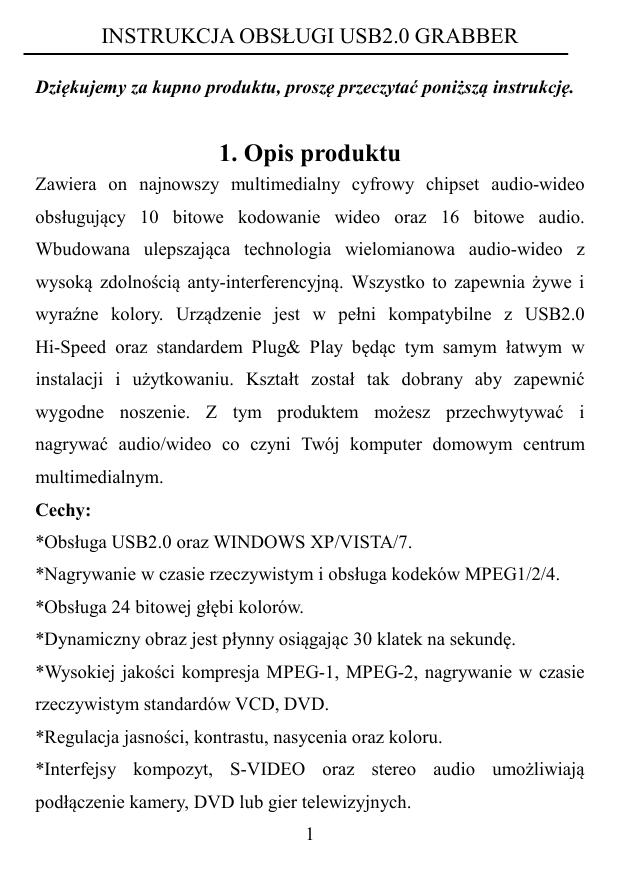 INSTRUKCJA OBSŁUGI USB2.0 GRABBER Dziękujemy za kupno produktu, proszę przeczytać poniższą instrukcję. 1. Opis produktu Zawiera on najnowszy multimedialny cyfrowy chipset audio-wideo obsługujący 10 bitowe kodowanie wideo oraz 16 bitowe audio. Wbudowana ulepszająca technologia wielomianowa audio-wideo z wysoką zdolnością anty-interferencyjną. Wszystko to zapewnia żywe i wyraźne kolory. Urządzenie jest w pełni kompatybilne z USB2.0 Hi-Speed oraz standardem Plug& Play będąc tym samym łatwym w instalacji i użytkowaniu. Kształt został tak dobrany aby zapewnić wygodne noszenie. Z tym produktem możesz przechwytywać i nagrywać audio/wideo co czyni Twój komputer domowym centrum multimedialnym. Cechy: *Obsługa USB2.0 oraz WINDOWS XP/VISTA/7. *Nagrywanie w czasie rzeczywistym i obsługa kodeków MPEG1/2/4. *Obsługa 24 bitowej głębi kolorów. *Dynamiczny obraz jest płynny osiągając 30 klatek na sekundę. *Wysokiej jakości kompresja MPEG-1, MPEG-2, nagrywanie w czasie rzeczywistym standardów VCD, DVD. *Regulacja jasności, kontrastu, nasycenia oraz koloru. *Interfejsy kompozyt, S-VIDEO oraz stereo audio umożliwiają podłączenie kamery, DVD lub gier telewizyjnych. 1 INSTRUKCJA OBSŁUGI USB2.0 GRABBER *Możliwość nagrywania audio i wideo, kopiowania do iPod’a i PSP. *iPod obsługuje format mp4, PSP obsługuje formaty mp4 oraz avc. Aplikacja *Elektroniczne zdjęcia, komputerowy fotograf. *Nagrywanie i edytowanie kreskówek audio-wideo. *Tworzenie VCD, DVD, tworzenie stron internetowych. Specyfikacja produktu *Obsługa kompresji MPEG 1/2. *29 klatek na sekundę przy rozdzielczości 720x480 (NTSC DVD), 25 klatek na sekundę przy rozdzielczości 720x576 (PAL DVD). *Obsługa USB oraz funkcji plug & play. *Obsługa nakładek. *Regulacja jasności, kontrastu, nasycenia oraz koloru. *Obsługa Windows XP/VISTA/7. *Obsługa standardu USB2.0 (Hi-Speed). 2. Wymagania systemowe *P4-2.8G lub szybszy *256MB pamięci lub więcej *Karta graficzna z obsługą Directx9.0C *Windows XP/VISTA/7 2 INSTRUKCJA OBSŁUGI USB2.0 GRABBER *Wolny port USB2.0 3. Zawartość opakowania *USB Grabber 1 sztuka *Instrukcja obsługi 1 sztuka *CD ze sterownikami i aplikacją 1 sztuka Uwaga: Powyższa lista jest tylko punktem odniesienia, jej zawartość może się zmienić bez powiadamiania. 4. Instalacja sterowników i aplikacji Uwaga: Przykład instalacja był przeprowadzany na angielskiej wersji systemu Windows XP, na innym systemie mogą występować drobne różnice. 4.1 Instalacja sterowników Kiedy włożysz USB GRABBER do gniazda USB system automatycznie wykryje nowy sprzęt i wyświetli poniższe okno, naciśnij “No, not this time” a następnie „Next”. Wybierz „Install from a list or specific location (Advanced)” i naciśnij „Next”: 3 INSTRUKCJA OBSŁUGI USB2.0 GRABBER Instalator poprosi Cię o wybranie opcji wyszukiwania sterowników. Zaznacz opcję jak na rysunku, gdzie wybrany folder powinien zawierać sterowniki z płyty CD, i naciśnij „Next”. Naciśnij „Continue Anyway” aby kontynuować. Naciśnij „Finish” aby zakończyć instalację sterowników. Po instalacji sterowników sprawdź czy “USB2.0 Video&Audio Caputure Device” znajduje się w menadżerze urządzeń. 4 INSTRUKCJA OBSŁUGI USB2.0 GRABBER Uwaga: Po instalacji sterowników zrestartuj komputer. 4.2 Instalacja aplikacji Uruchom plik SETUP.EXE na płycie CD, wybierz język i naciśnij „Next”, pojawi się następujące okno, na którym naciśnij „Next”. Wybierz “I accept the terms of the license agreement” i naciśnij “Next”: Naciśnij “Next”: 5 INSTRUKCJA OBSŁUGI USB2.0 GRABBER Naciśnij “Next”: Naciśnij “Next”: Gdy pojawi się następujące okno naciśnij „Finish”. 6 INSTRUKCJA OBSŁUGI USB2.0 GRABBER Naciśnij dwukrotnie na ikonie na pulpicie “honestech VHS to DVD 3.0”, otwórz plik „sn.txt”, przepisz klucz produktu do poniższego okna i naciśnij „OK * Po zakończeniu całej instalacji zrestartuj komputer. 5. Obsługa aplikacji W oknie głównym programu w zakładce „1. Capture” znajduje się okno sterowania nagrywaniem. Można tu ustawić czas nagrywania, włączyć opcję nagrywania na CD oraz rozpocząć nagrywanie. Po kliknięciu na przycisku „Option” możemy wybrać urządzenia nagrywające audio i wideo oraz interfejs, do którego jest podłączone urządzenie źródłowe po uprzednim kliknięciu przycisku „Setting”. W oknie „Video Setting” po naciśnięciu przycisku „Control” mamy możliwość ustawienia standardu wideo oraz zmianę parametrów obrazu. 7 INSTRUKCJA OBSŁUGI USB2.0 GRABBER W oknie „Option” możemy również wybrać format nagrania, standard wideo, jakość, rozmiar plików wynikowych oraz ścieżkę docelową do przechowywania nagrań. W zakładce „2. Edit” możemy zarządzać naszymi nagraniami oraz zaimportowanymi klipami filmowymi oraz zdjęciami. Do dyspozycji jest wiele opcji i filtrów łączenia osobnych klipów dając możliwość realizowania własnych produkcji. Zakładka „3. Burn” zawiera opcję dotyczące nagrywania klipów na płytę. Nasze projekty możemy zapisywać oraz otwierać za pomocą przycisku „Project” umieszczonego w lewym górnym rogu okna aplikacji. Dokładniejsze informacje dotyczące obsługi aplikacji zawarte są w pliku APPGRABBERV2_userguide.pdf umieszczonym na płycie CD. 8