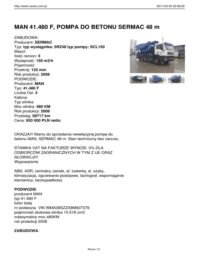 http://www.zanex.com.pl 2017-03-02 20:56:09 MAN 41.480 F, POMPA DO BETONU SERMAC 48 m ZABUDOWA: Producent: SERMAC Typ: typ wysięgnika: 5RZ48 typ pompy: SCL150 Maszt: Ilość ramion: 5 Wydajność: 150 m3/h Pojemność: Przekrój: 125 mm Rok produkcji: 2008 PODWOZIE: Producent: MAN Typ: 41.480 F Liczba Osi: 4 Kabina: Typ silnika: Moc silnika: 480 KM Rok produkcji: 2008 Przebieg: 59717 km Cena: 920 000 PLN netto OKAZJA!!! Mamy do sprzedania rewelacyjną pompę do betonu MAN, SERMAC 48 m. Stan techniczny bez zarzutu. STAWKA VAT NA FAKTURZE WYNOSI 0% DLA ODBIORCÓW ZAGRANICZNYCH W TYM Z UE ORAZ SŁOWACJI!!! Wyposażenie ABS, ASR, centralny zamek, el. lusterka, el. szyby, klimatyzacja, ogrzewanie postojowe, tachograf, wspomaganie kierownicy, bezwypadkowy PODWOZIE: producent MAN typ 41.480 F kolor biały nr podwozia VIN WMA39SZZX8M507379 pojemność skokowa silnika 10.518 cm3 maksymalna moc 480KM rok produkcji 2008 ZABUDOWA: Strona 1/2 http://www.zanex.com.pl 2017-03-02 20:56:09 producent SERMAC typ wysięgnika: 5RZ48 typ pompy: SCL150 nr pompy: 7732 dł. wysięgnika 48 m ilość ramion 5 wydajność 150 m3/h przekrój rurociągu 125 mm Ilość motogodzin: 1740 m/h sterowanie radiem zawieszenie kabiny na poduszkach zgłoszona do TDT Jeżeli jesteś zainteresowany zadzwoń: telefon kontaktowy: 601-534-540 Strona 2/2