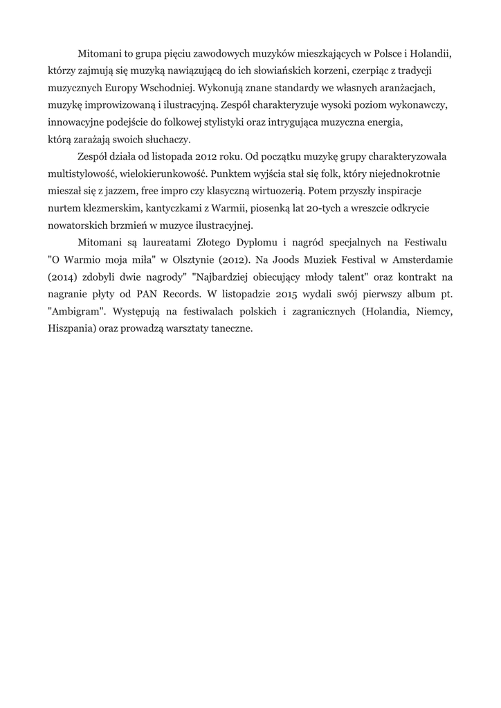 Mitomani to grupa pięciu zawodowych muzyków mieszkających w Polsce i Holandii, którzy zajmują się muzyką nawiązującą do ich słowiańskich korzeni, czerpiąc z tradycji muzycznych Europy Wschodniej. Wykonują znane standardy we własnych aranżacjach, muzykę improwizowaną i ilustracyjną. Zespół charakteryzuje wysoki poziom wykonawczy, innowacyjne podejście do folkowej stylistyki oraz intrygująca muzyczna energia, którą zarażają swoich słuchaczy. Zespół działa od listopada 2012 roku. Od początku muzykę grupy charakteryzowała multistylowość, wielokierunkowość. Punktem wyjścia stał się folk, który niejednokrotnie mieszał się z jazzem, free impro czy klasyczną wirtuozerią. Potem przyszły inspiracje nurtem klezmerskim, kantyczkami z Warmii, piosenką lat 20-tych a wreszcie odkrycie nowatorskich brzmień w muzyce ilustracyjnej. Mitomani są laureatami Złotego Dyplomu i nagród specjalnych na Festiwalu "O Warmio moja miła" w Olsztynie (2012). Na Joods Muziek Festival w Amsterdamie (2014) zdobyli dwie nagrody" "Najbardziej obiecujący młody talent" oraz kontrakt na nagranie płyty od PAN Records. W listopadzie 2015 wydali swój pierwszy album pt. "Ambigram". Występują na festiwalach polskich i zagranicznych (Holandia, Niemcy, Hiszpania) oraz prowadzą warsztaty taneczne.